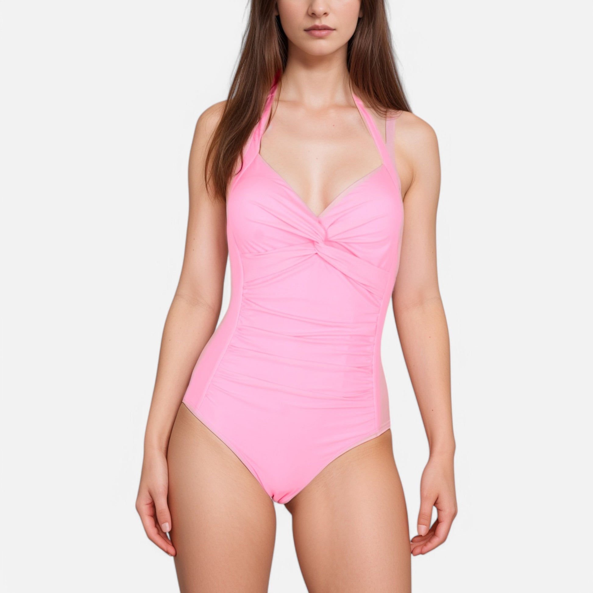 The Anna-Kaci Women's Twist Front One Piece Swimsuit combines classic elegance with body-flattering details. Designed with a plunging halter neckline and twist front bodice, this swimsuit enhances your natural shape while offering full support. The ruched front adds stylish texture and tummy control for a confident fit. Ideal for anyone seeking timeless swimwear with a feminine silhouette.