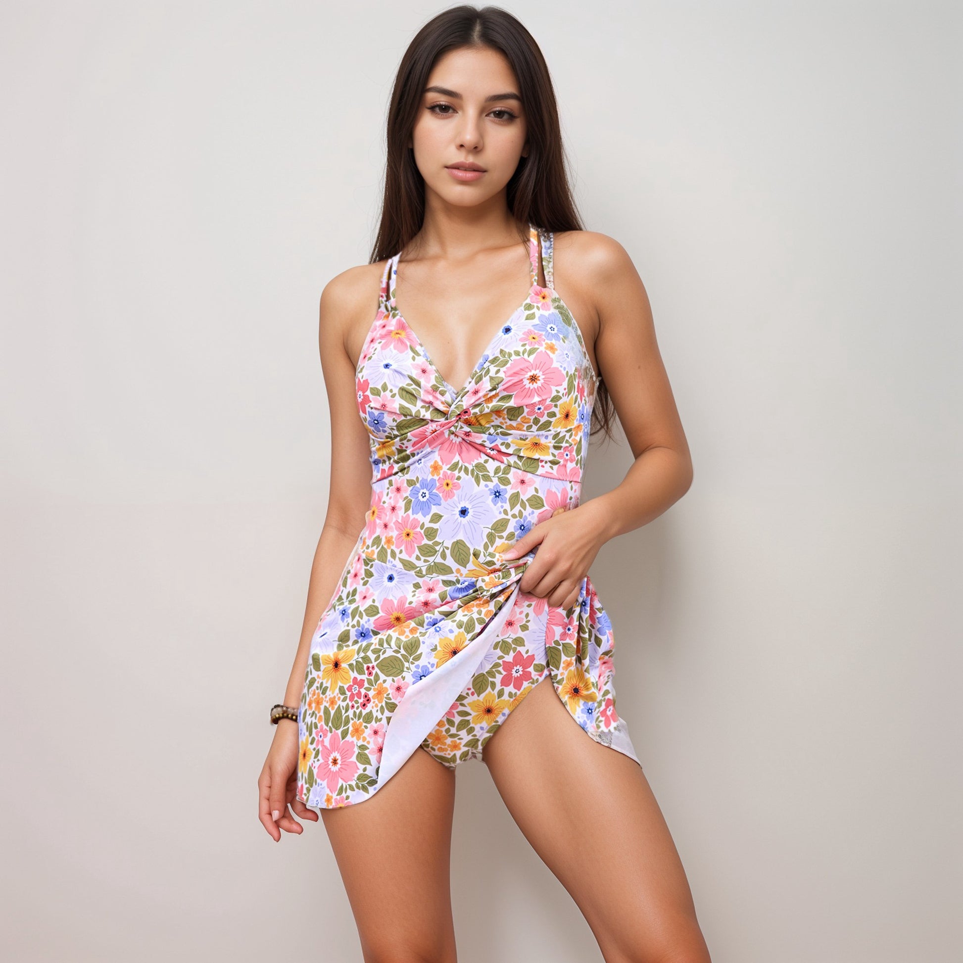 Anna-Kaci Swim Women's Floral Print One Piece Swim Dress with Ruched Bust and Adjustable Side Tie Skirt Overlay