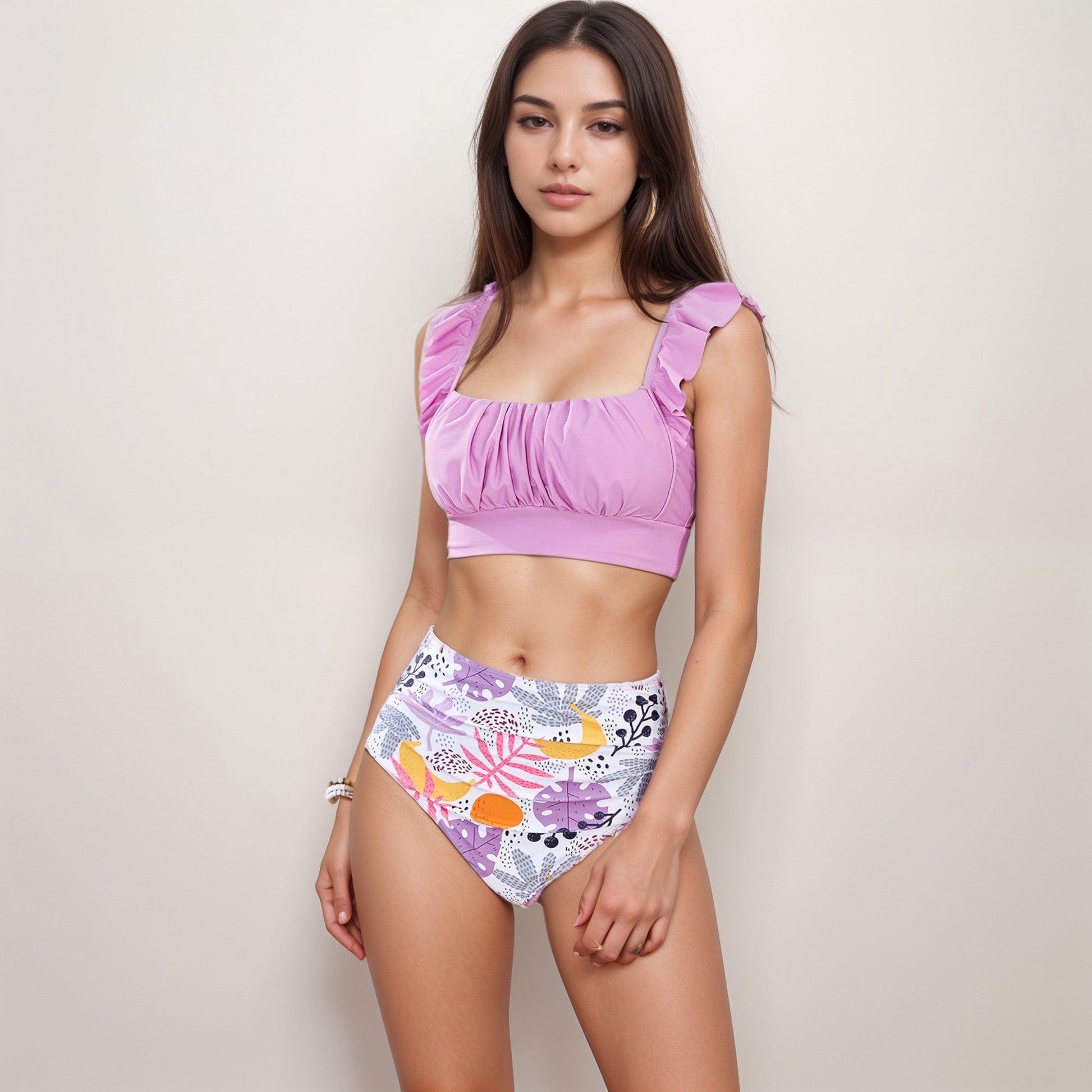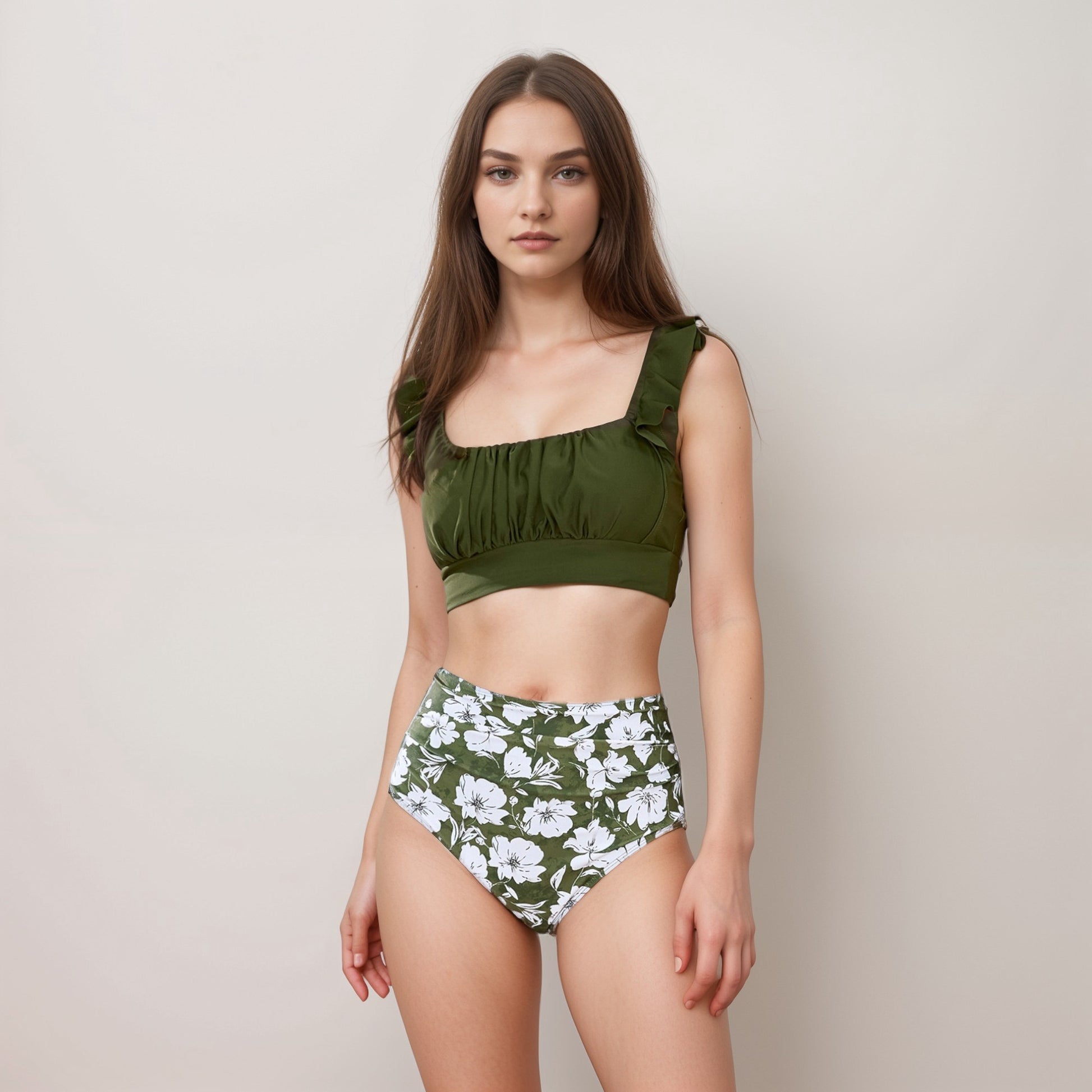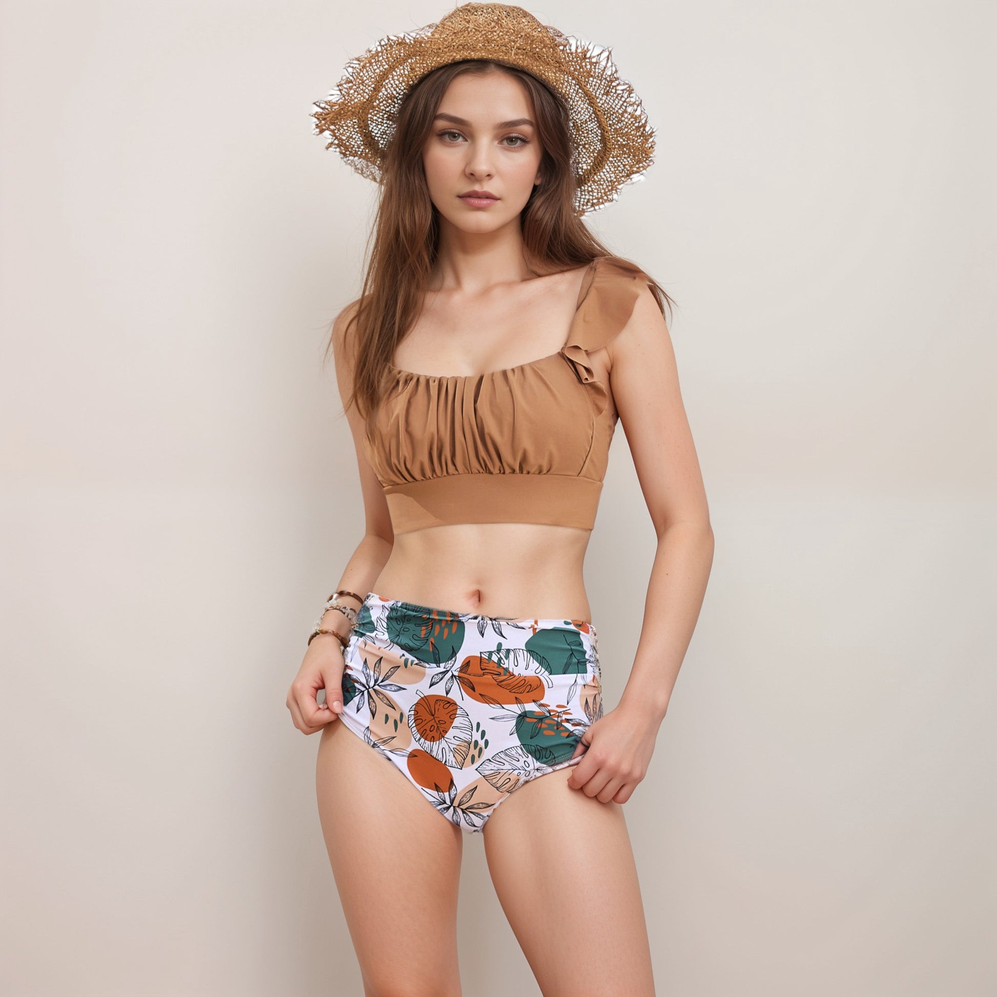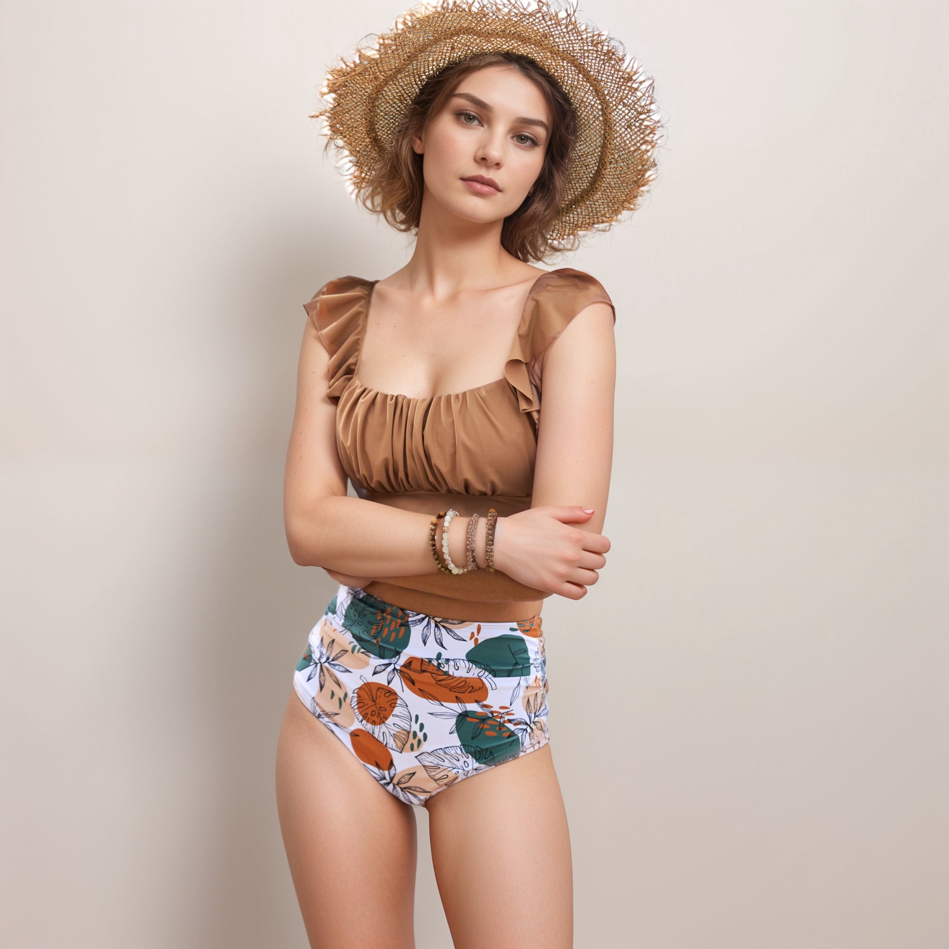 The Anna-Kaci Women's Ruffle Bikini Set pairs romantic details with a modern silhouette for a flattering beachwear look. The khaki-toned top features soft ruffles and ruched bust detailing for a charming, feminine touch. A supportive wide underband enhances comfort, while the high-waisted bottom in a bold leaf print offers full coverage with a playful pop of color. This set blends vintage flair with tropical vibes for your next sunny getaway.