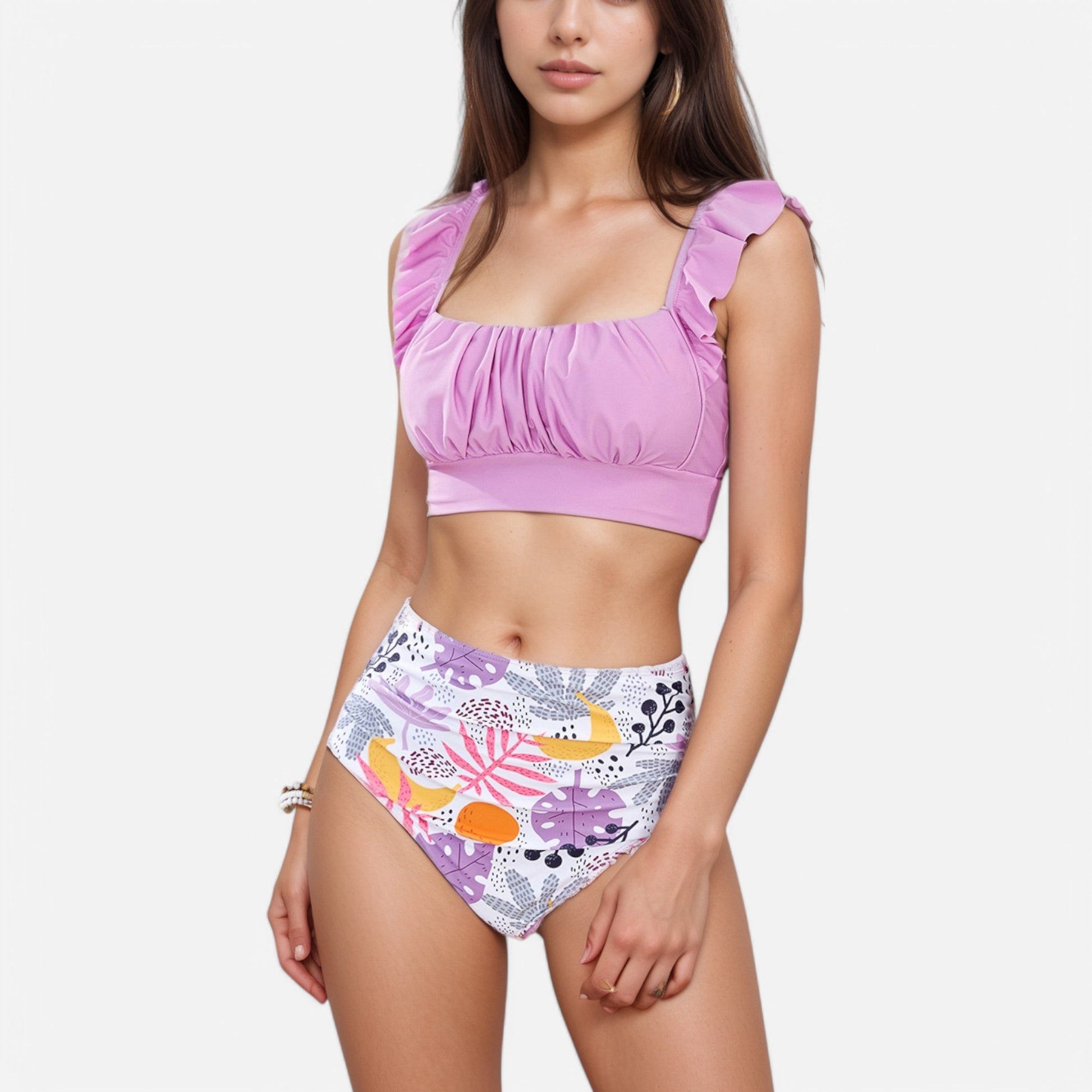 Anna-Kaci Swim Women's Ruffle Bikini Top with Ruched Bust Detail and High Waist Leaf Print Bottom Swimsuit Set