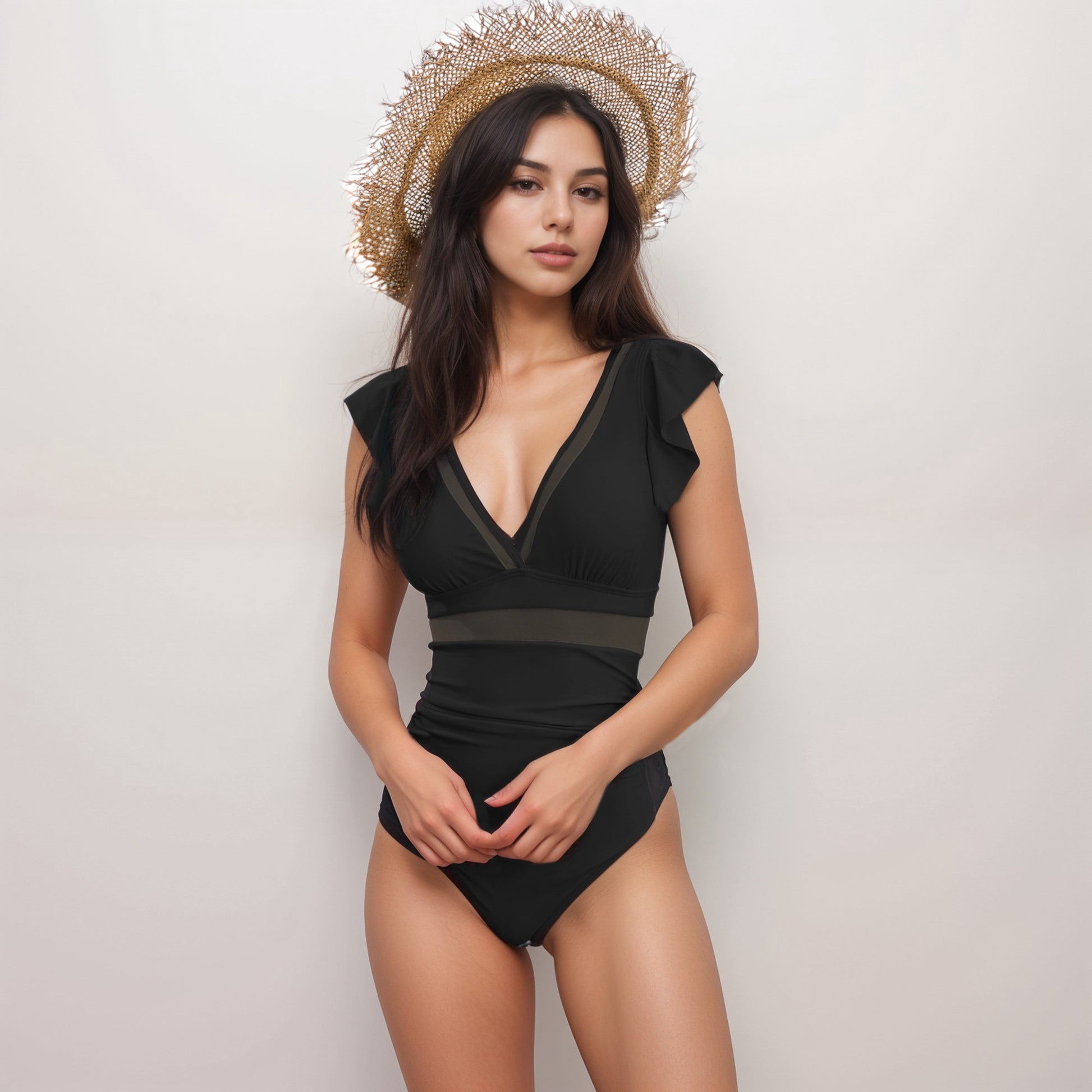 Anna-Kaci Swim Women's Ruffle Sleeve One Piece Swimsuit with Deep V-Neckline and Mesh Waist Detail
