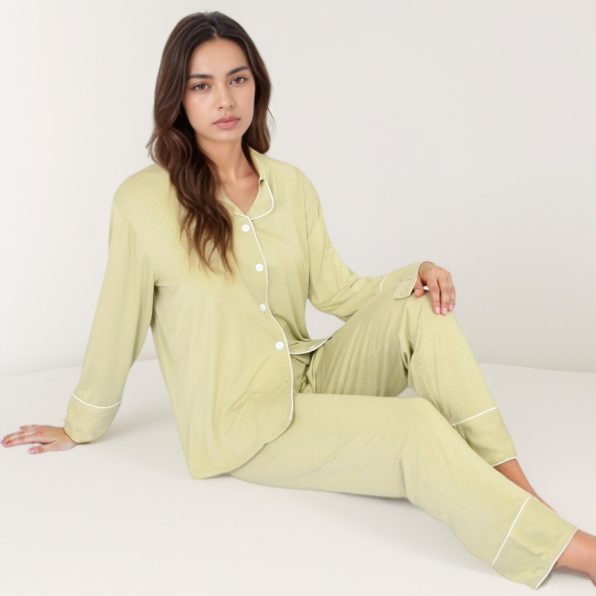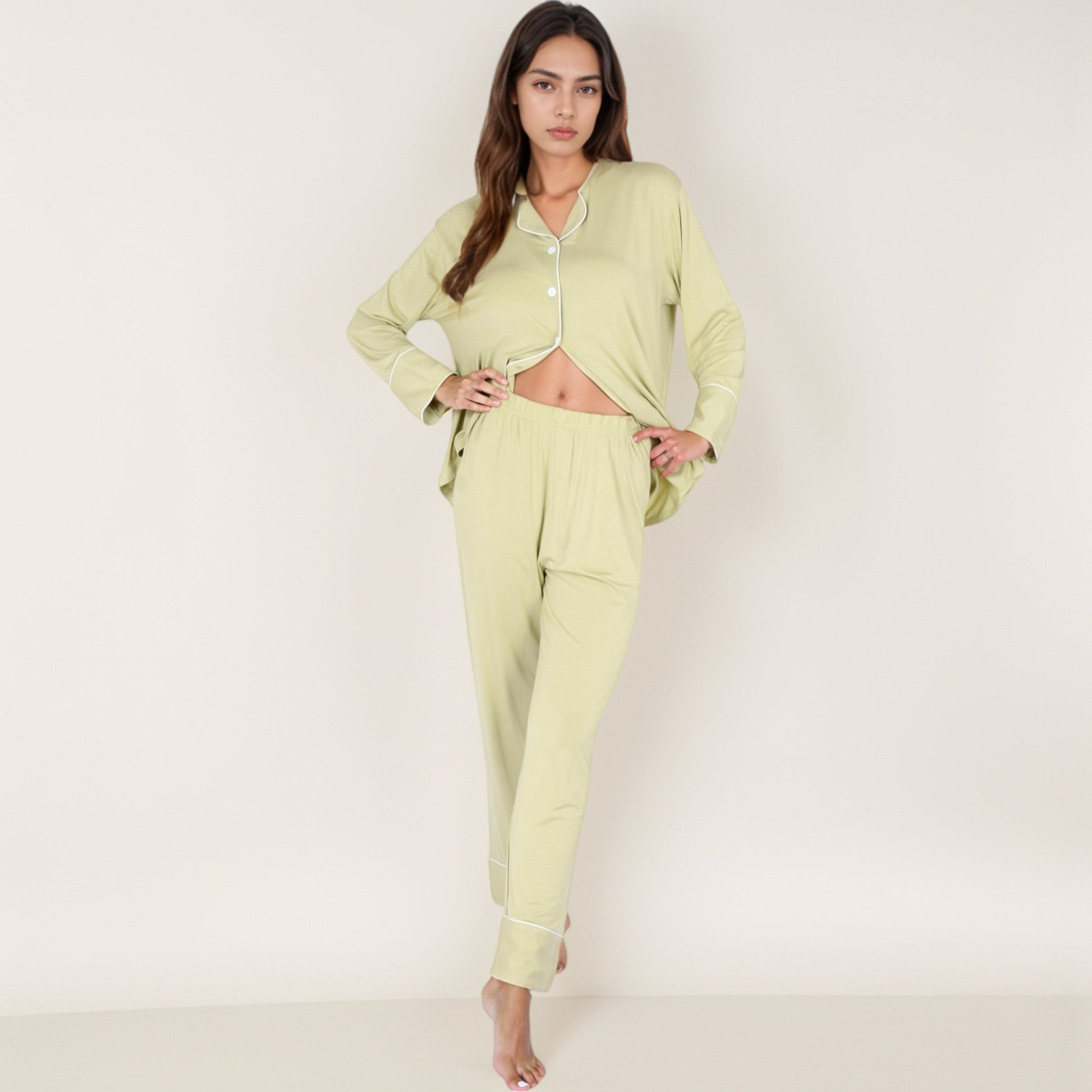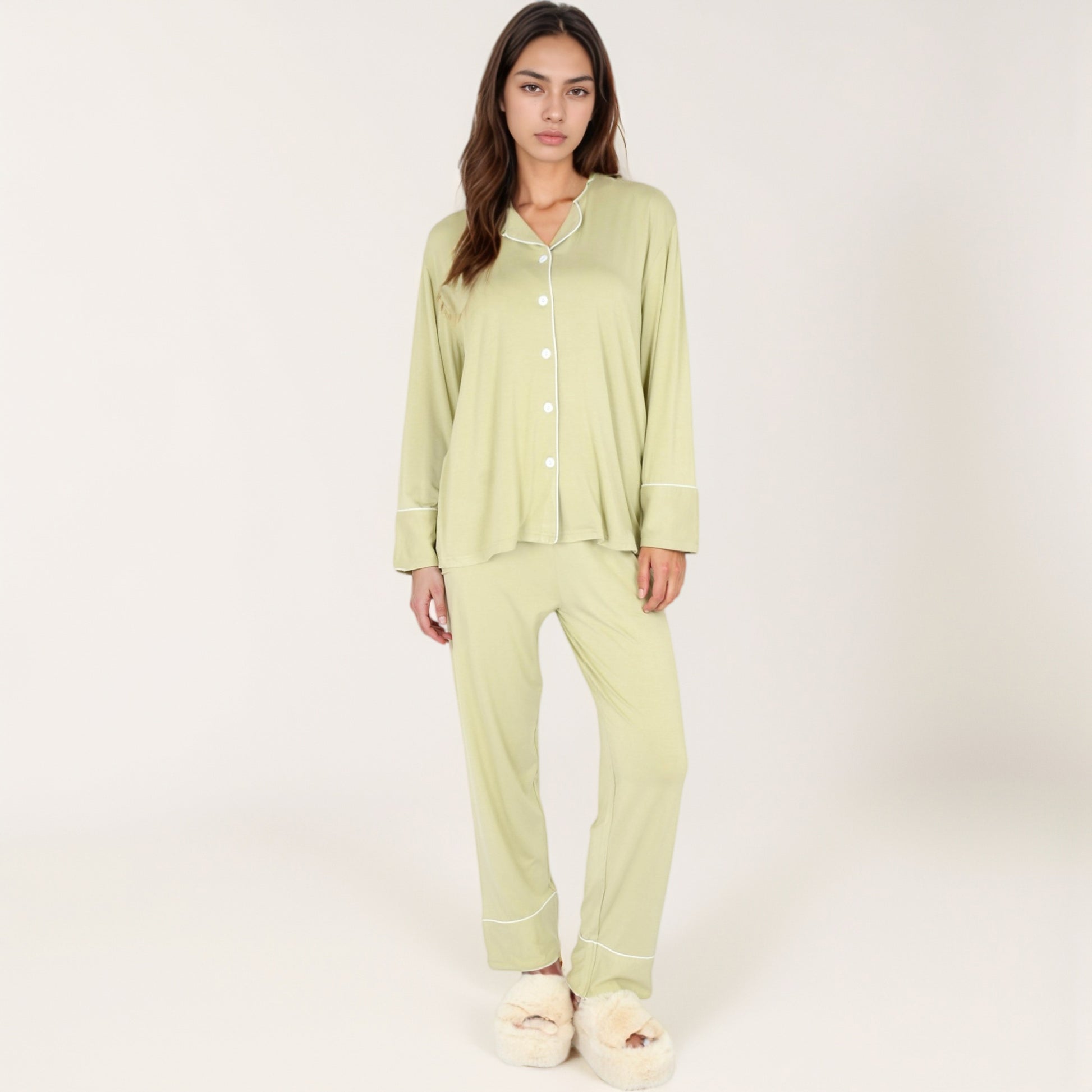 Anna-Kaci Lounge Women's Long Sleeve Button Front Pajama Set with Contrast Piping Trim