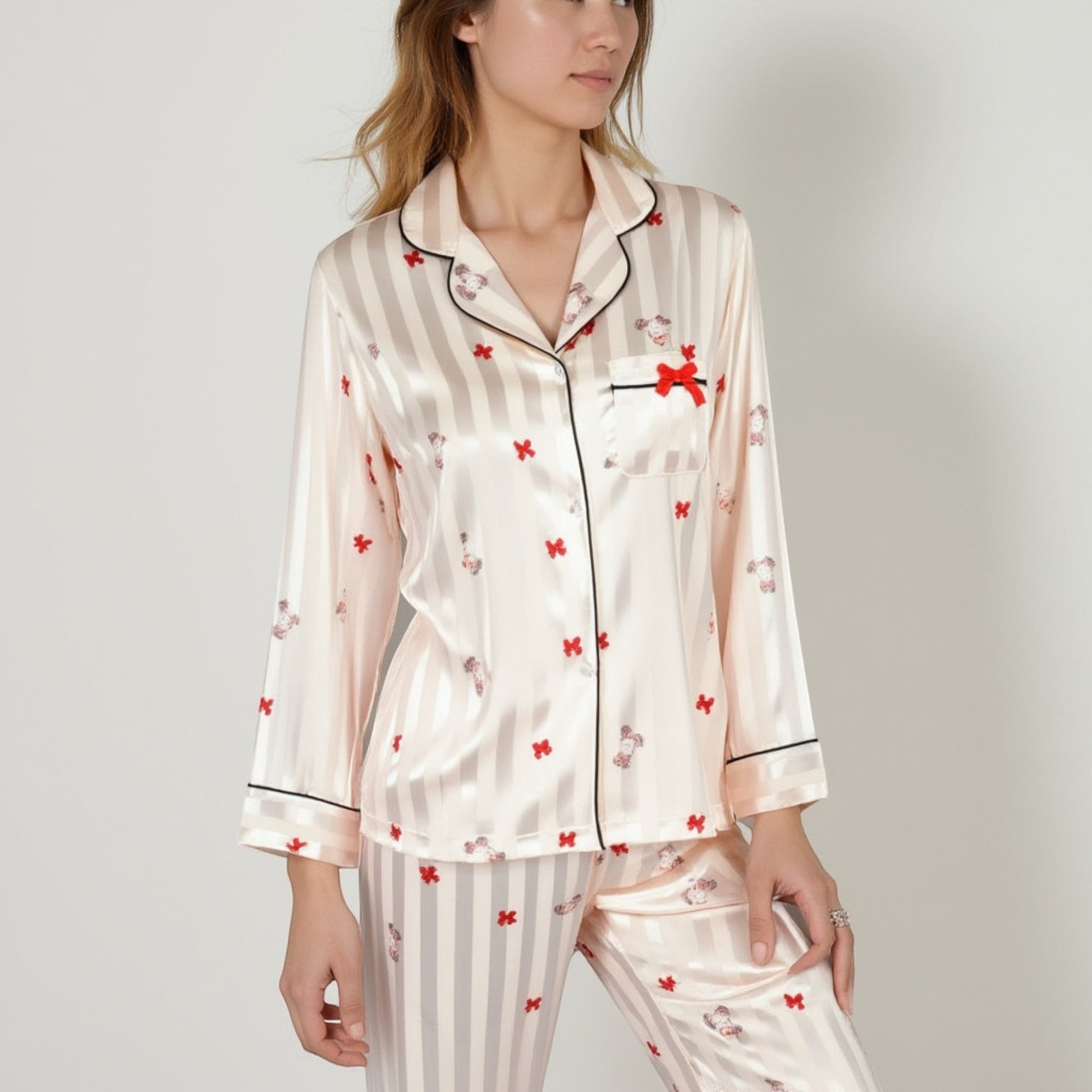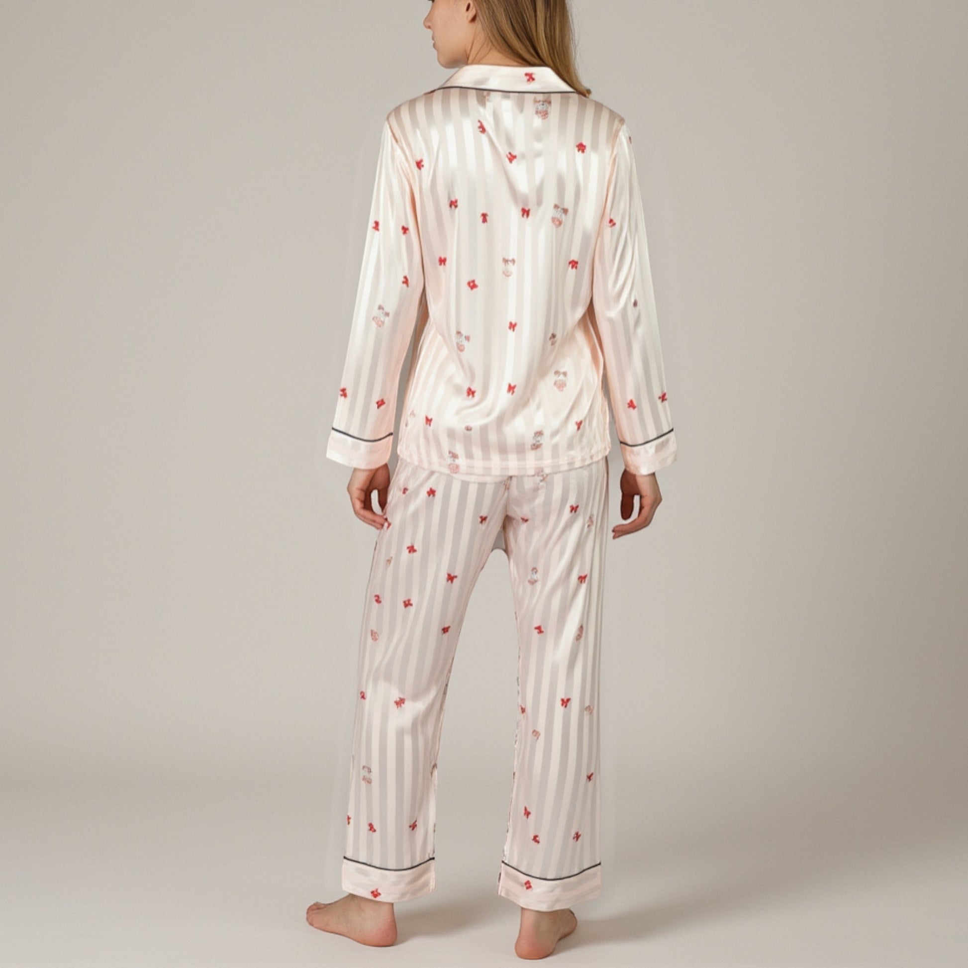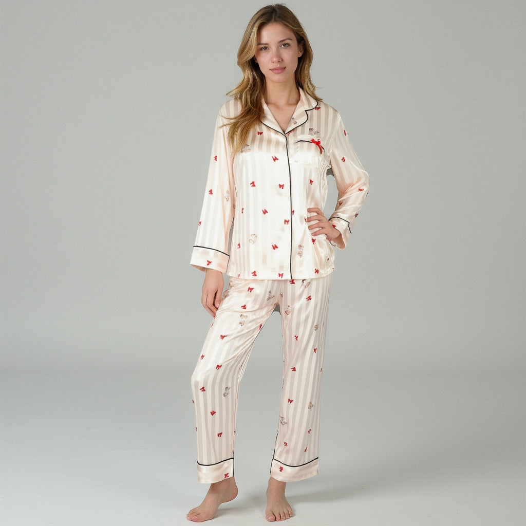 The Anna-Kaci Women's Satin Pajama Set offers a sleek, soft touch with a classic striped pattern and playful allover print. The top features a full button-down front with contrast piping and a chest pocket, while the pants provide a relaxed fit for all-night comfort. Satin fabric drapes smoothly over the skin, creating a luxurious loungewear experience. Complete with charming details, this set is a stylish must-have for your nighttime routine.