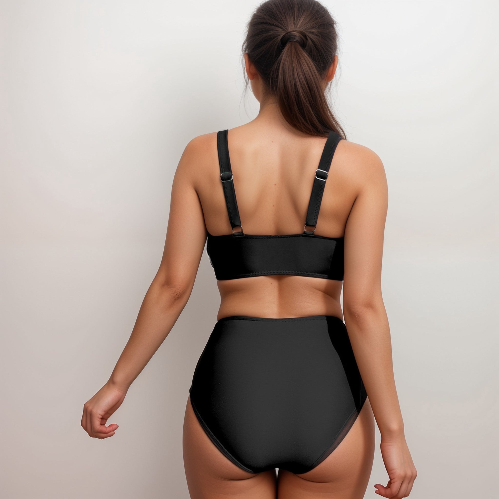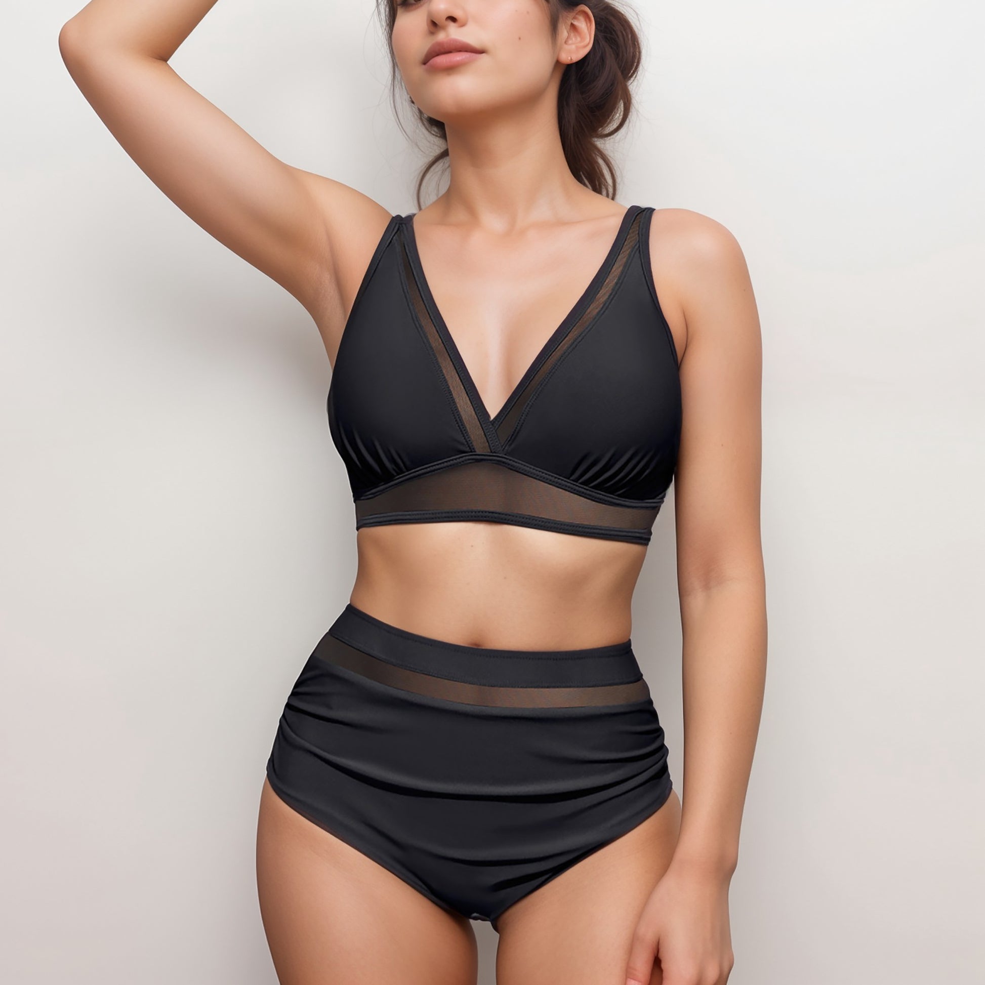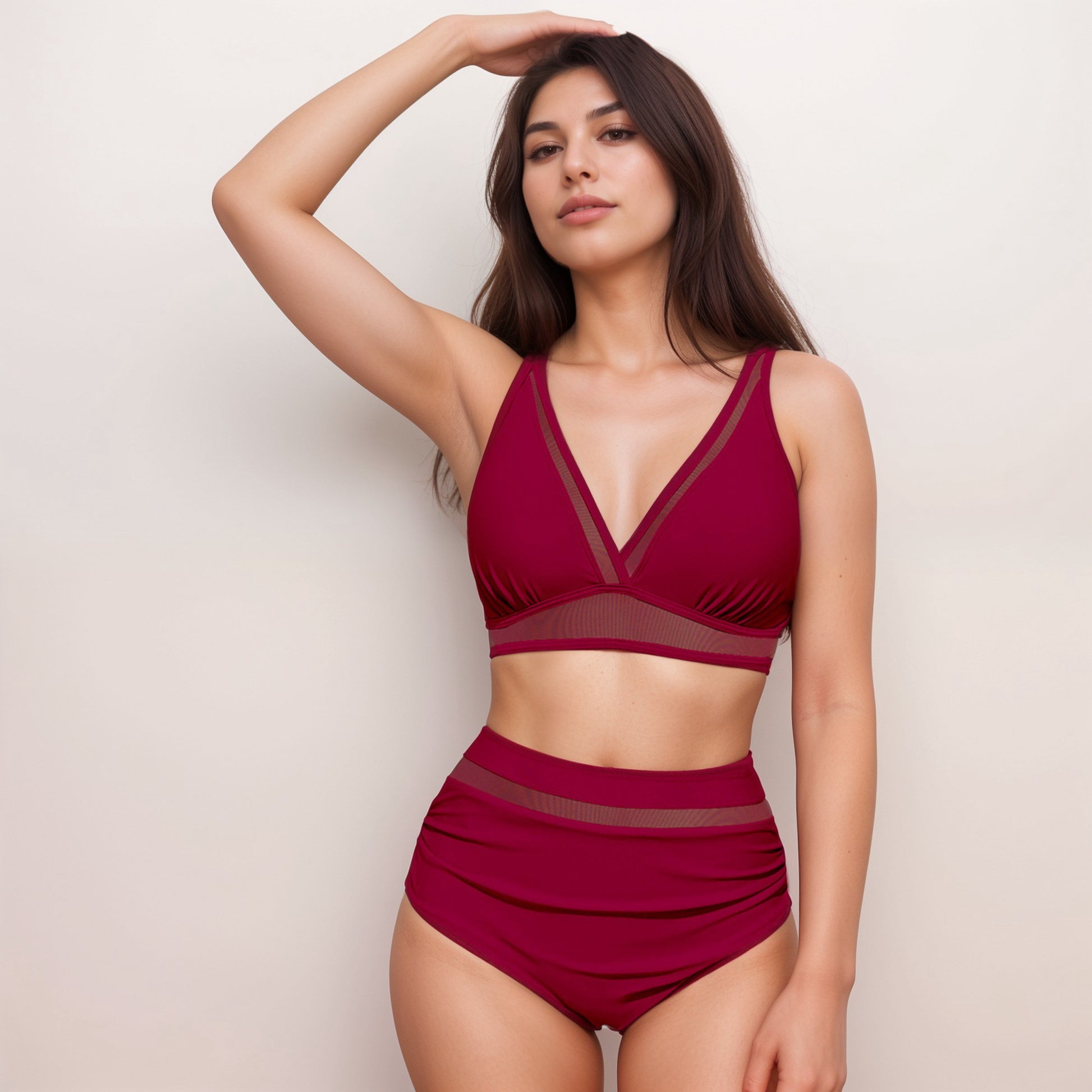 The Anna-Kaci Women's Two Piece Swimsuit is designed with sleek mesh accents for a touch of modern edge. The deep V neckline creates a flattering silhouette, while the wide straps provide added support and comfort. The high waisted bottoms feature light ruching and mesh detail to enhance and contour your shape. Stylish and confidence-boosting, this set combines coverage and sophistication for a standout swimwear look.