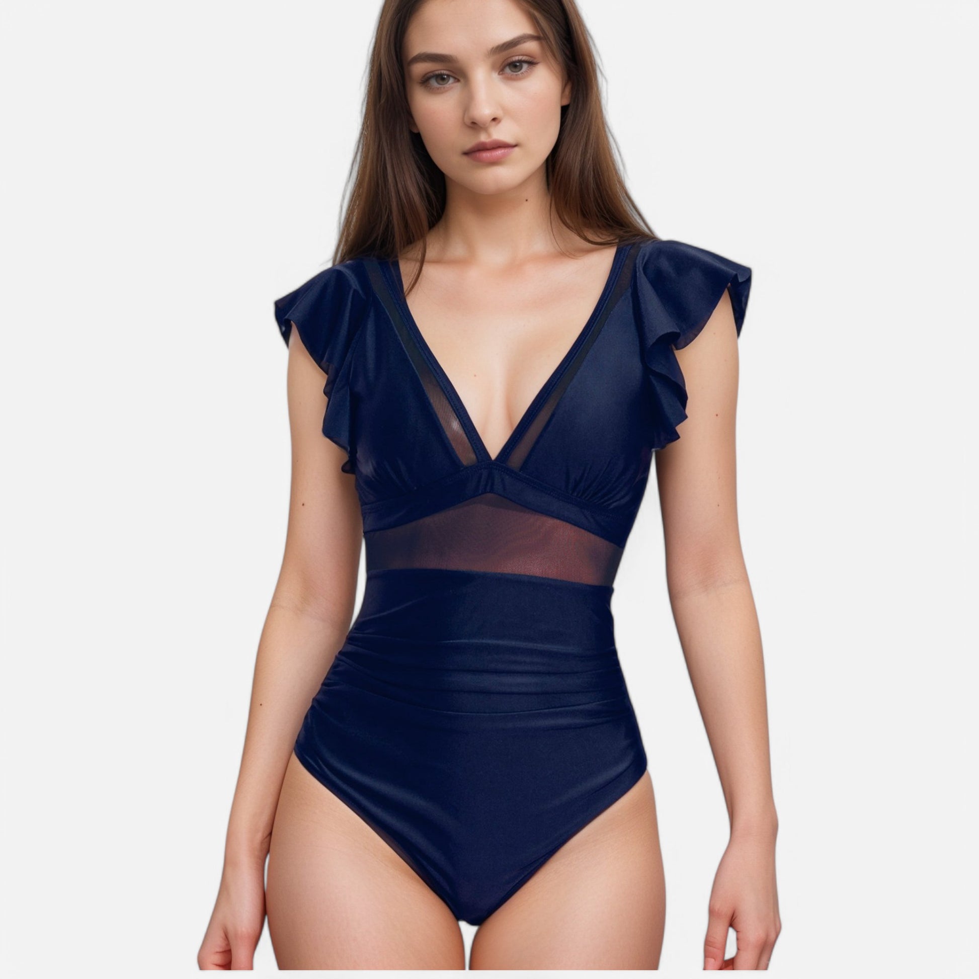 The Anna-Kaci Women's One Piece Swimsuit features delicate mesh paneling at the waist and neckline for a sultry yet sophisticated look. With feminine flutter sleeves and a deep V-neckline, this swimsuit enhances your shape while offering soft, supportive coverage. The ruched waist flatters your midsection, creating a sleek and confident silhouette. Crafted from a smooth stretch fabric, this swimsuit ensures comfort and style for all your sunny-day adventures.