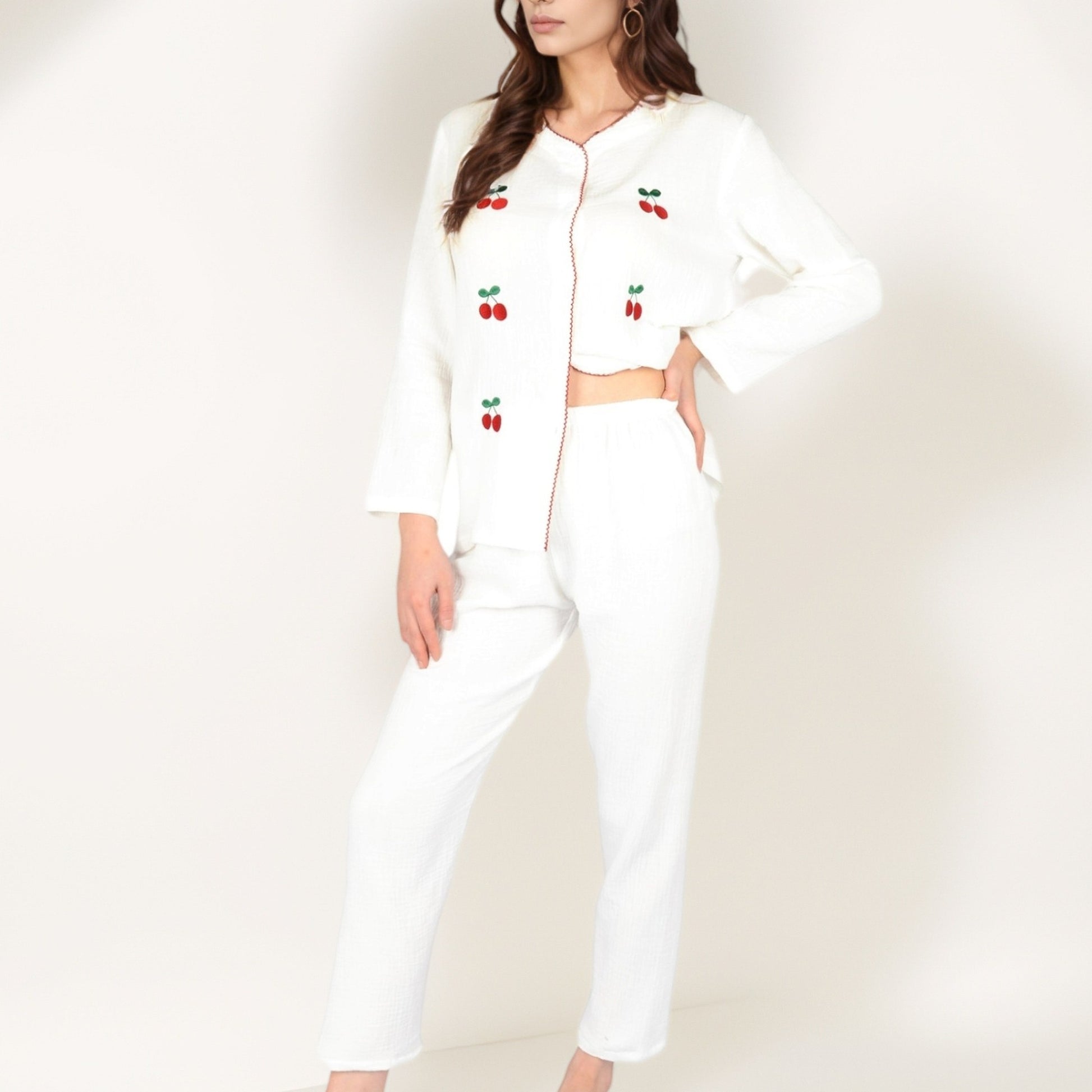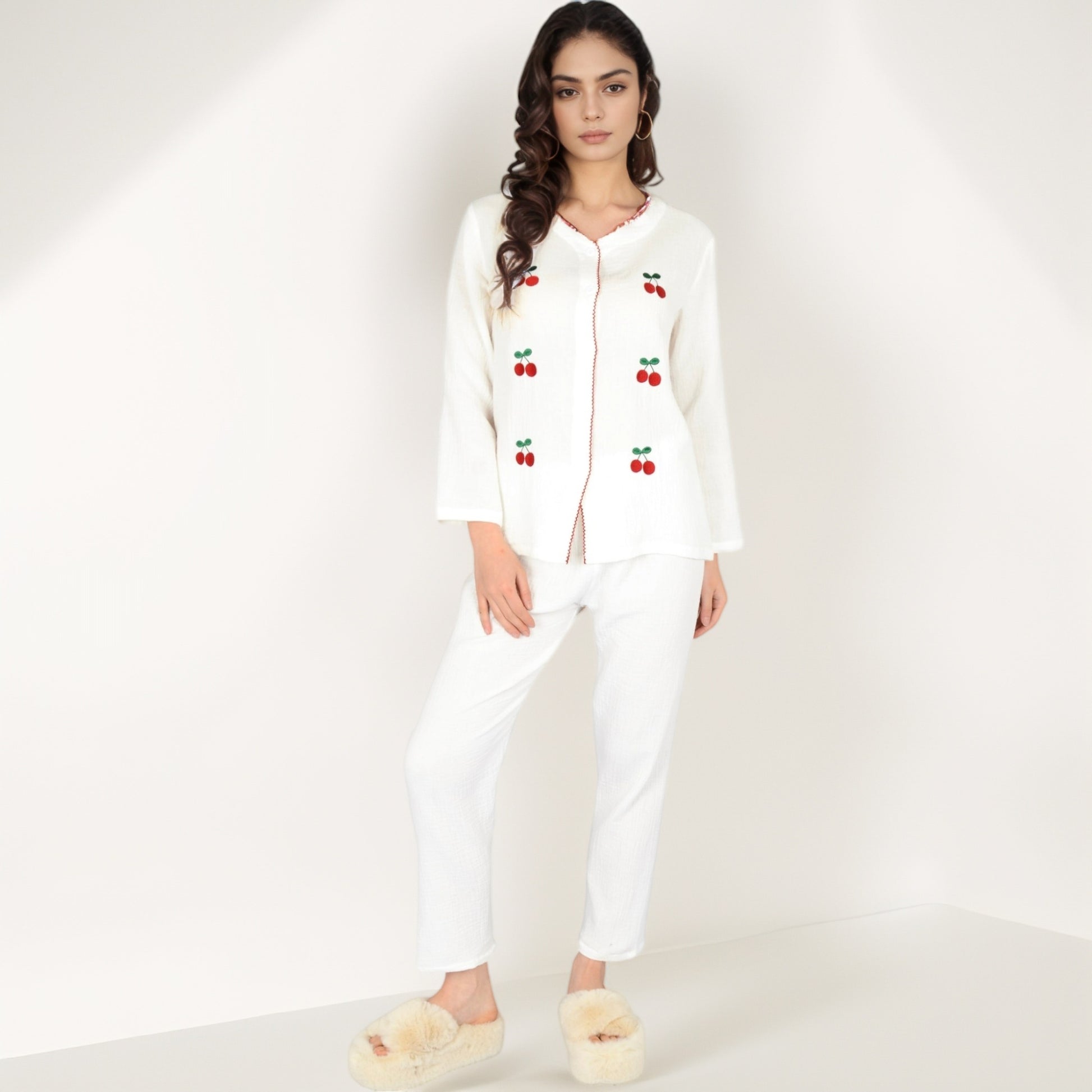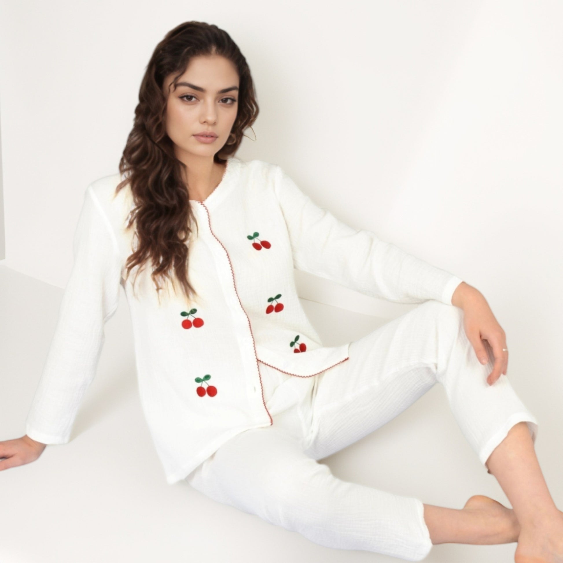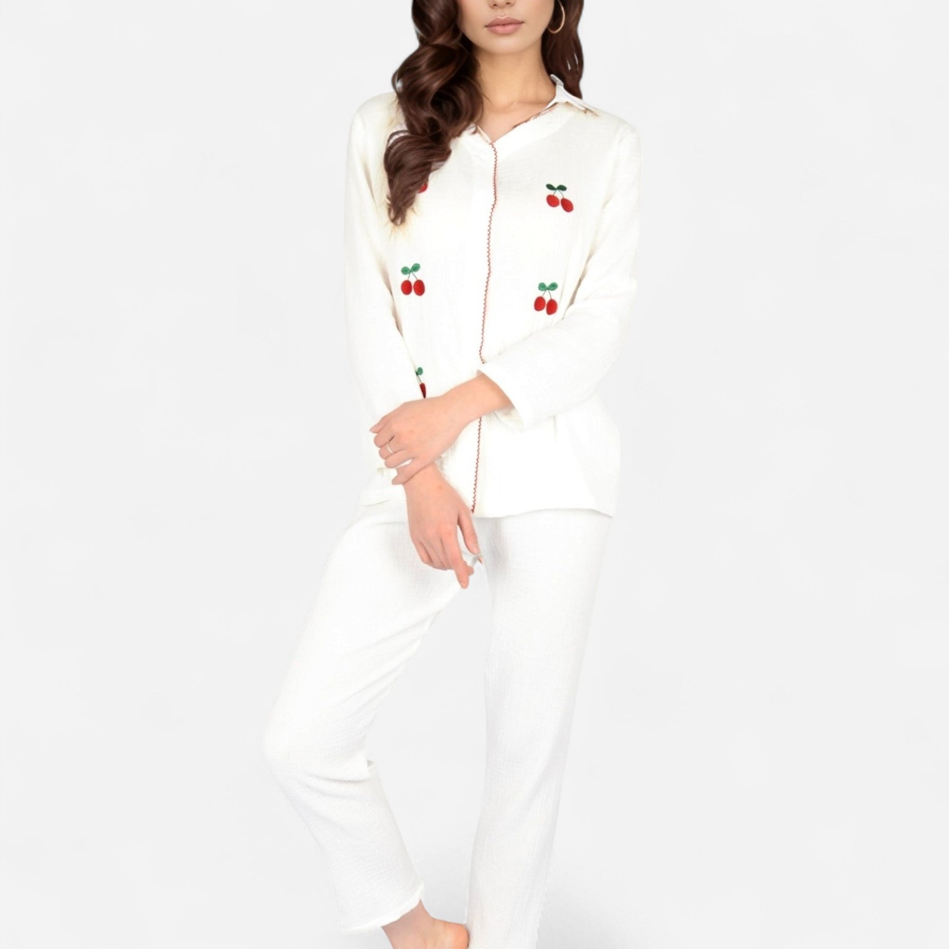 Anna-Kaci Women's Cherry Embroidered Long Sleeve Pajama Set with Button Front Top and Lightweight Relaxed Fit Pants