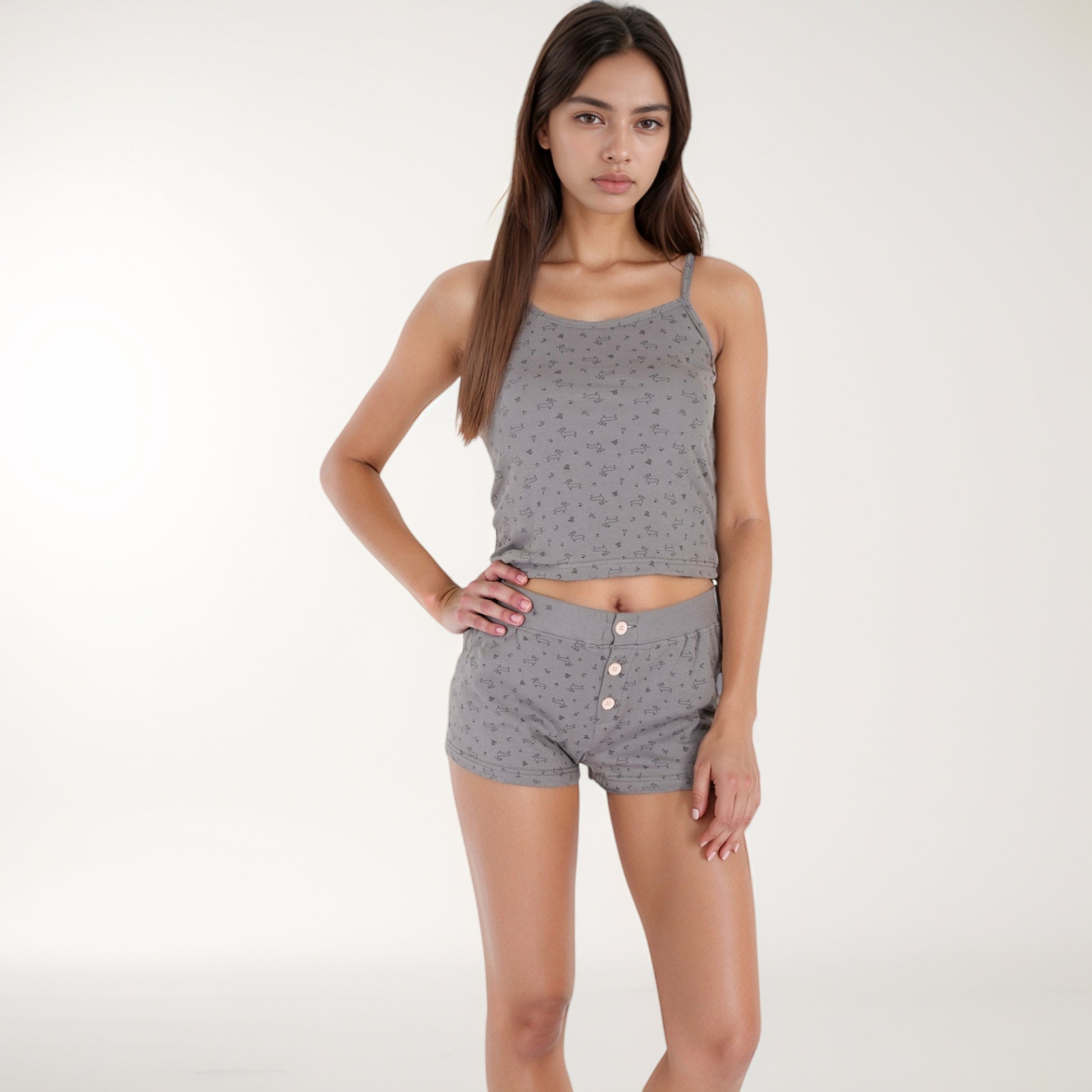 The Anna-Kaci Women's Printed Ribbed Sleepwear Set is a cozy and stylish choice for bedtime or lounging. This two-piece set includes a fitted spaghetti strap tank top and matching high-waisted shorts, both crafted from a soft ribbed knit fabric with a subtle allover print. The shorts feature a decorative button-front detail and a comfortable elastic waistband for a snug fit. Perfect for warm nights, this sleep set combines comfort with a touch of playful charm.