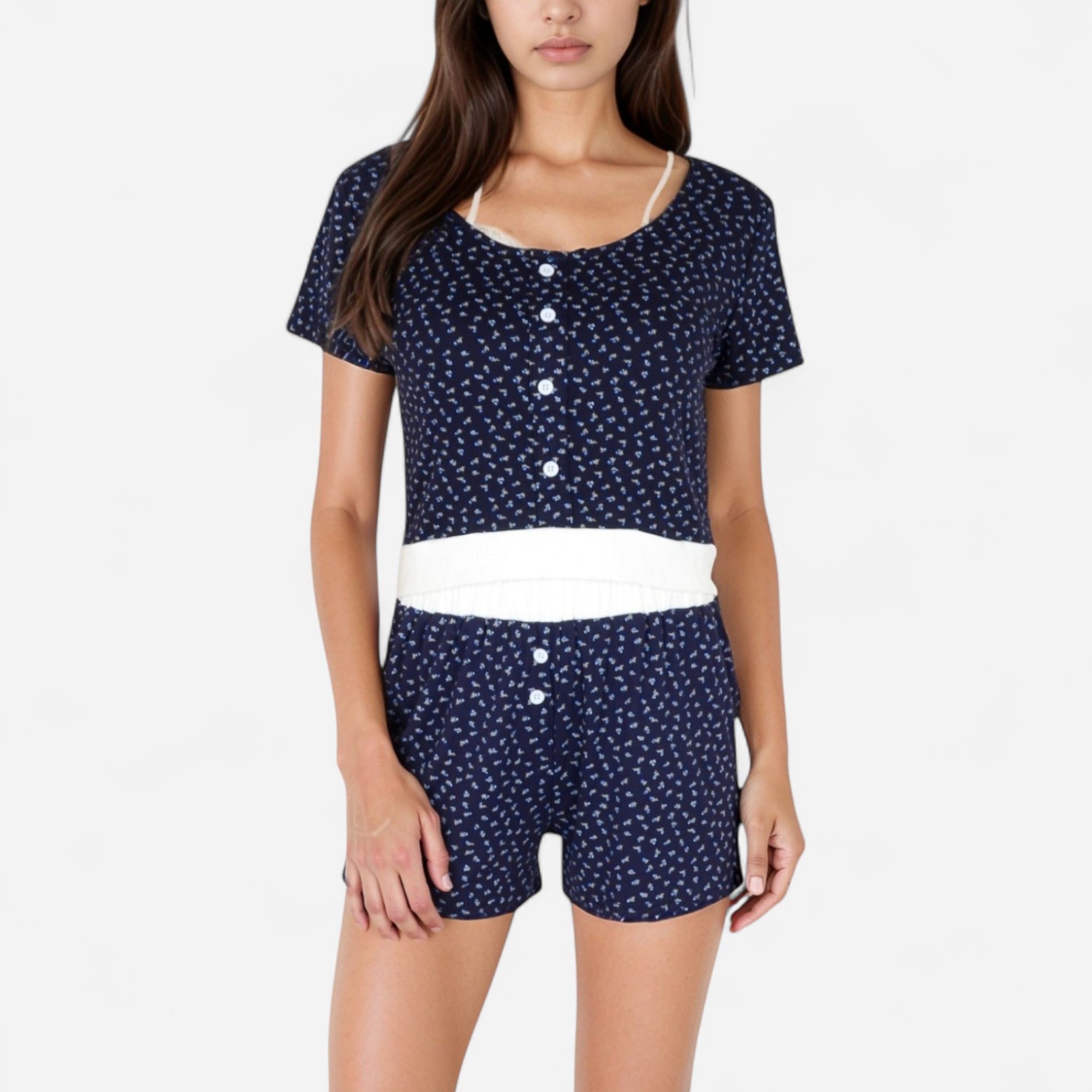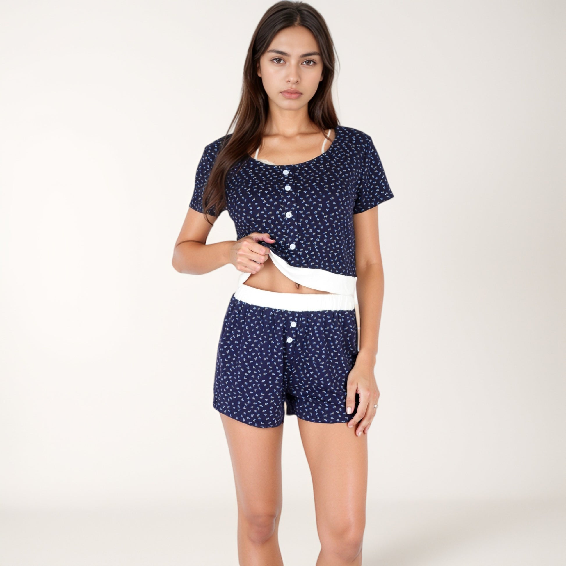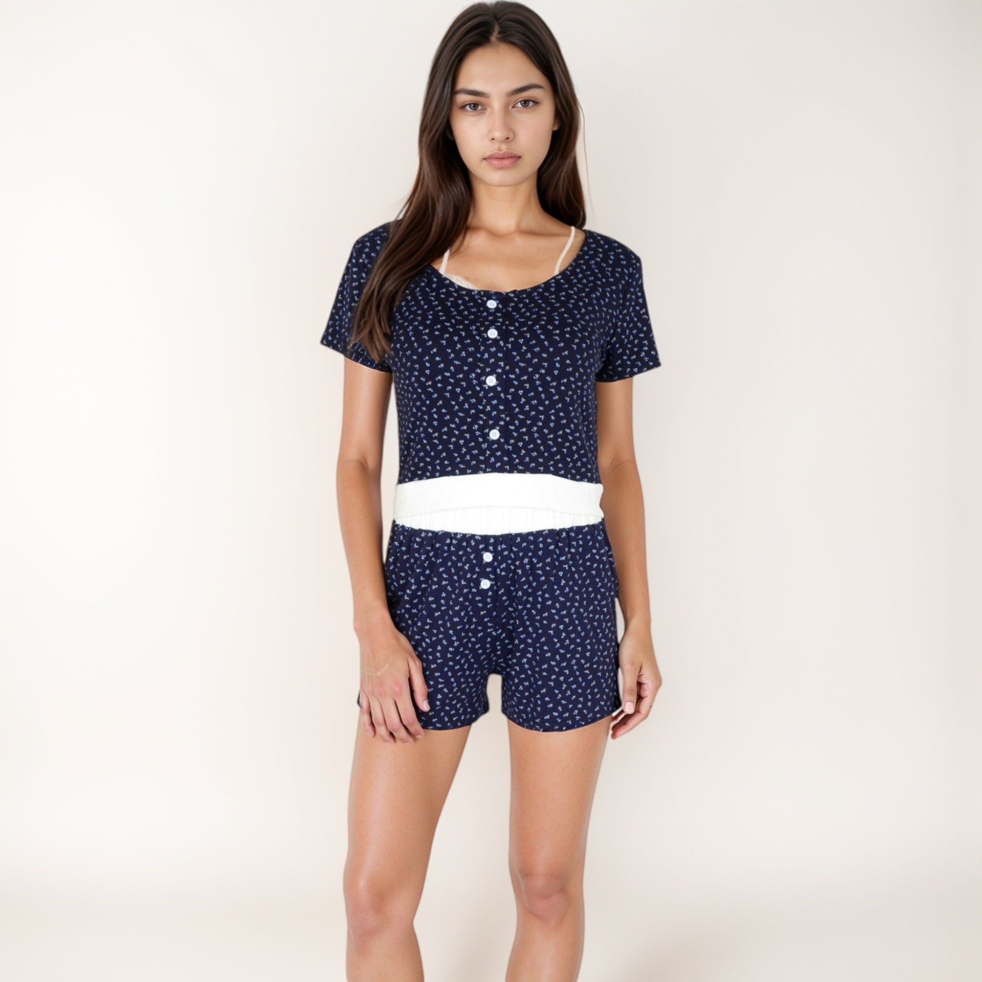 The Anna-Kaci Women's Navy Short Sleeve Sleepwear Set brings charm and comfort to your nighttime routine. This two-piece set features a scoop neck button-front top with a subtle mini bow print and matching high-waist shorts with coordinating buttons. Designed with a soft and stretchy fabric, the set offers a flattering fit and breathable feel. It's a cute and cozy choice for sleeping or lounging at home in style.