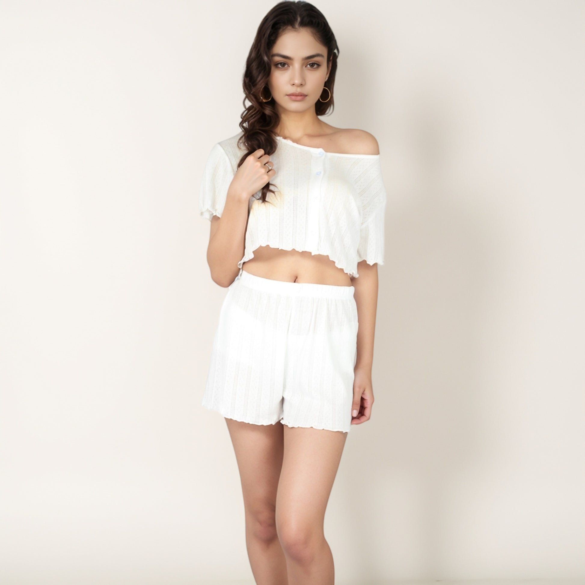 The Anna-Kaci Women's Ribbed Knit Sleepwear Set features a charming cropped button-front top paired with matching high waist shorts. Made from soft, lightweight ribbed fabric, this set ensures breathability and comfort throughout the night. The scalloped edges and subtle texture add a touch of feminine detail. Designed for ultimate relaxation, it¡¯s perfect for unwinding at home or lounging in cozy style.