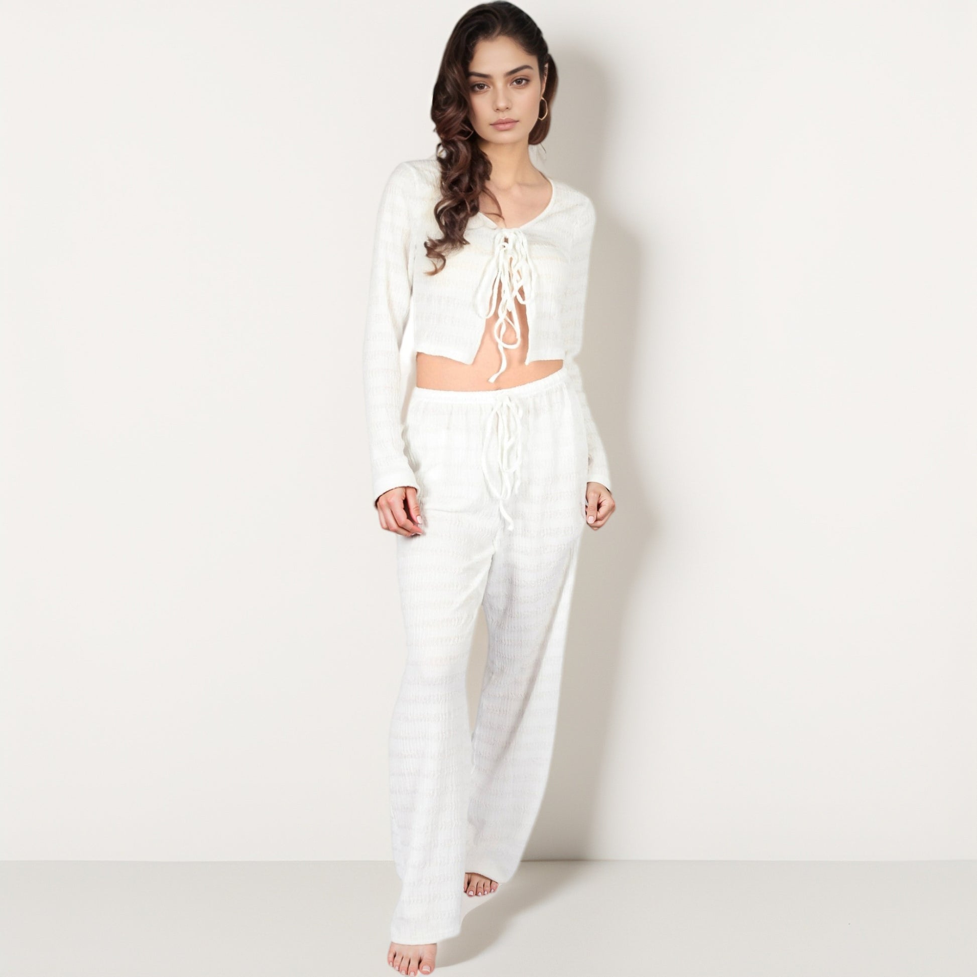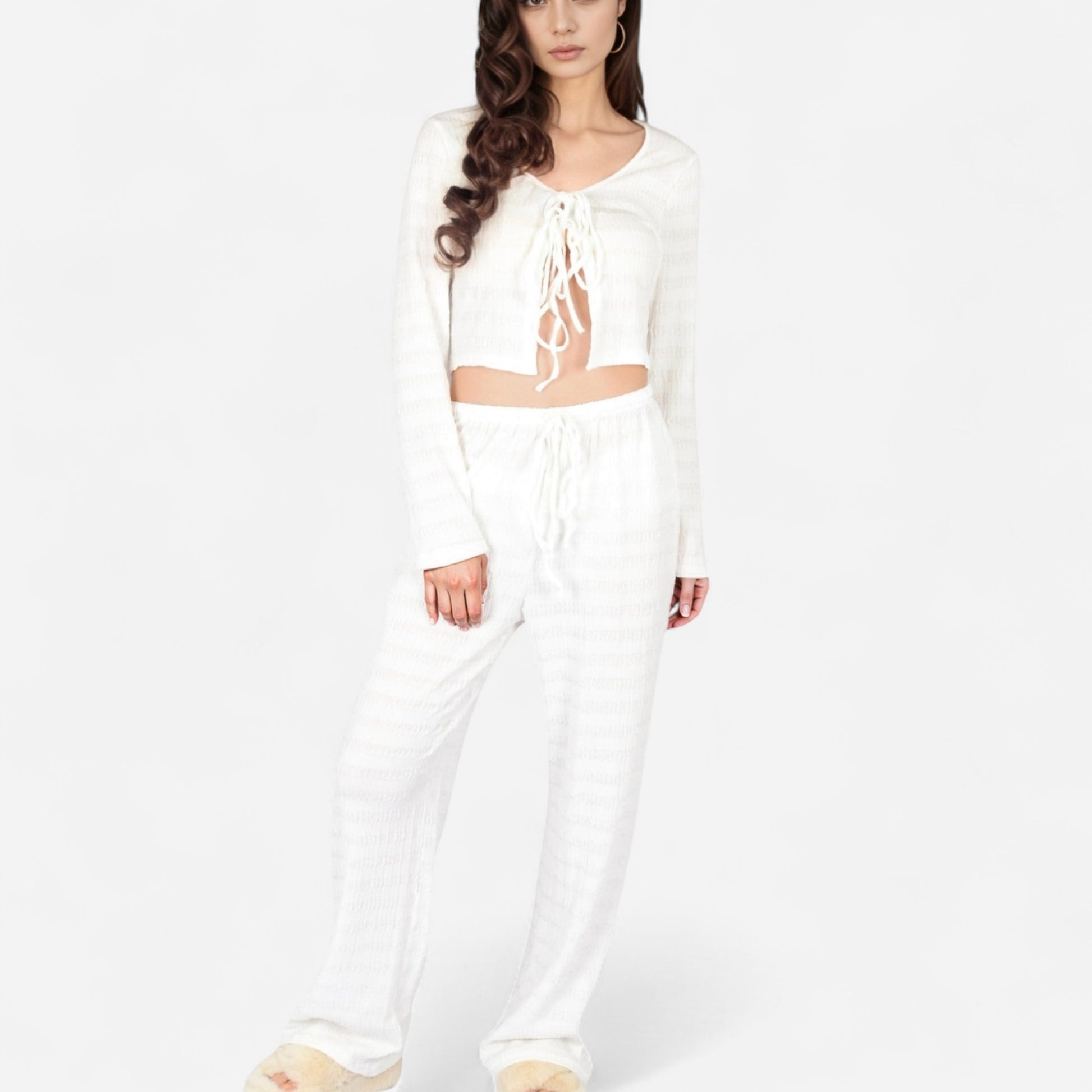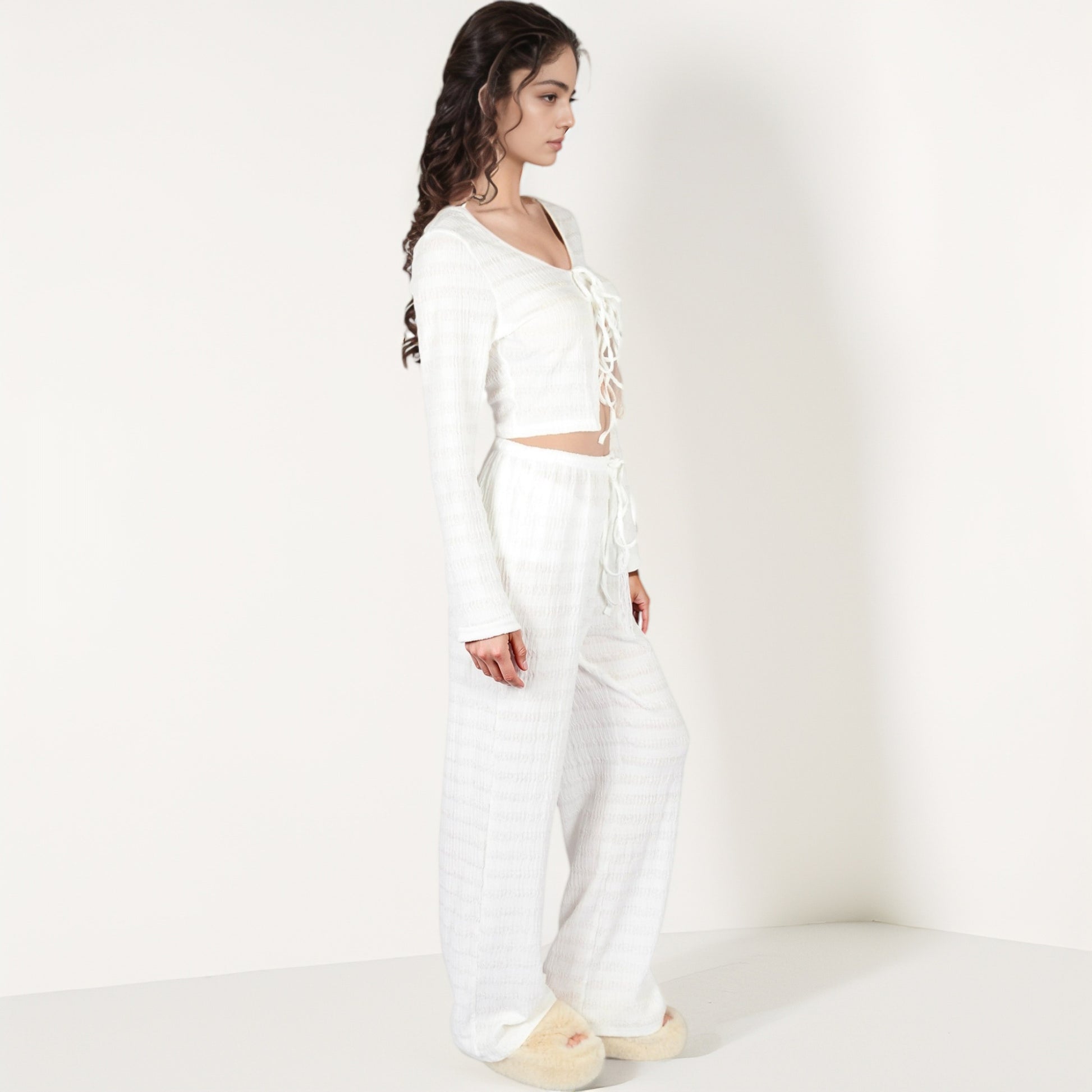 Anna-Kaci Lounge Women's Long Sleeve Waffle Knit Sleepwear Set with Front Tie Crop Top and Drawstring Lounge Pants