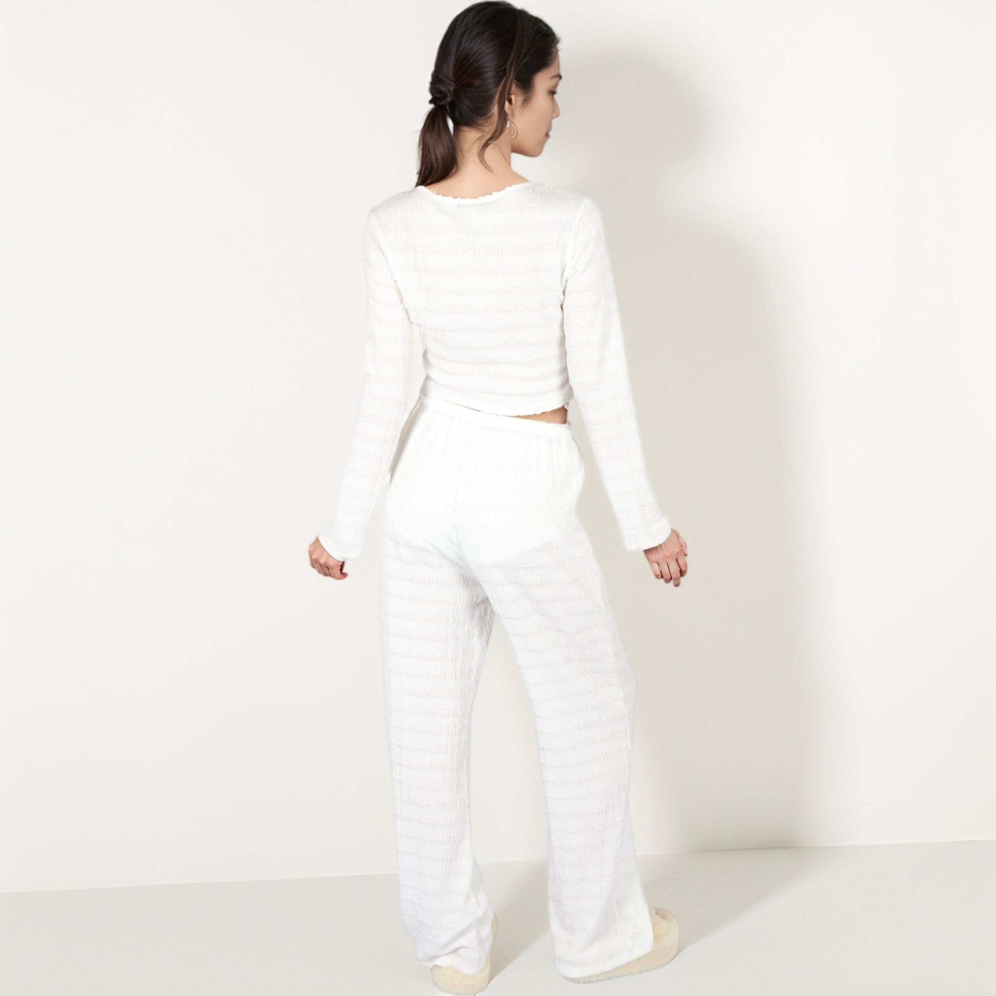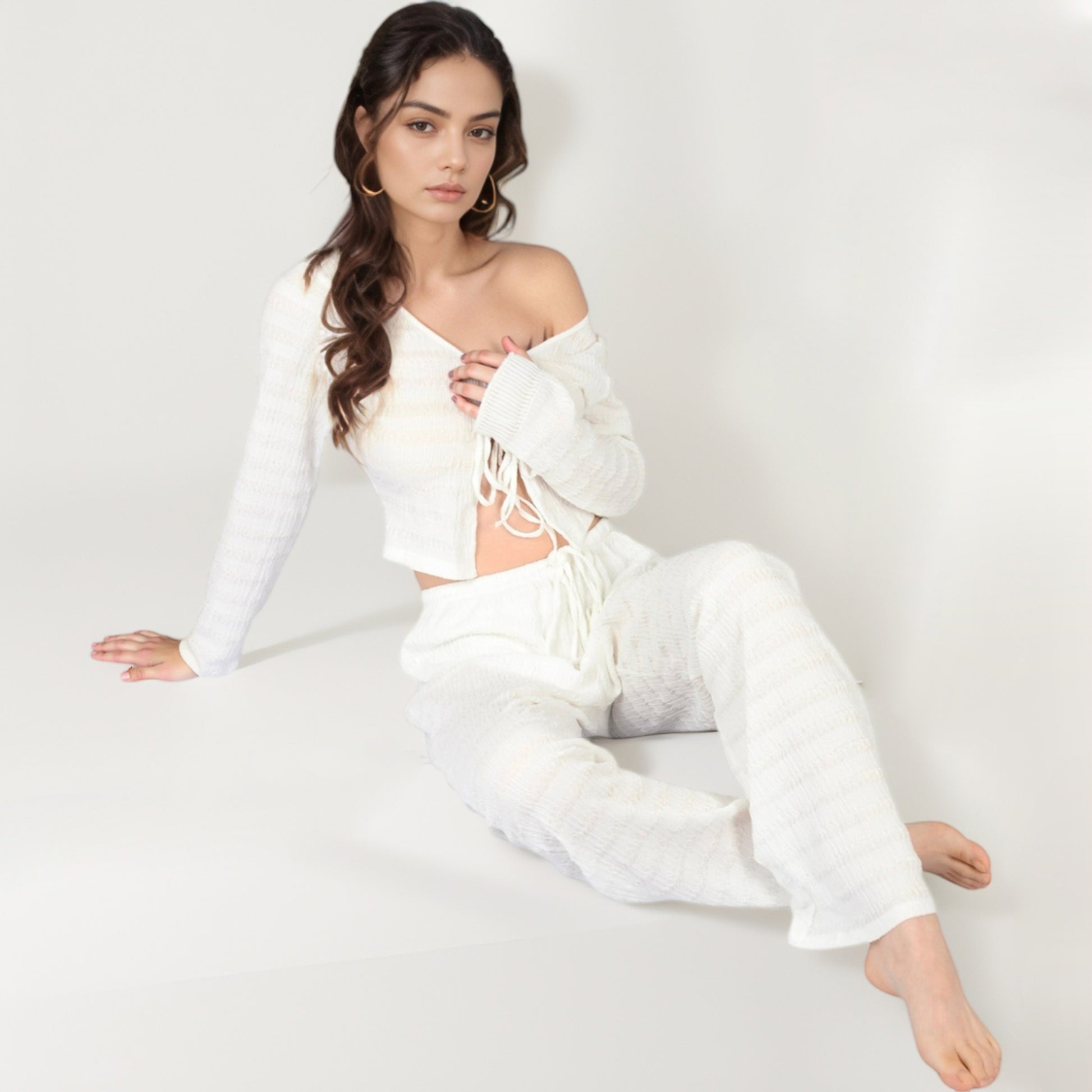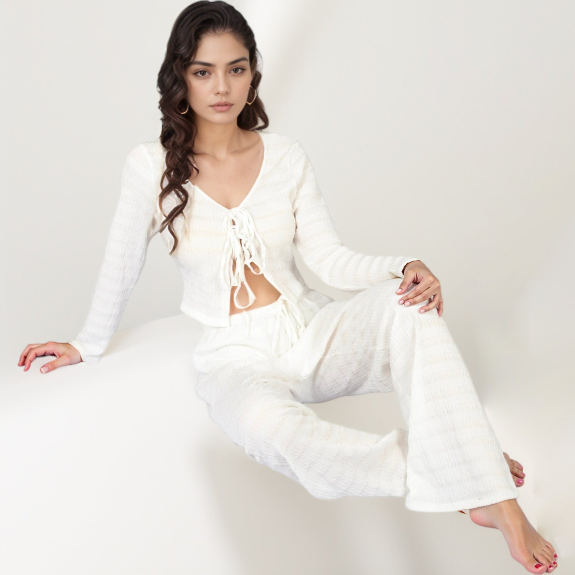Anna-Kaci Lounge Women's Long Sleeve Waffle Knit Sleepwear Set with Front Tie Crop Top and Drawstring Lounge Pants