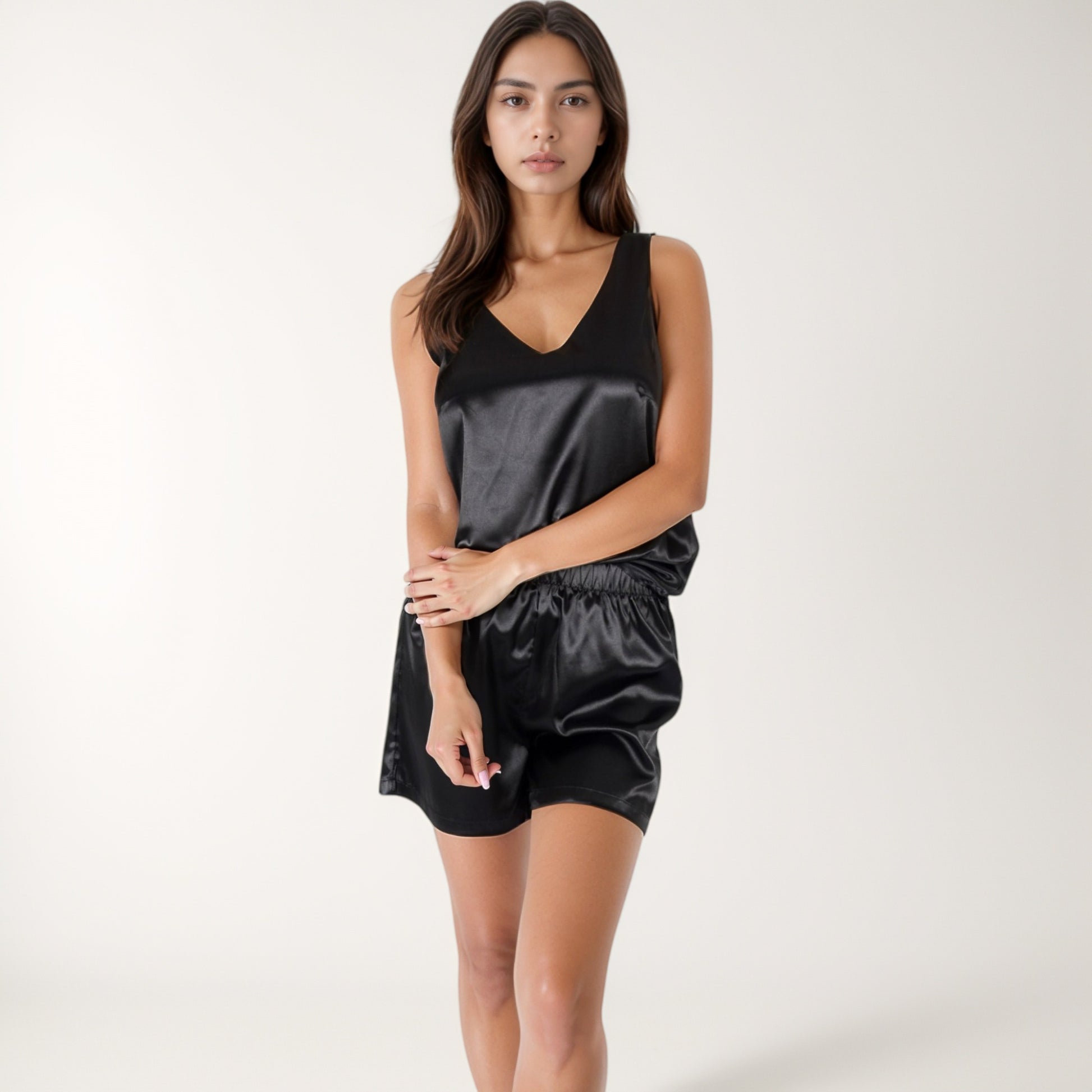 The Anna-Kaci Women's Satin Sleepwear Set offers a sleek and sophisticated look with a soft, silky finish. Featuring a sleeveless V-neck top and matching shorts with side button accents, this set is both lightweight and breathable. The smooth satin fabric adds a luxurious touch while maintaining comfort for restful nights. A stylish upgrade to your bedtime essentials, this set is perfect for feeling polished even at home.