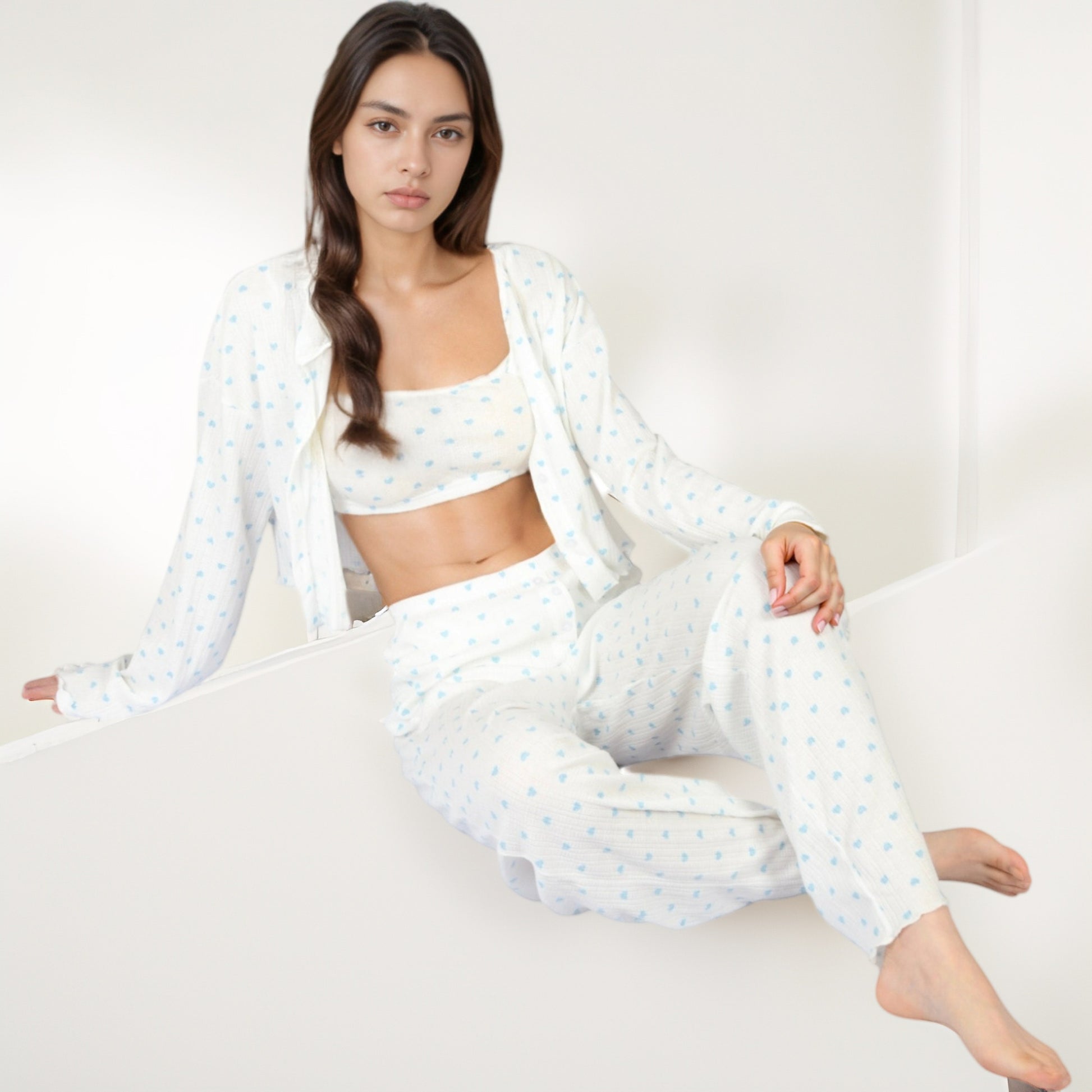 The Anna-Kaci Women's Heart Print Pajama Set features a soft ribbed knit fabric with a playful allover heart print. The cropped long sleeve top has a relaxed fit with subtle flare at the cuffs, while the matching high-waisted pants offer a wide-leg silhouette for easy movement. Designed for ultimate comfort and cuteness, this two-piece lounge set is perfect for relaxing days at home. Add a touch of charm to your at-home wardrobe with this cozy favorite.