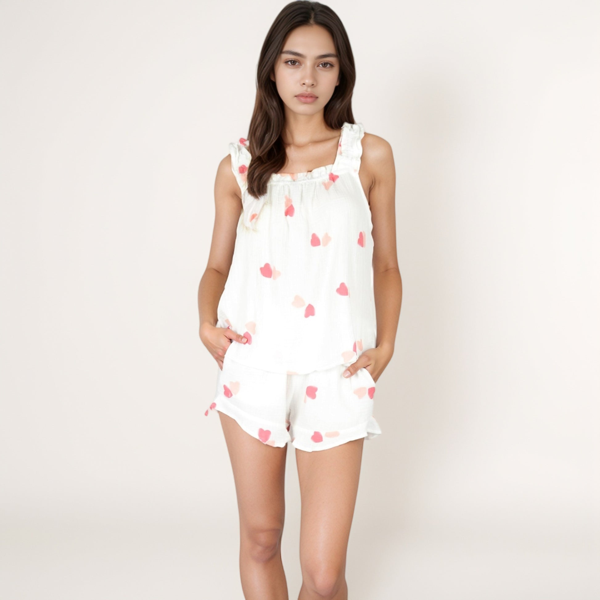 Anna-Kaci Lounge Women's Ruffle Strap Pajama Set with Peach Heart Print and Flowy Sleeveless Top