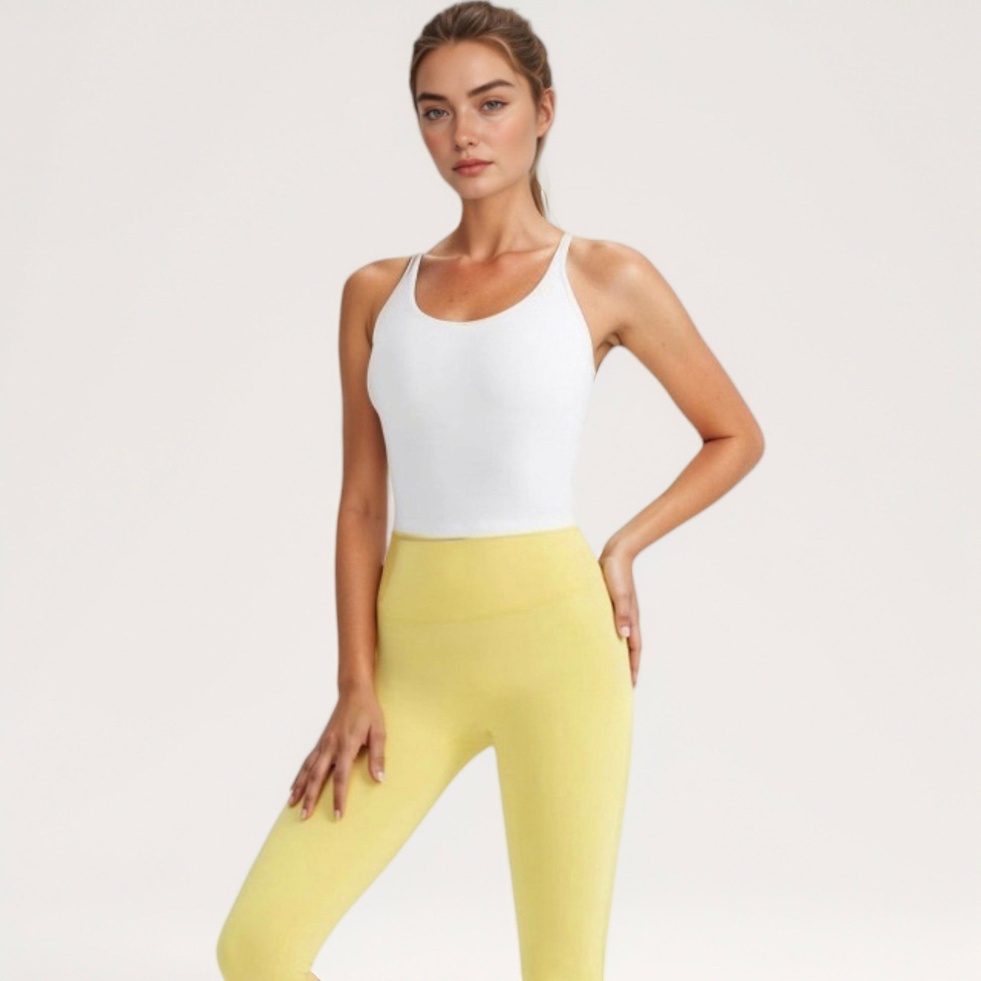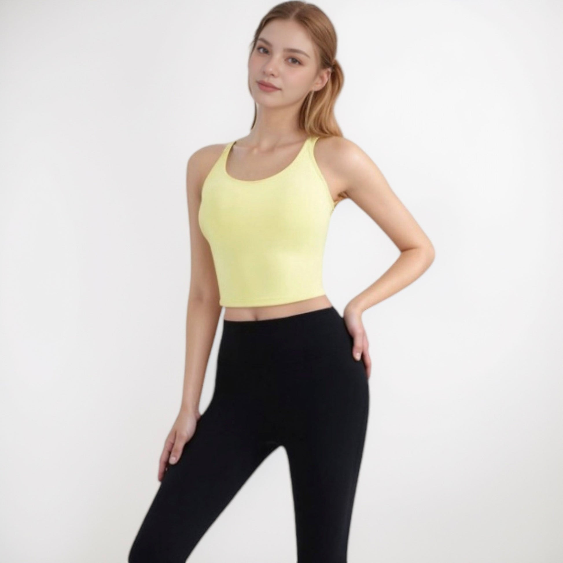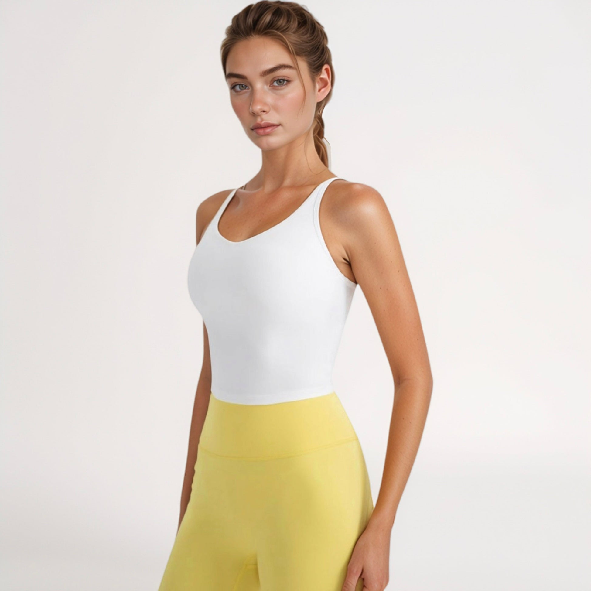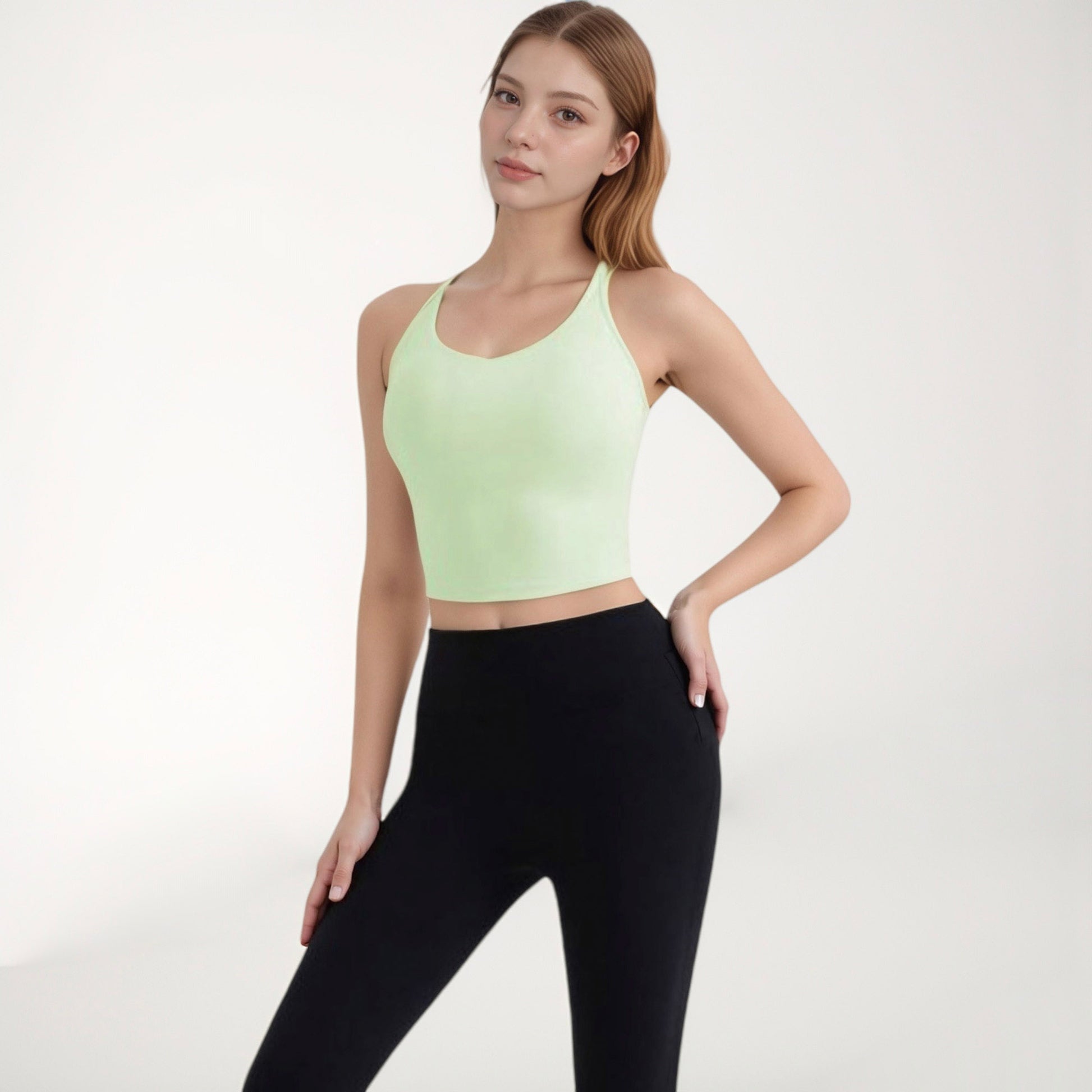 This women's cropped tank top features a flattering V-neckline and delicate spaghetti straps for a minimal, airy look. Made from smooth, stretchy fabric with a built-in bra, it provides gentle support for yoga, pilates, or daily wear. The slim, cropped silhouette hugs the body while allowing full range of motion. Perfect for layering or wearing solo, this top blends sleek style with versatile comfort.