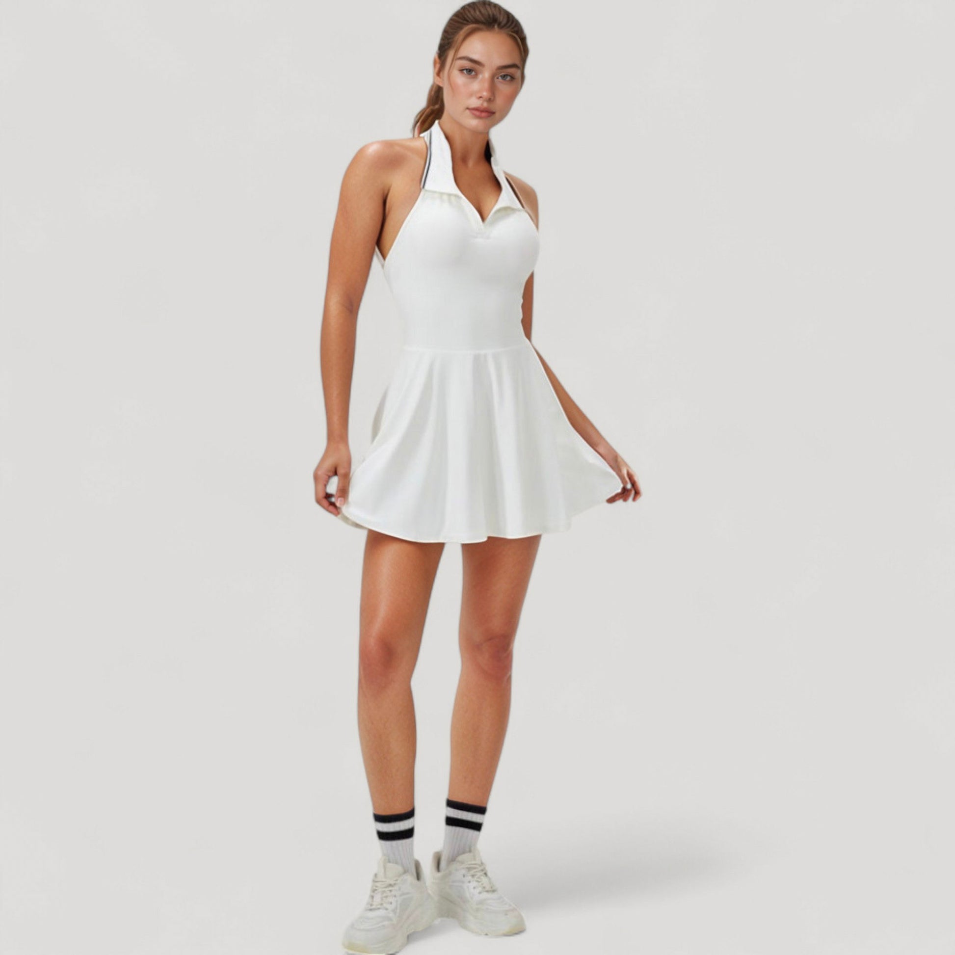 This women's sleeveless tennis dress combines sporty style with a touch of sophistication. Featuring a contrasting white polo collar and halter neckline, the dress offers a secure, elegant fit ideal for active wear. The A-line flared skirt enhances mobility while maintaining a flattering shape. Crafted from smooth, stretchy performance fabric, this dress keeps you cool and stylish during any activity.
