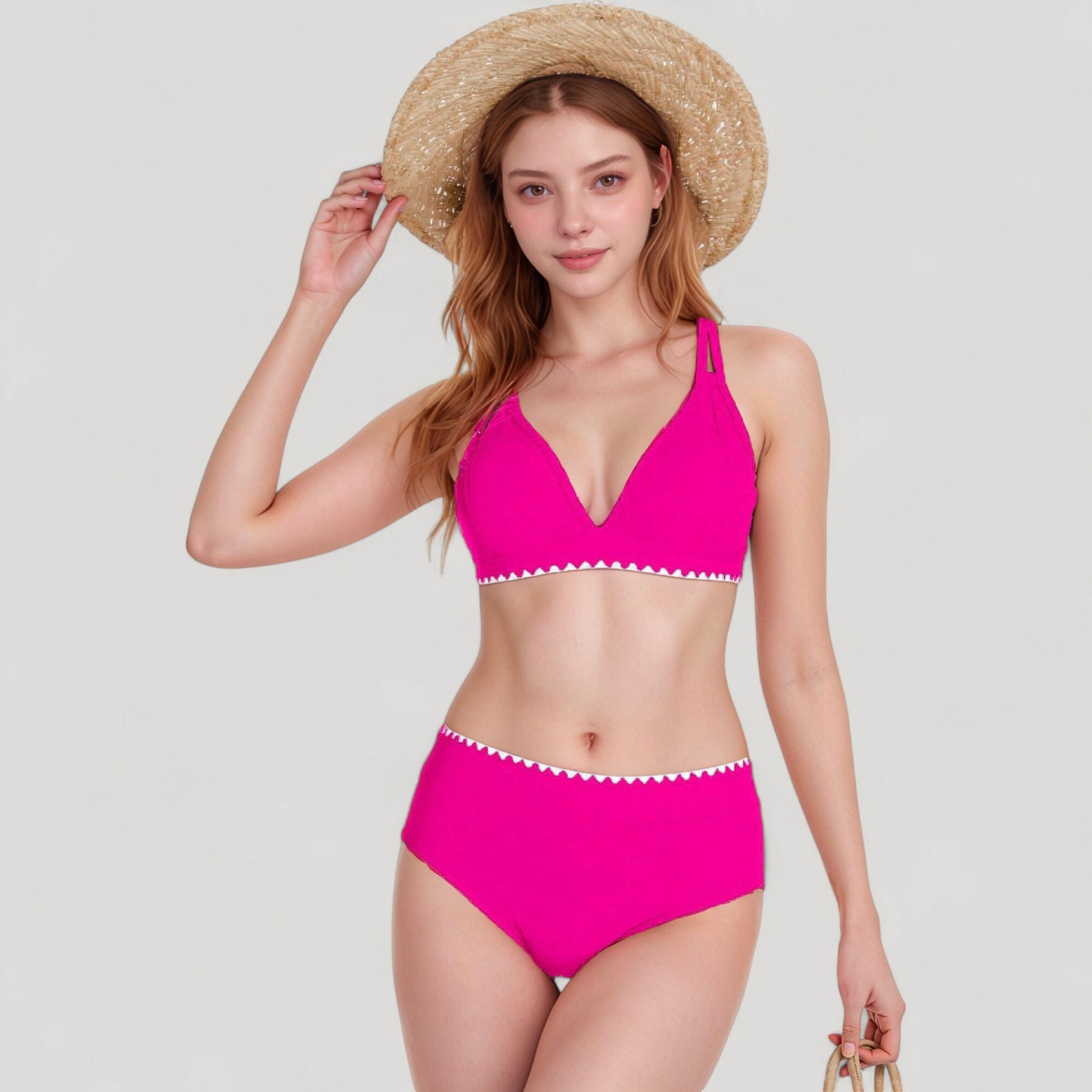 This two-piece bikini set features a flattering high waist bottom and a triangle-cut top accented with playful contrast trim. The adjustable shoulder straps offer a customizable fit, while the soft stretch fabric ensures comfort throughout the day. With its supportive design and fun edge detailing, this bikini combines fashion and function effortlessly. A stylish option for your next poolside or seaside outing.