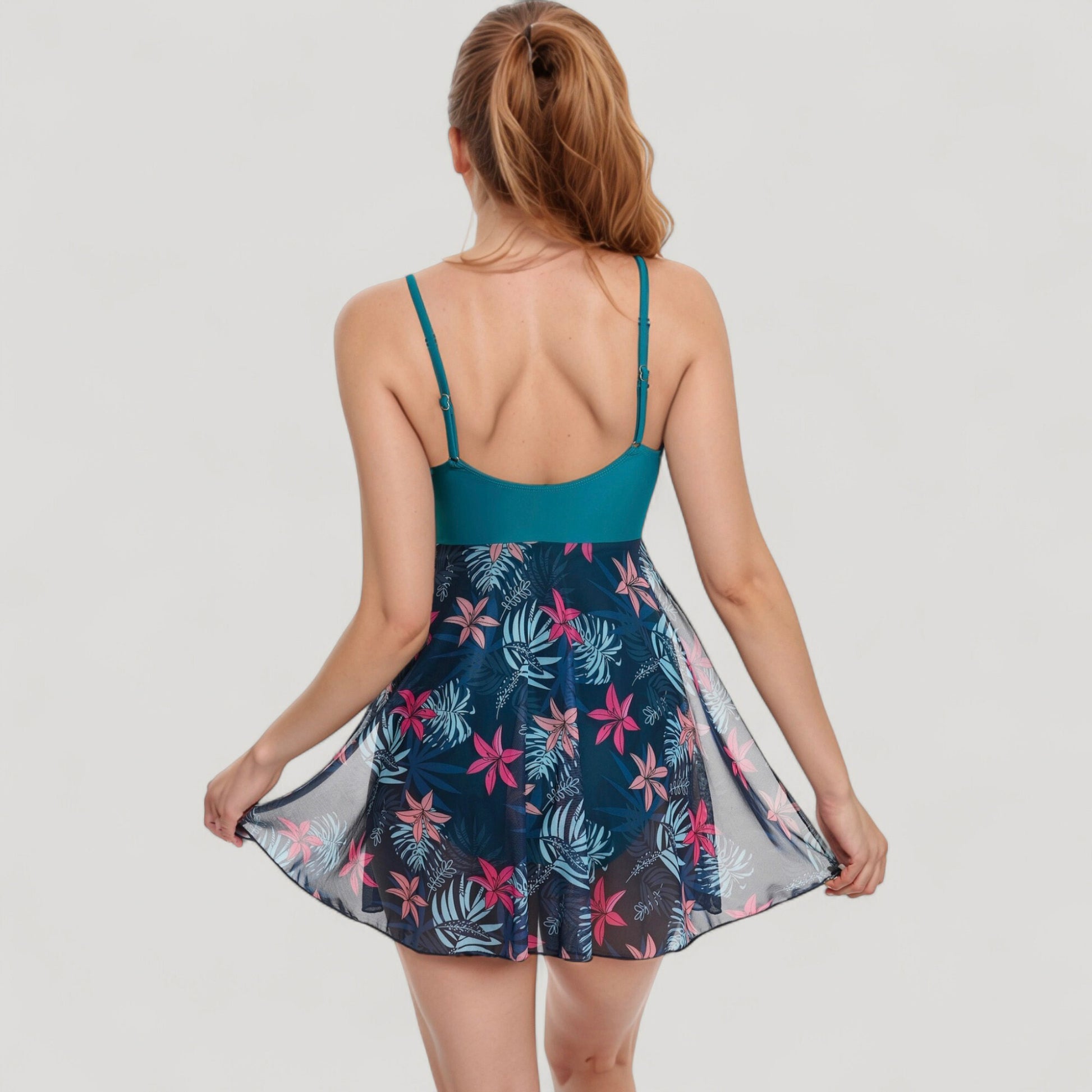 Anna-Kaci Swim Women's One Piece Swim Dress with Twist Front Bodice and Sheer Mesh Skirt Overlay