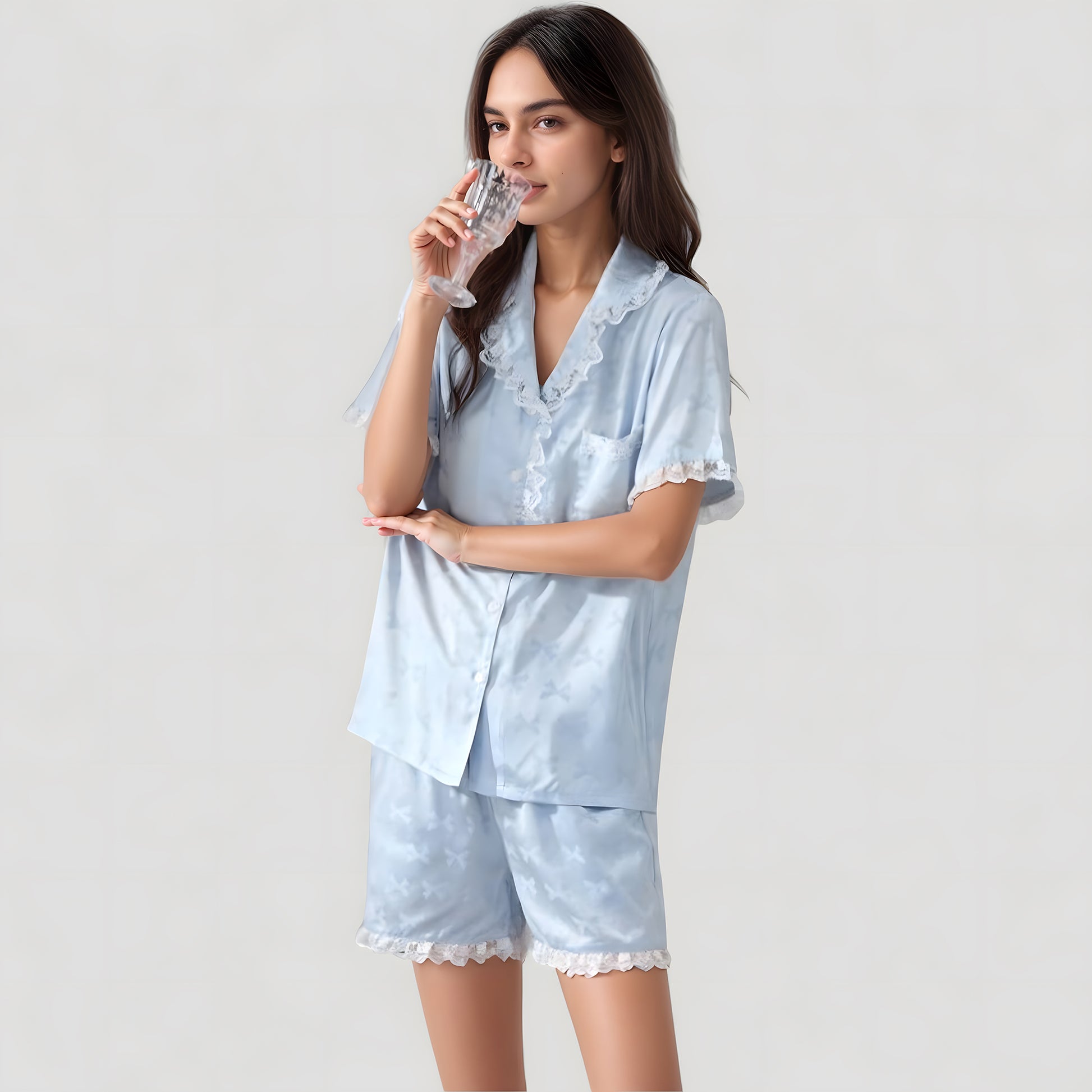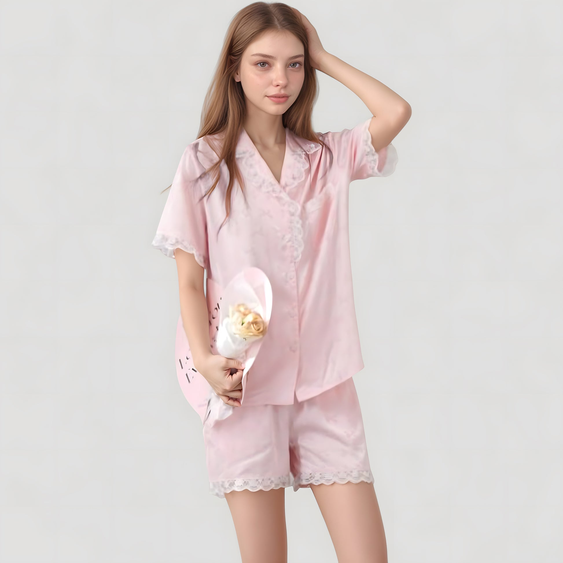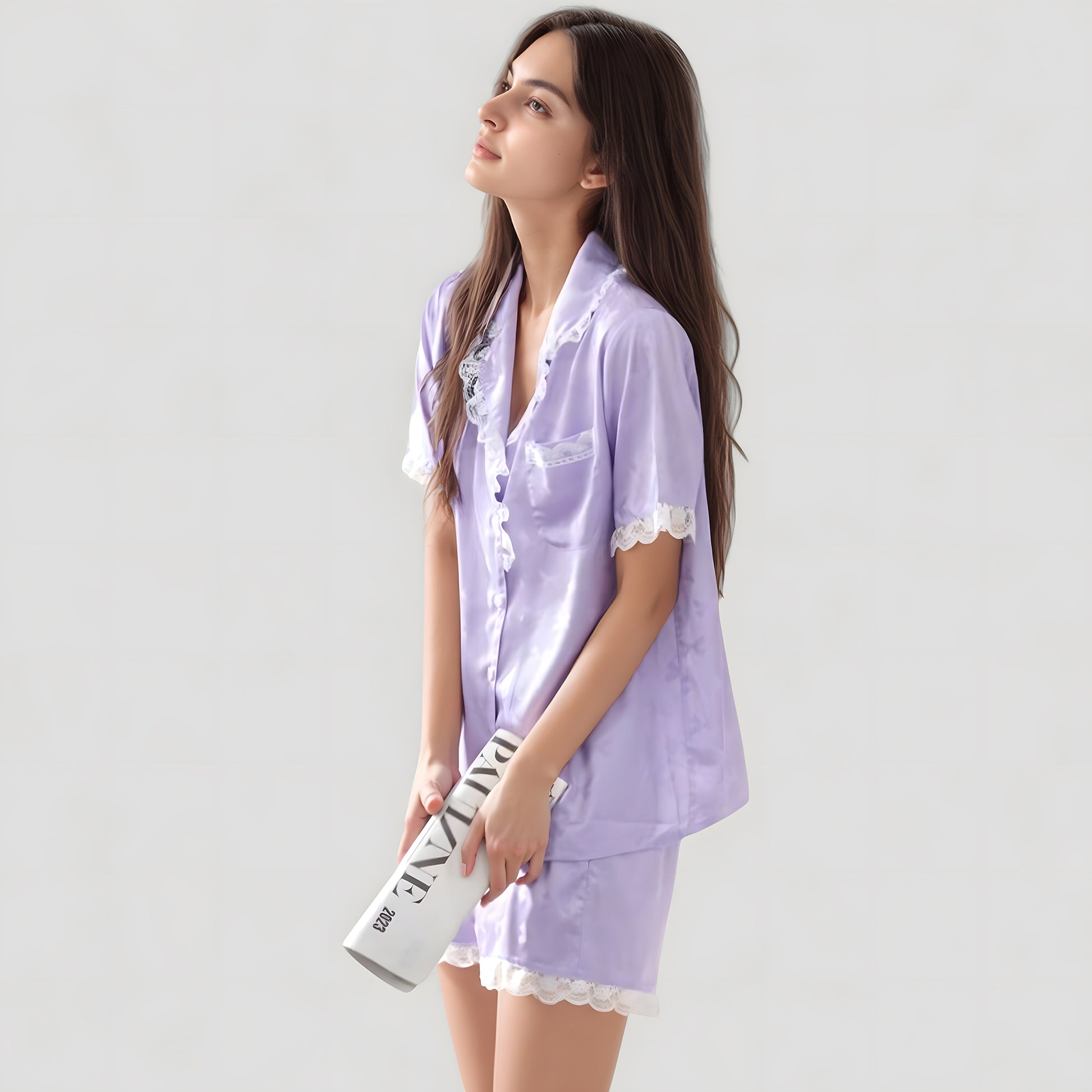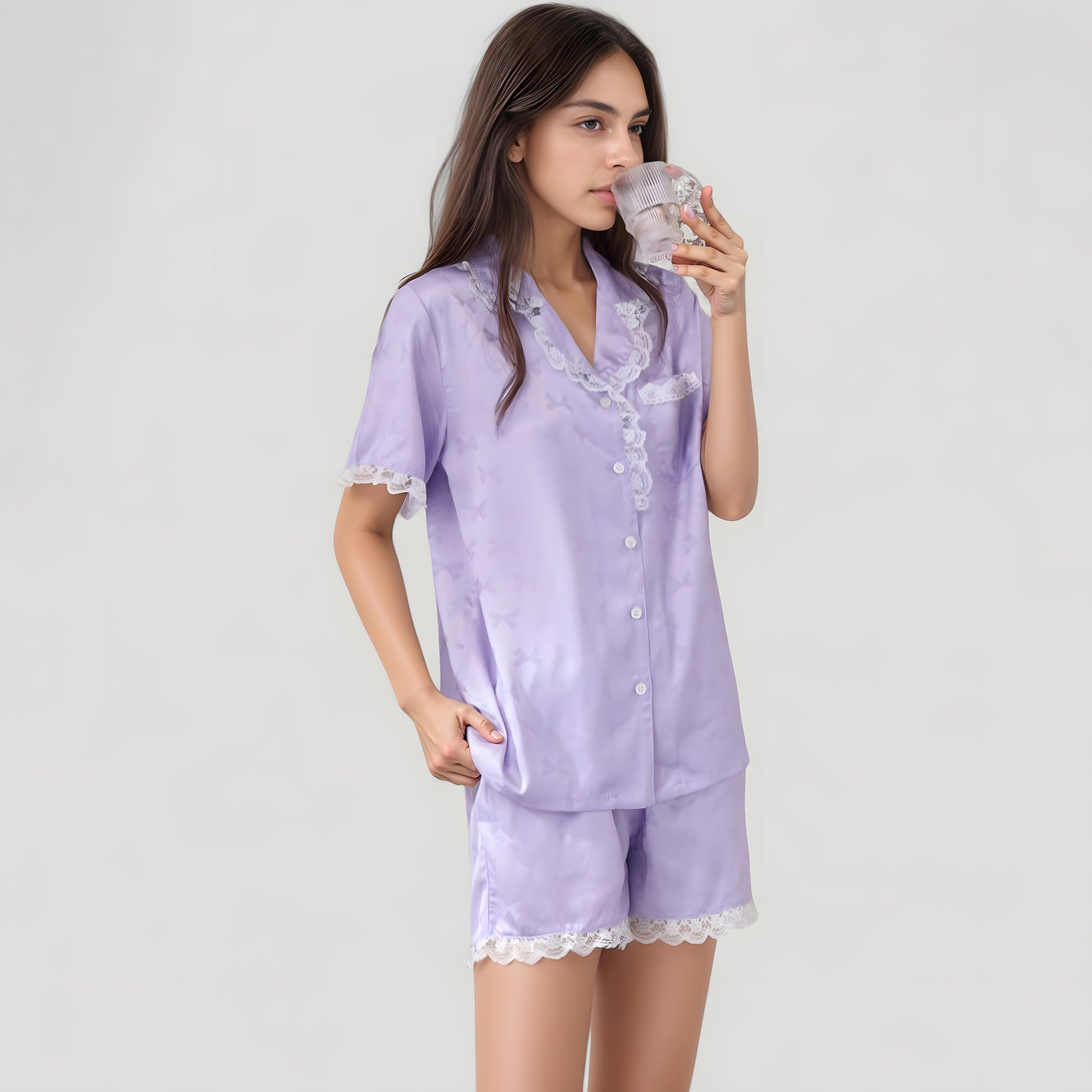 The Anna-Kaci Women's Satin Pajama Set blends luxurious comfort and soft feminine charm. This two-piece set includes a short sleeve button-down top with lace trim along the collar and sleeves, paired with matching elastic waist shorts. The silky satin fabric drapes gently on the body, offering a breathable, lightweight feel. Elegant lace accents add a romantic touch, perfect for winding down in effortless style.