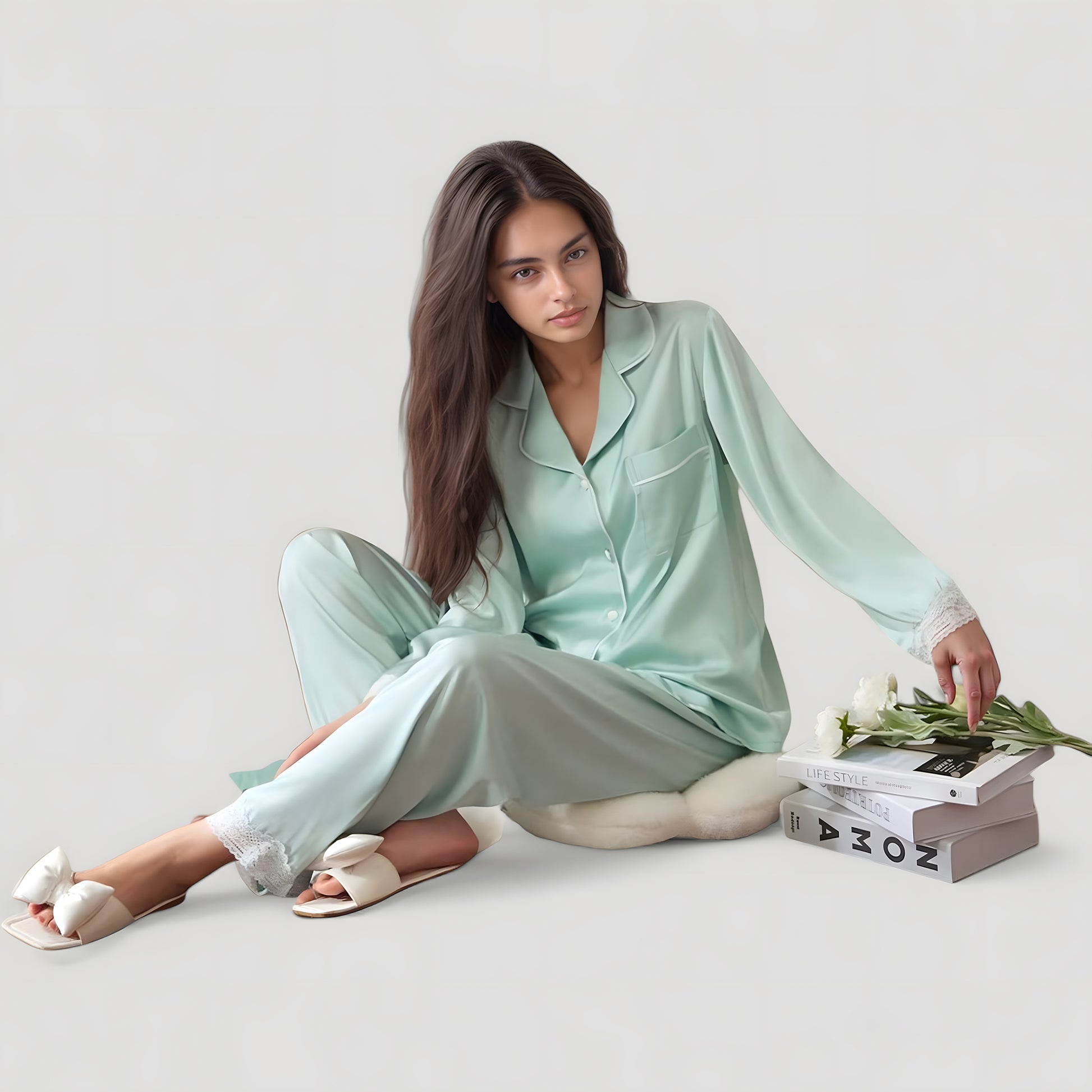 The Anna-Kaci Women's Satin Long Sleeve Pajama Set blends elegance and ease with its smooth, luxurious fabric and delicate lace accents. This two-piece set features a relaxed-fit button-down top with a chest pocket and matching full-length pants. Soft lace trim at the cuffs and hems adds a refined touch, making this sleepwear both comfortable and beautiful. Ideal for cozy nights in or elevated loungewear at home.