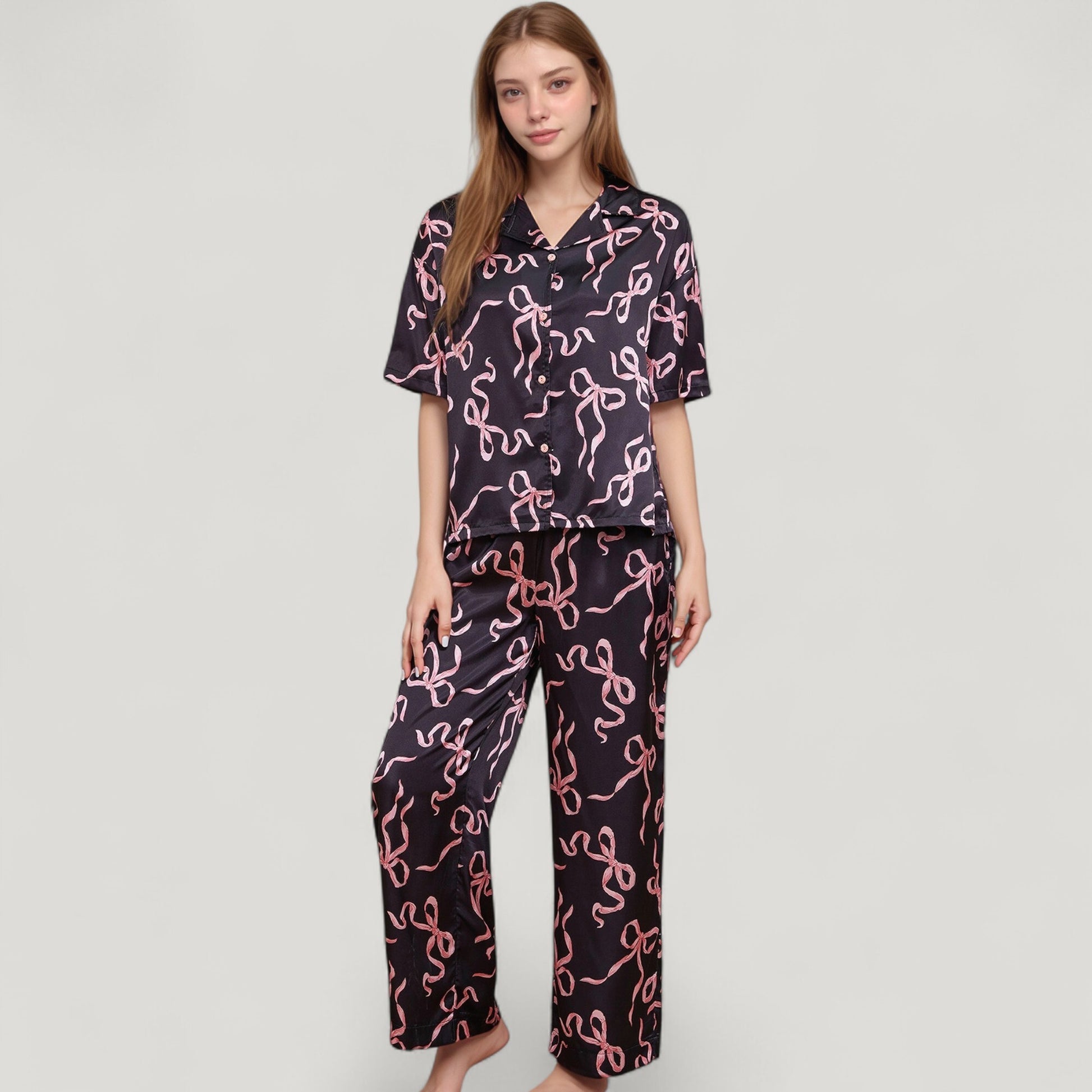 Anna-Kaci Lounge Women's Satin Button-Up Pajama Set with Short Sleeve Notch Collar Top and Wide Leg Pants in Ribbon Print