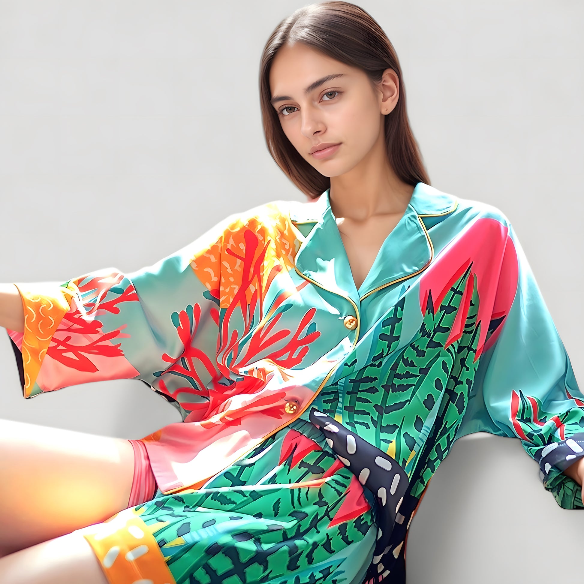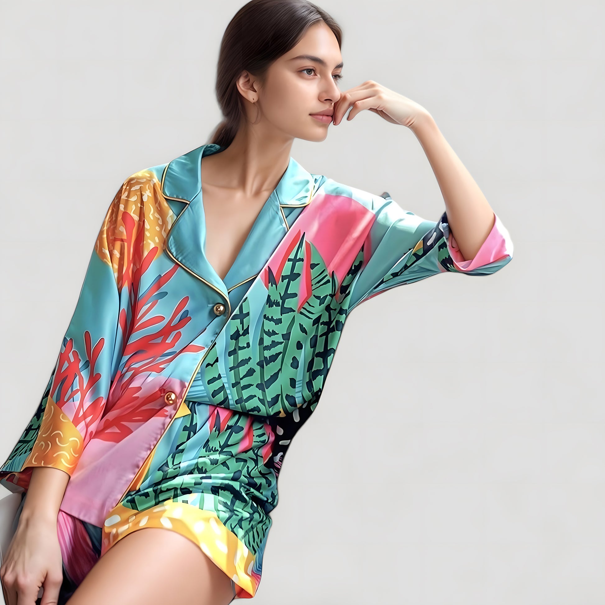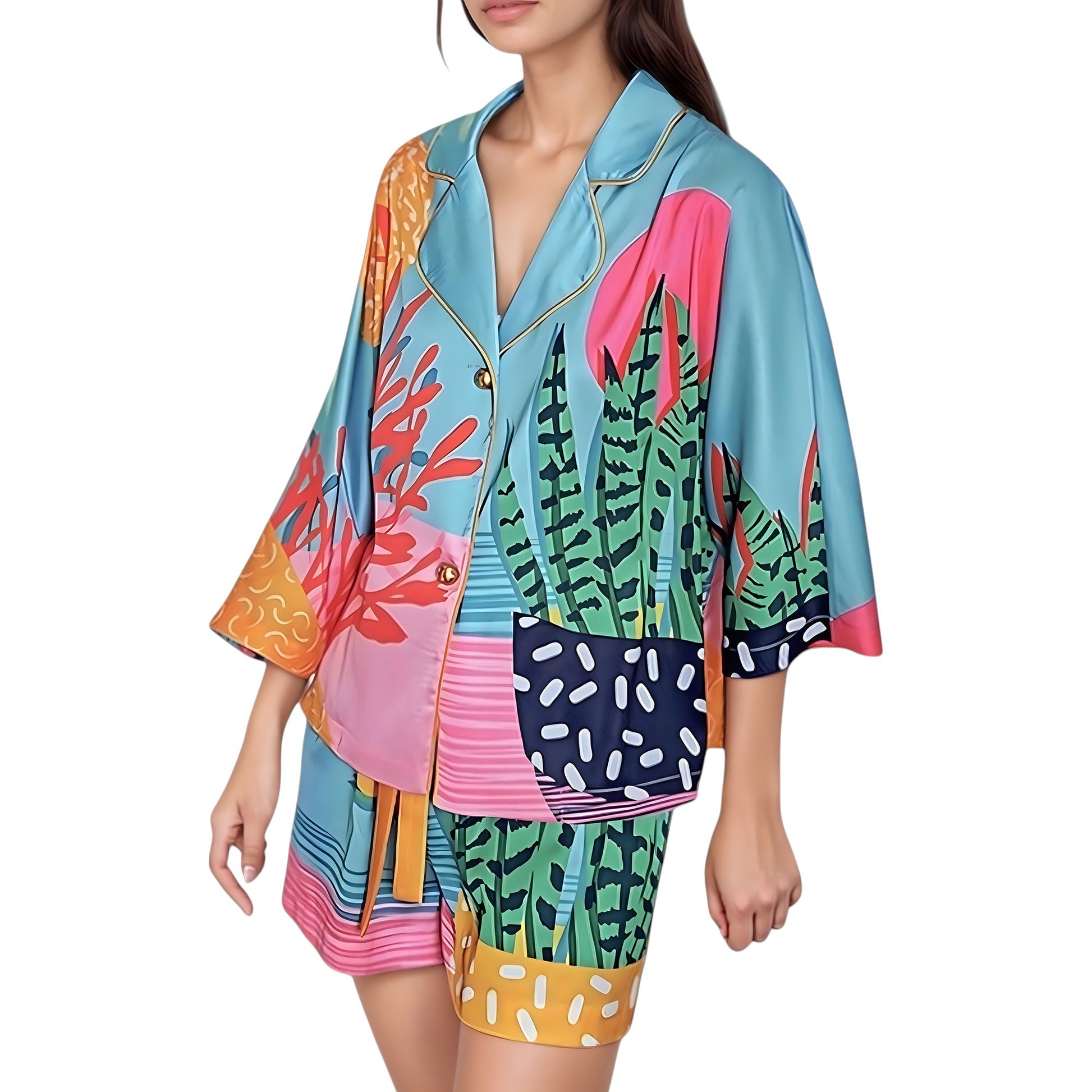 Anna-Kaci Lounge Women's Bold Botanical Print Pajama Set with Long Sleeves Notch Collar Button Front and Matching Shorts