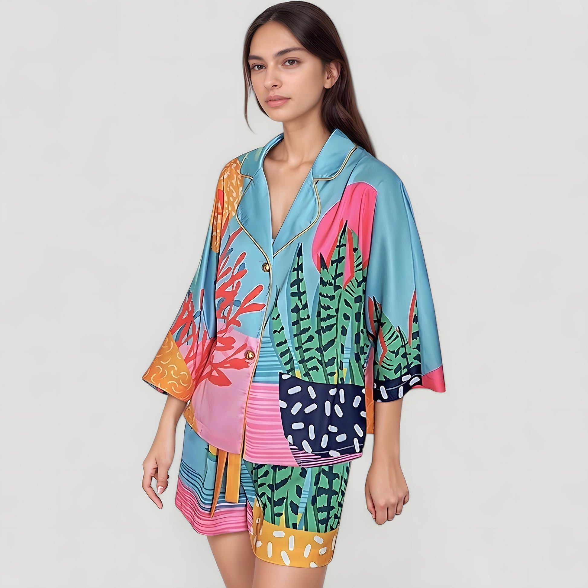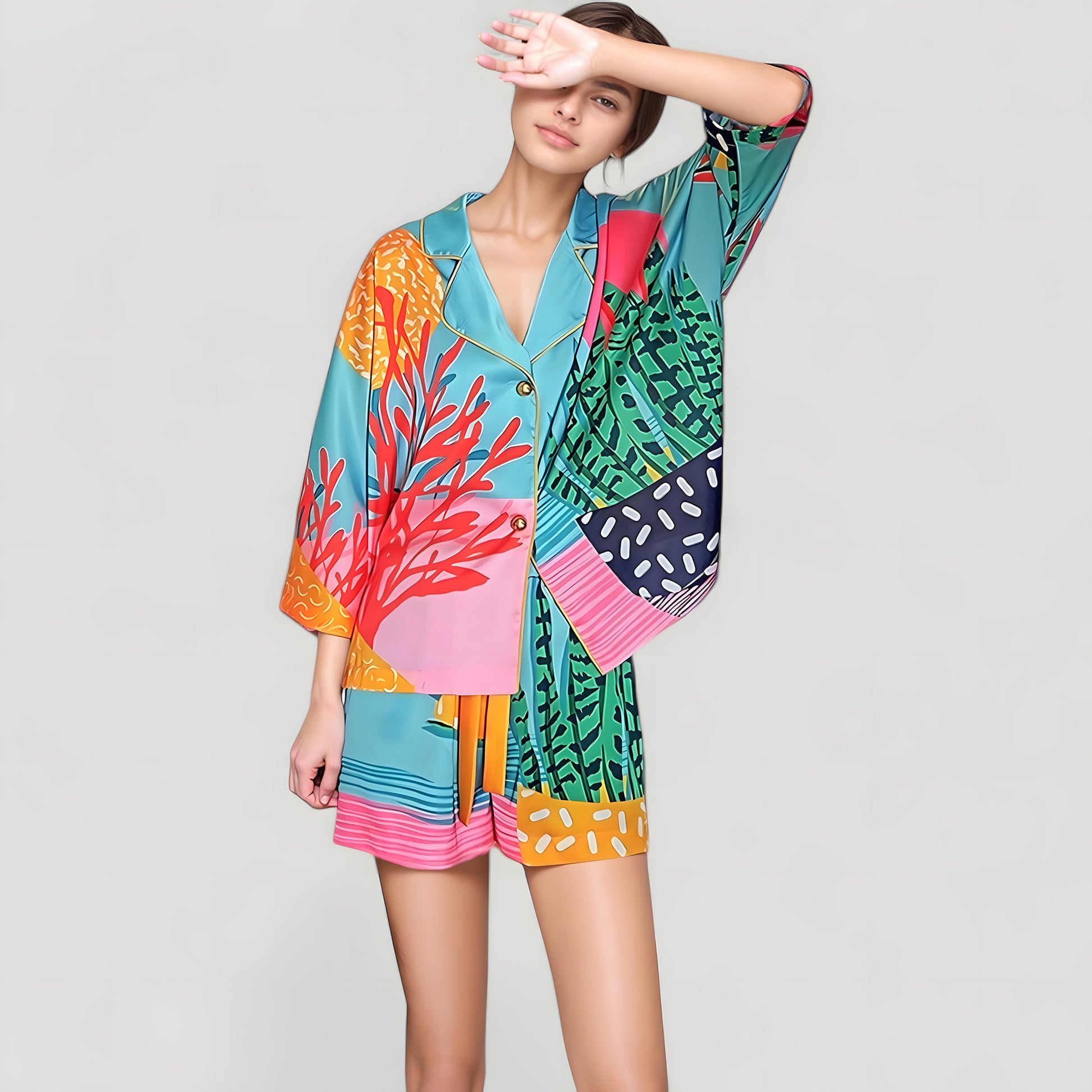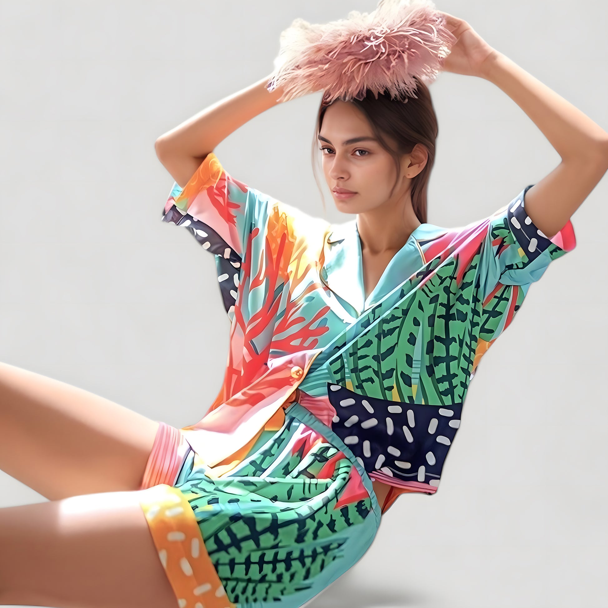 Anna-Kaci Lounge Women's Bold Botanical Print Pajama Set with Long Sleeves Notch Collar Button Front and Matching Shorts