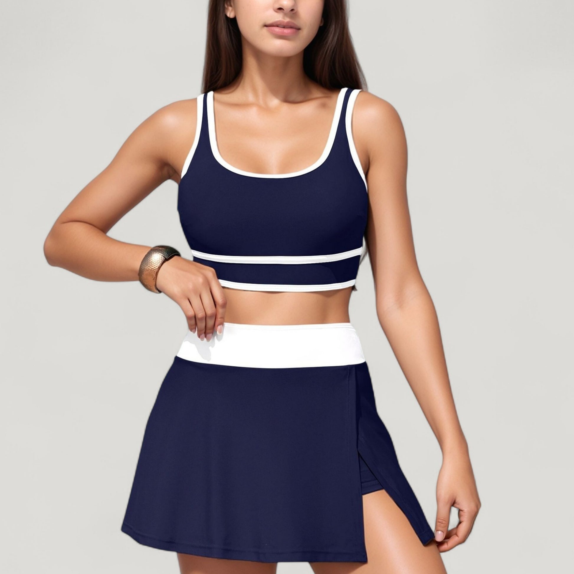 The Anna-Kaci Women's Two-Piece Swim Set features a sporty scoop neck bikini top paired with a high-waisted swim skirt with built-in briefs. Designed with striking contrast trim, this swim set combines modern athletic flair with flattering coverage. The stretch swim fabric is quick-drying and supportive, making it ideal for everything from poolside lounging to beach activities. This stylish set delivers confidence and comfort with every wear.