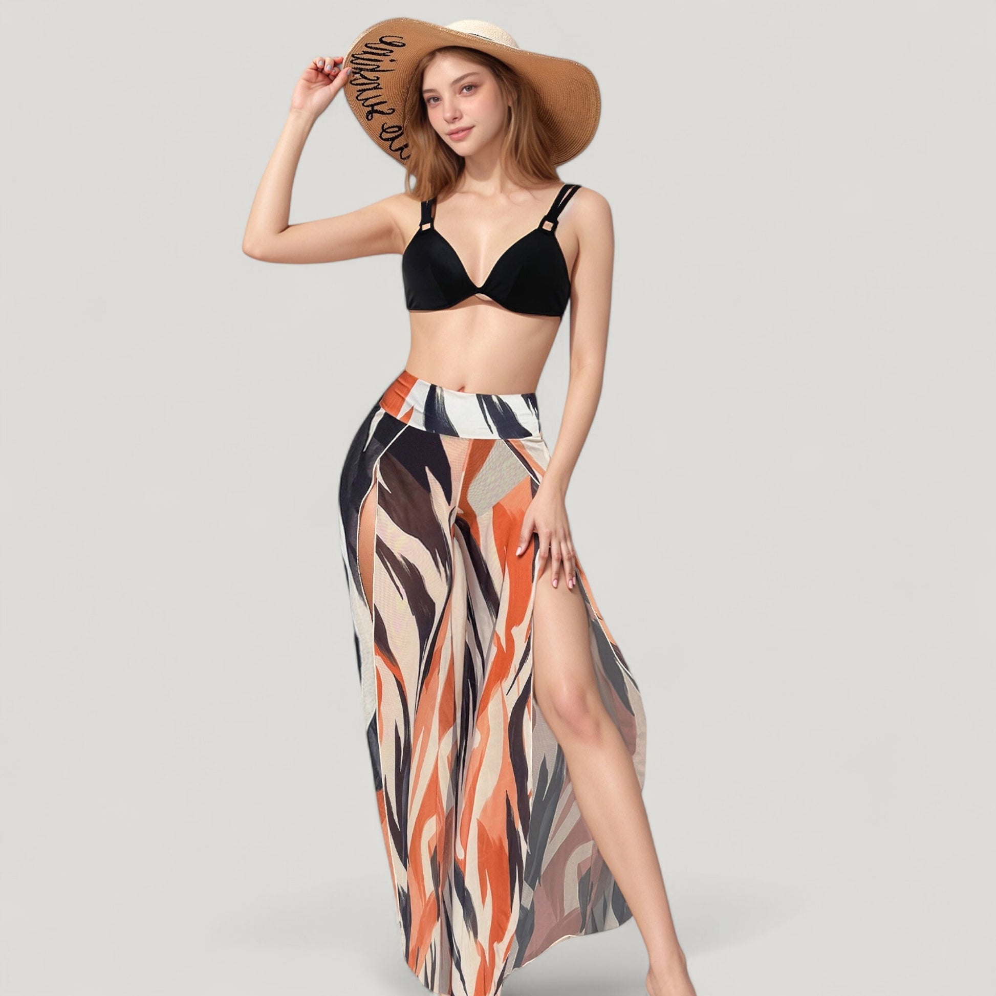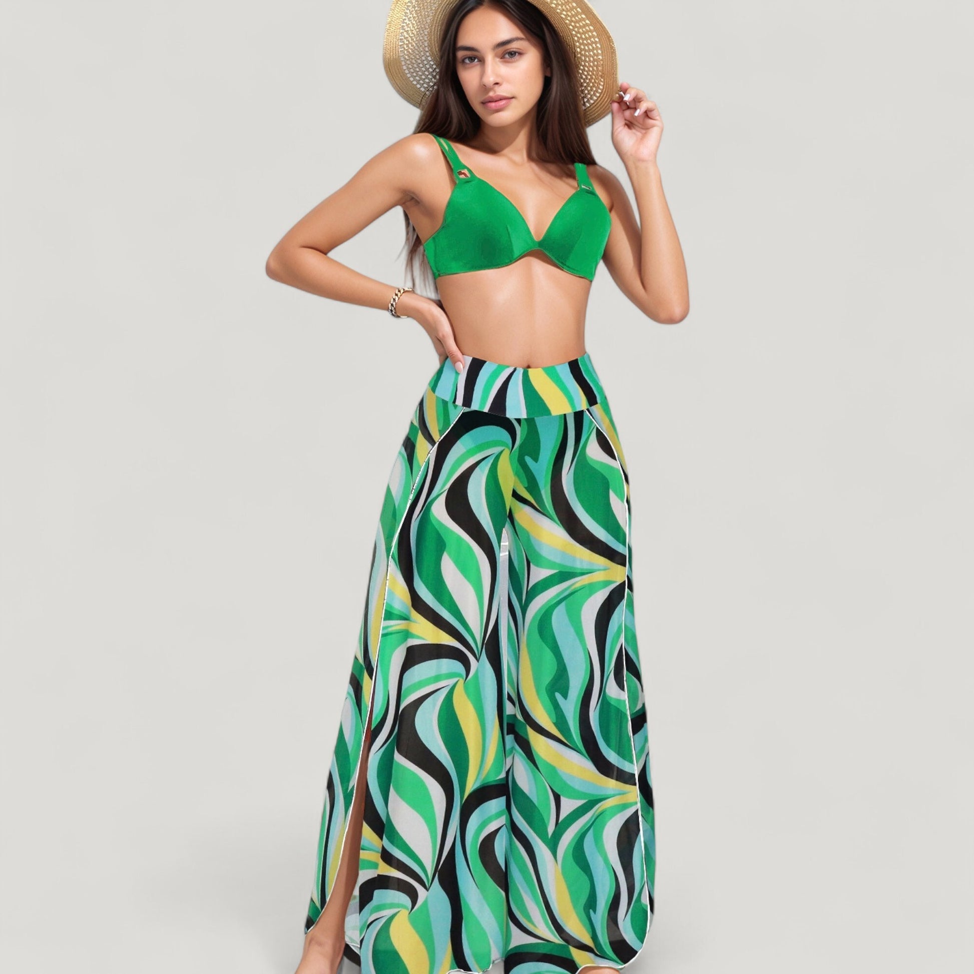 The Anna-Kaci Women's Three-Piece Swimsuit Set includes a flattering bikini top, matching high-waisted bottoms, and a dramatic pair of wide leg cover-up pants with a breezy abstract print. The top features adjustable straps with ring accents for added flair, while the high-rise bottoms offer full coverage and support. The lightweight mesh-like pants complete the look with bold movement and a resort-ready finish.