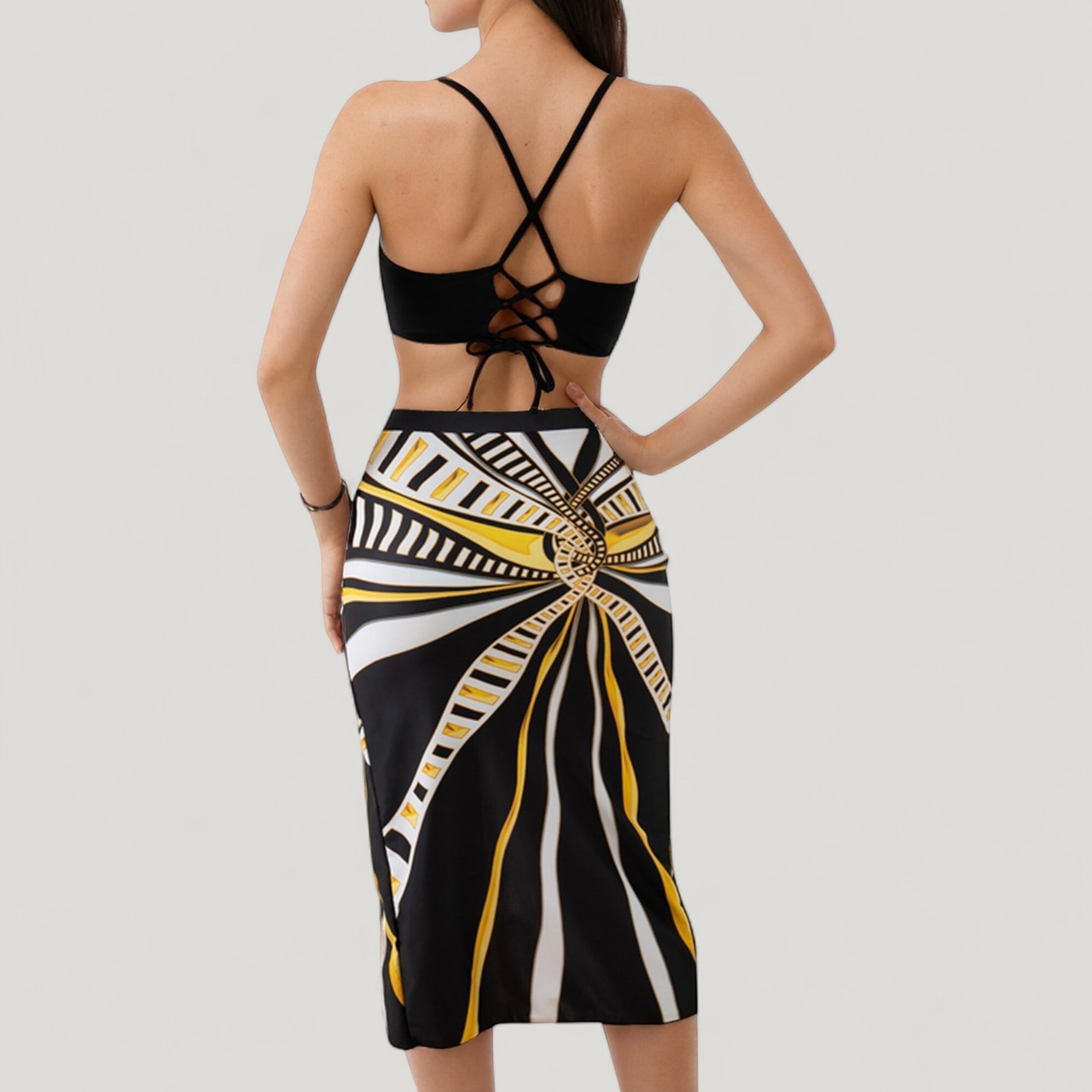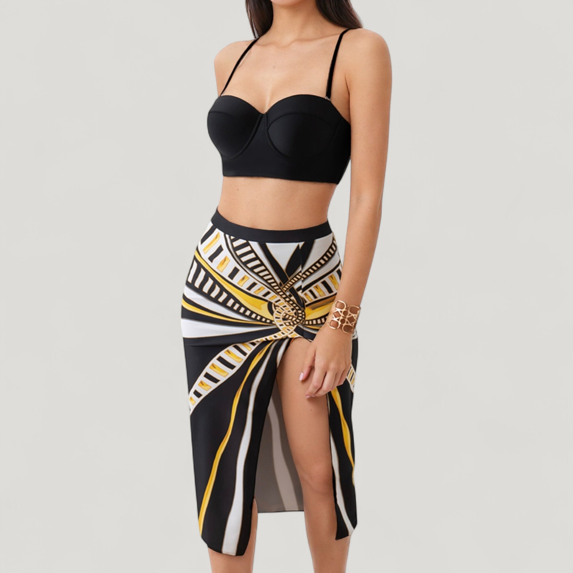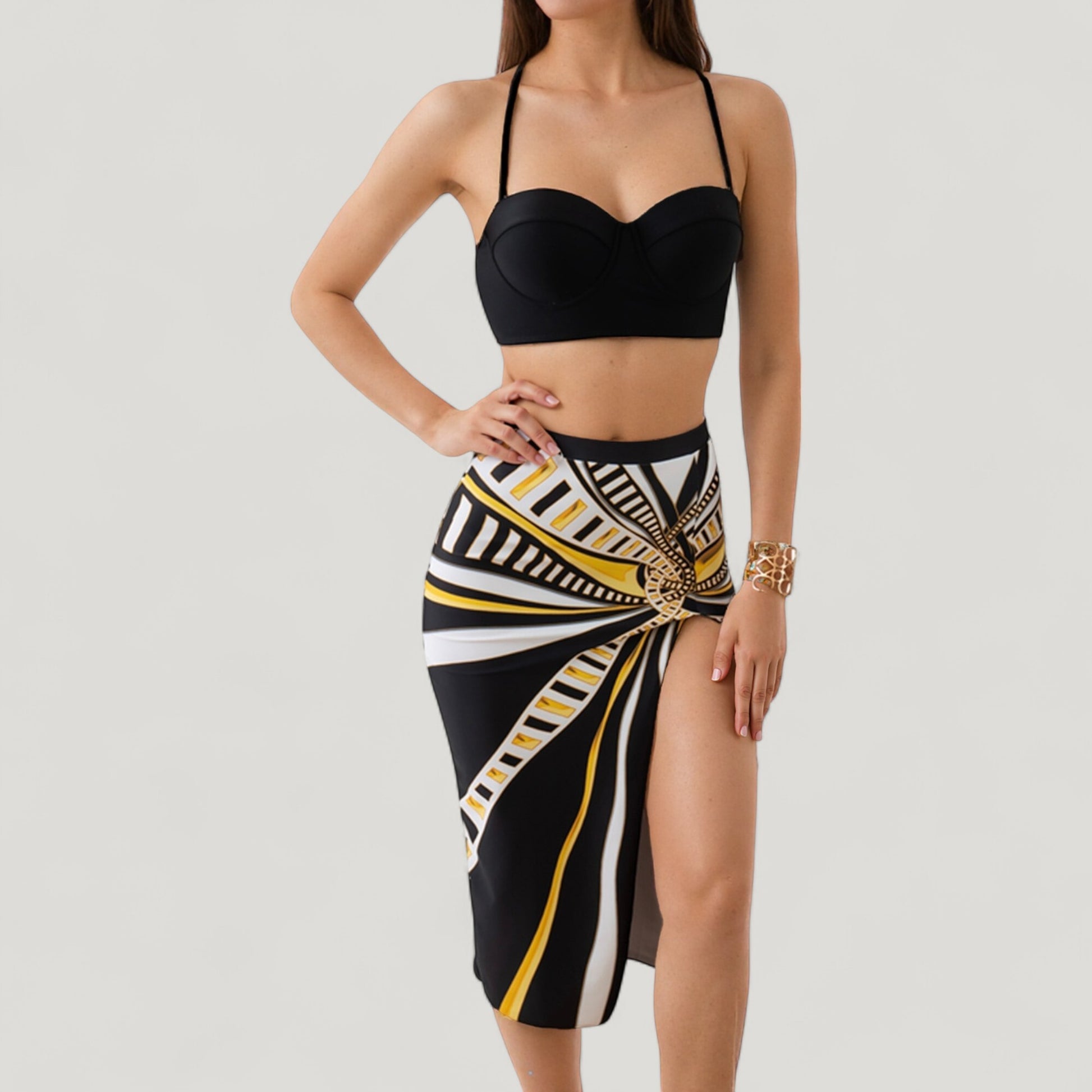 The Anna-Kaci Women's Three-Piece Swimsuit Set combines a chic underwire bikini top, flattering high waist bottoms, and a stylish midi skirt cover-up in a coordinating abstract print. The bikini top features adjustable straps and structured cups for added support, while the high-rise bottoms offer confident coverage. The side-slit skirt adds a polished layer perfect for transitioning from beach to boardwalk with effortless style.