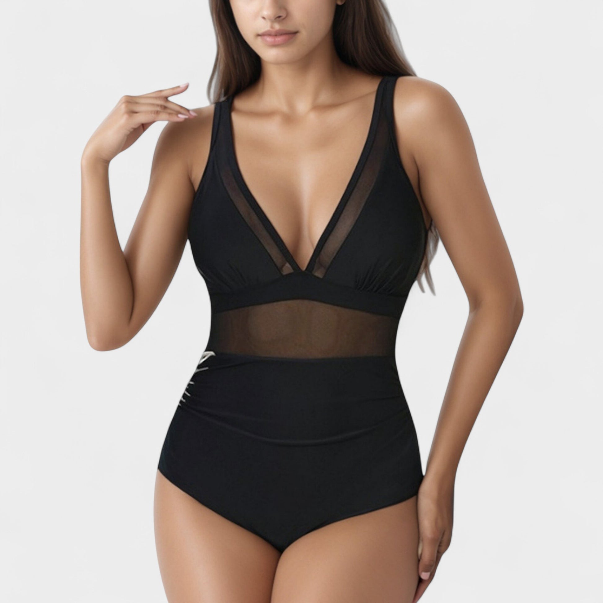 The Anna-Kaci Women's Deep V Mesh Panel One Piece Swimsuit features a plunging neckline with sheer mesh inserts for a sophisticated, modern look. Designed with a transparent waistband for added dimension, this suit combines elegance with a flattering fit. The supportive construction and adjustable straps ensure customizable comfort. Crafted from smooth stretch fabric, this swimsuit hugs your curves and delivers both style and confidence.
