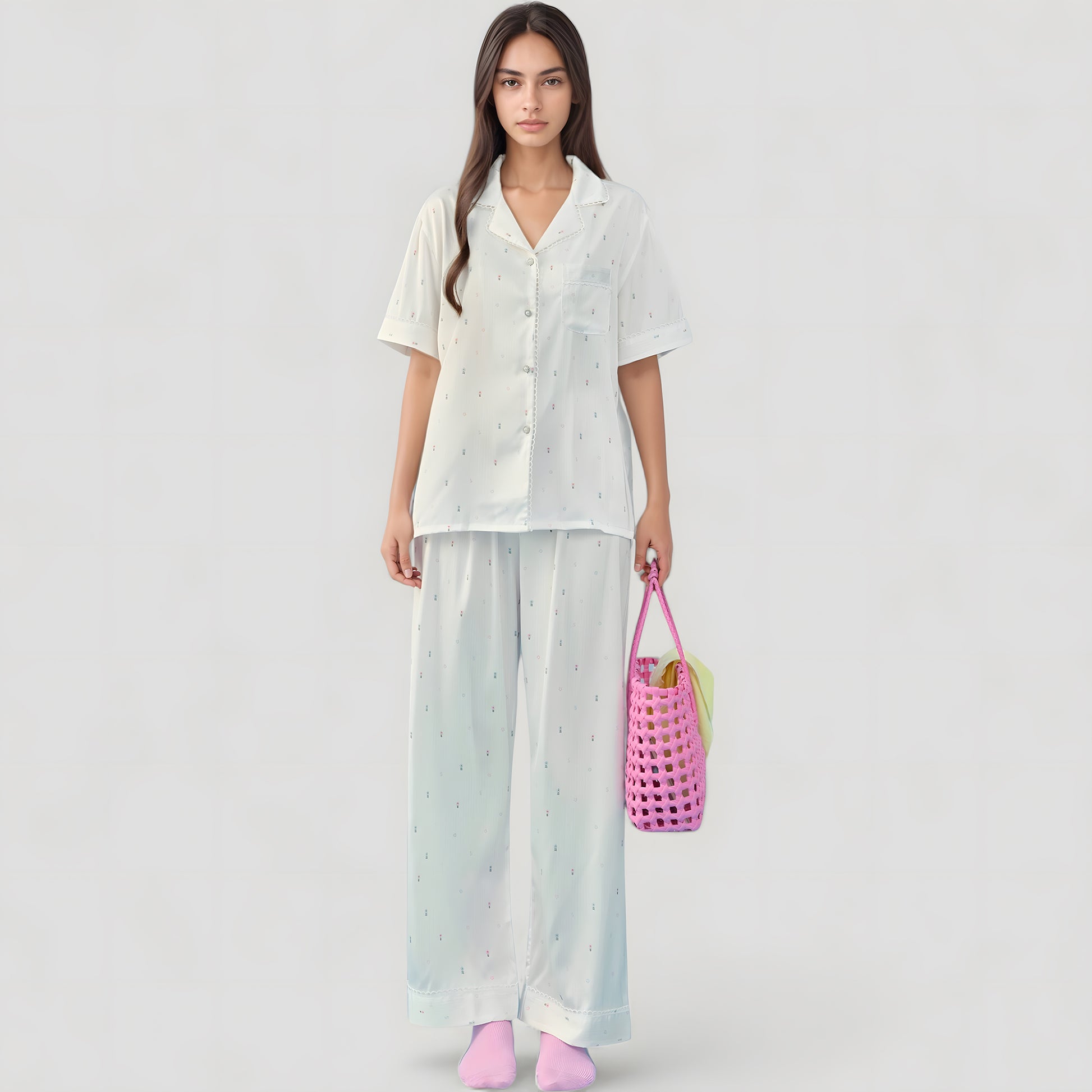 Anna-Kaci Lounge Women's Short Sleeve Button-Down Satin Pajama Set with Allover Mini Dot Print and Wide Leg Pants
