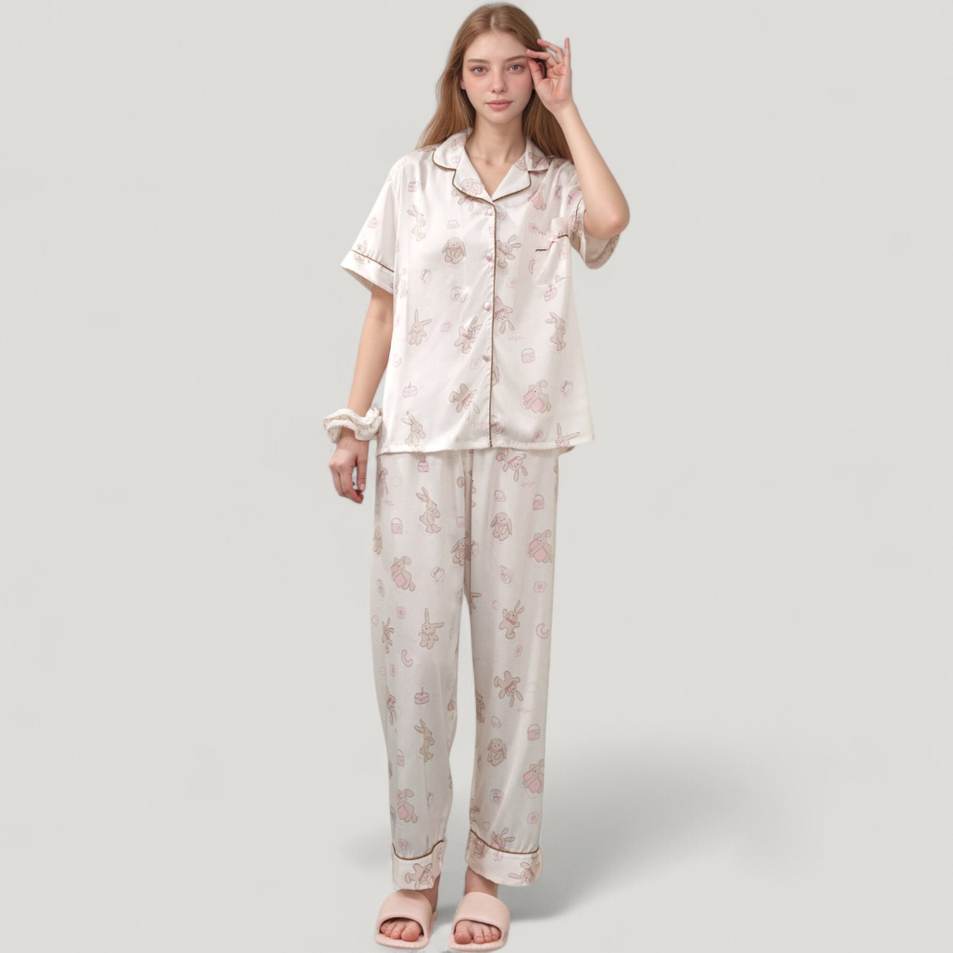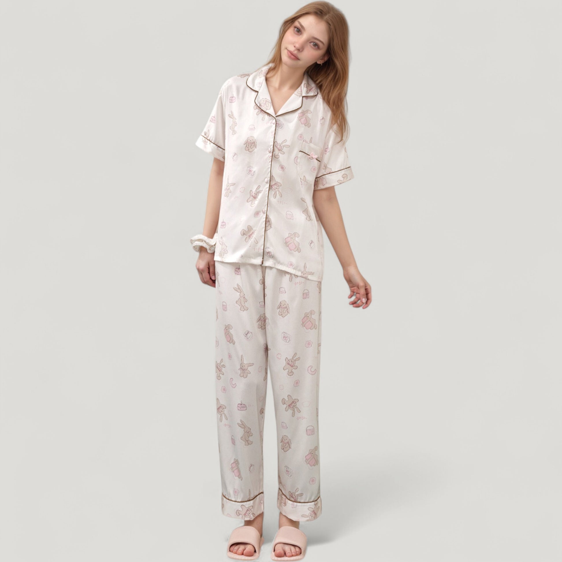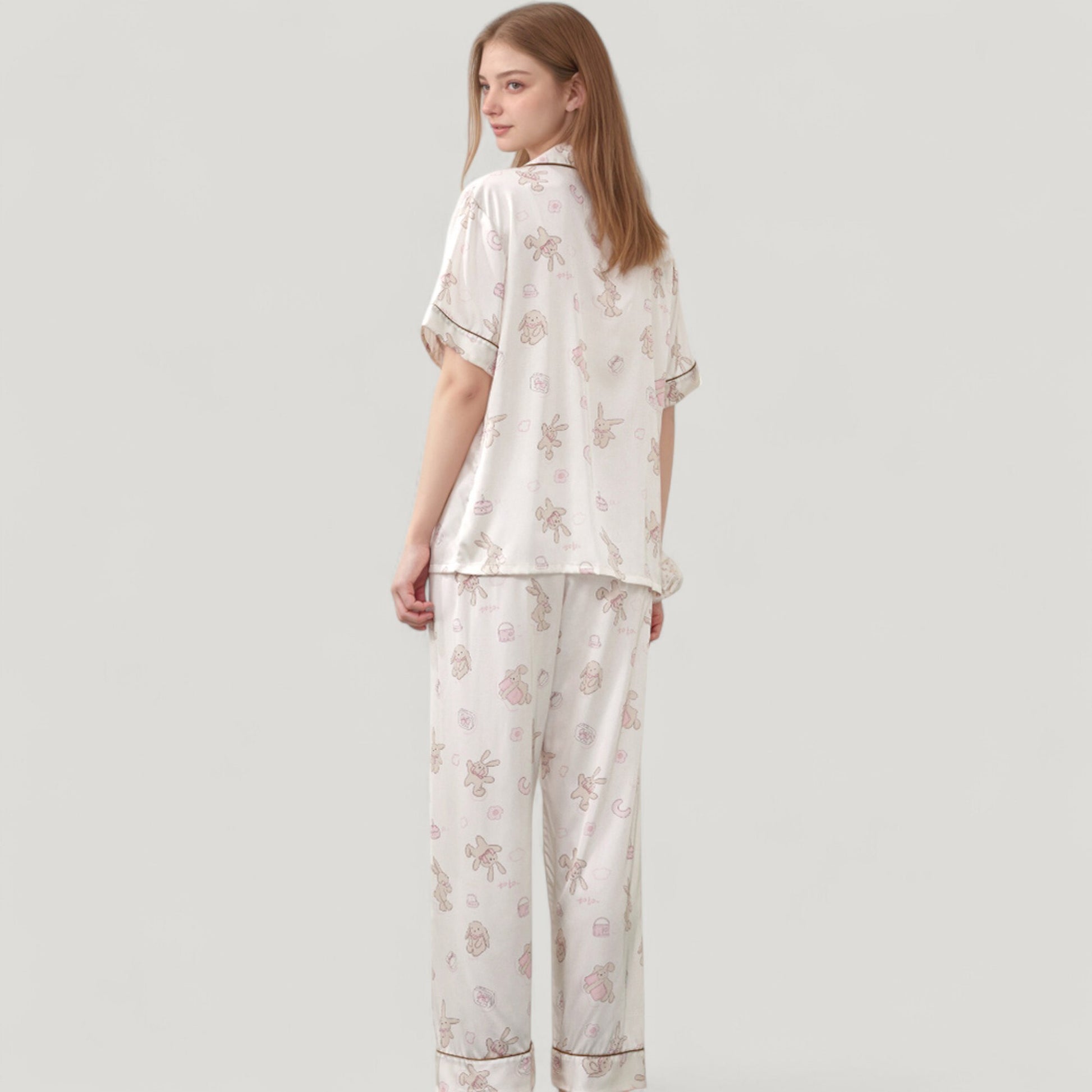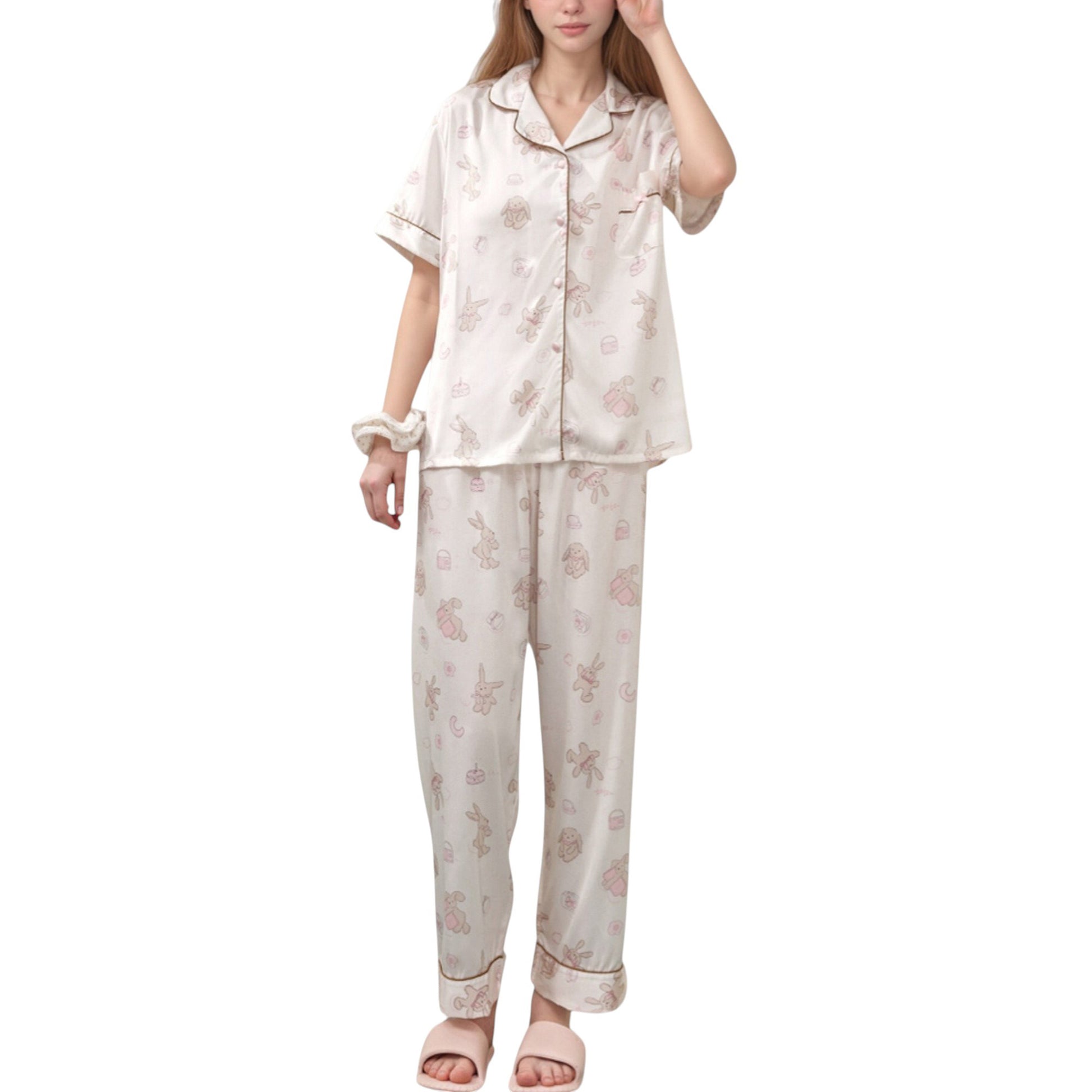Anna-Kaci Lounge Women's Cartoon Bunny Print Pajama Set with Short Sleeve Button-Up Top and Wide Leg Lounge Pants