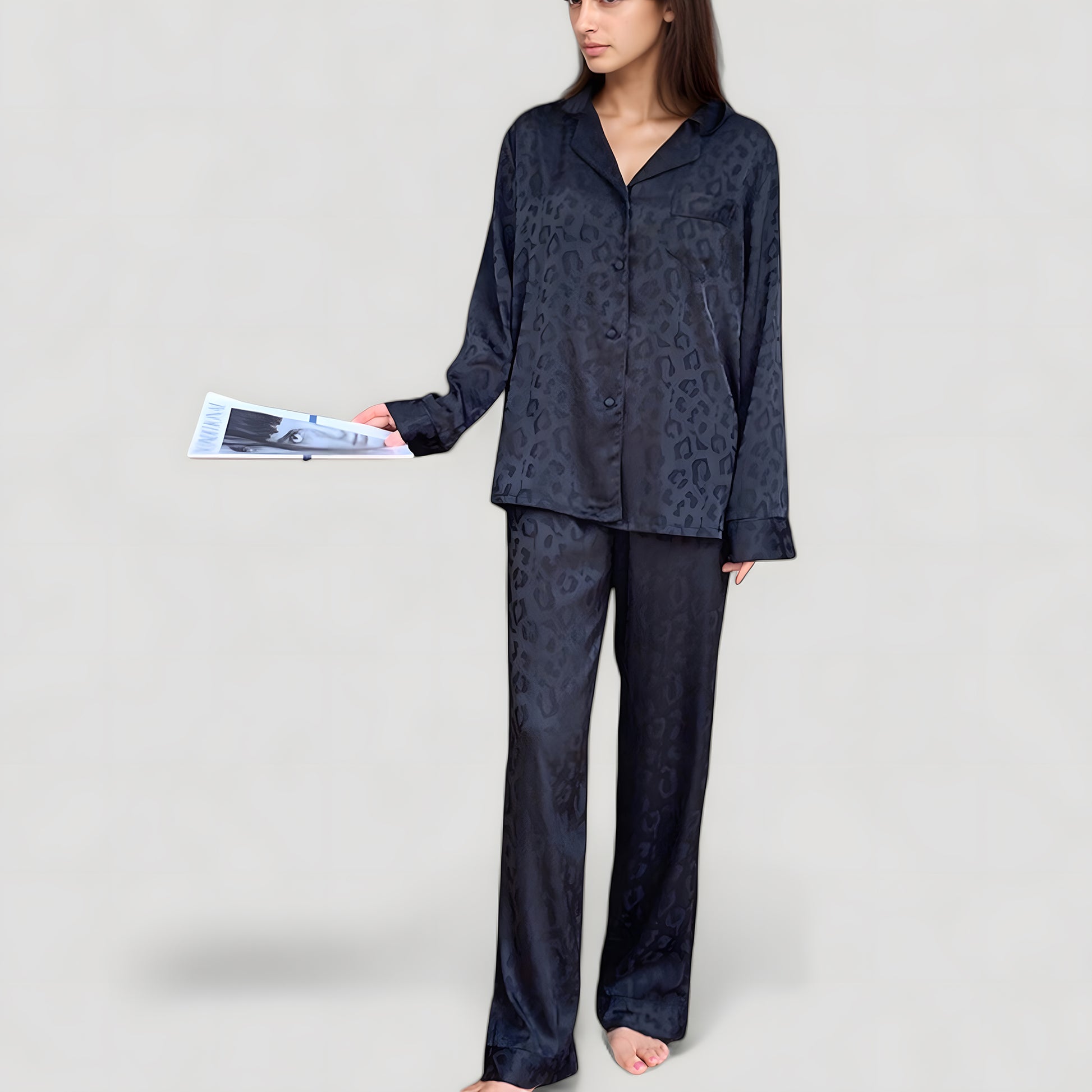 Anna-Kaci Lounge Women's Long Sleeve Button Up Pajama Set with Satin Leopard Texture and Relaxed Fit Pants