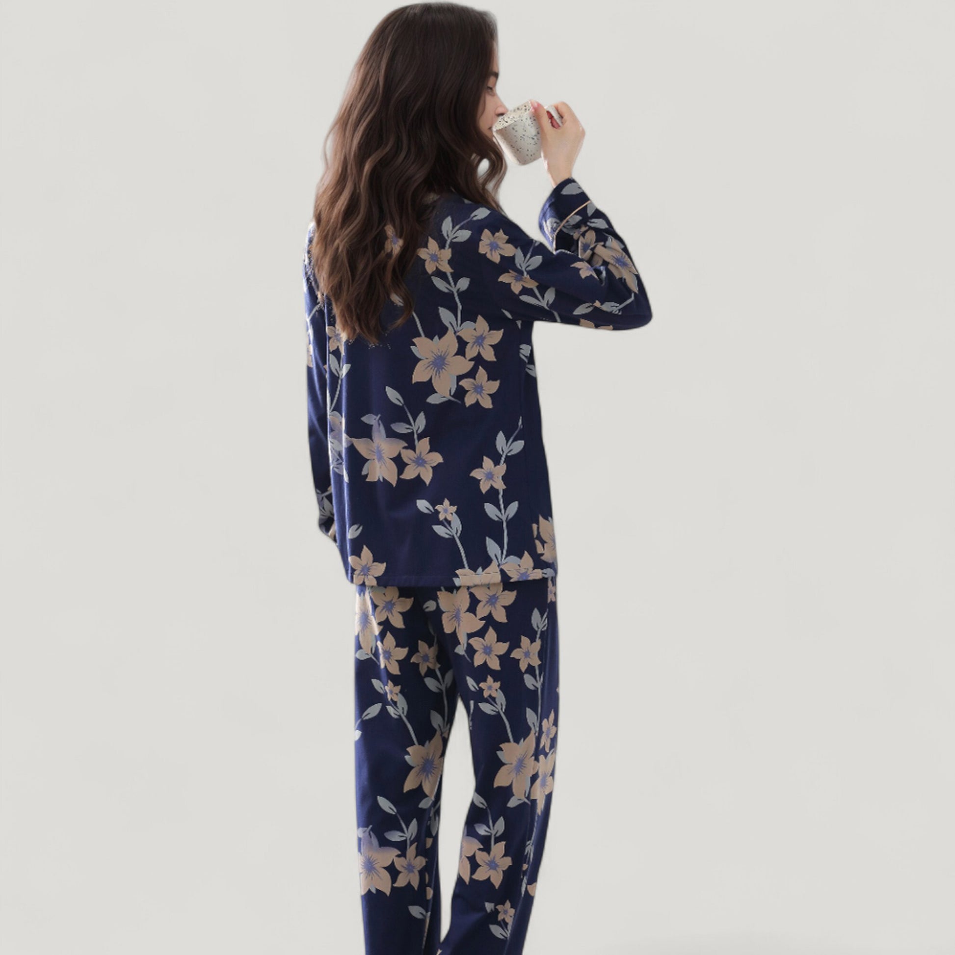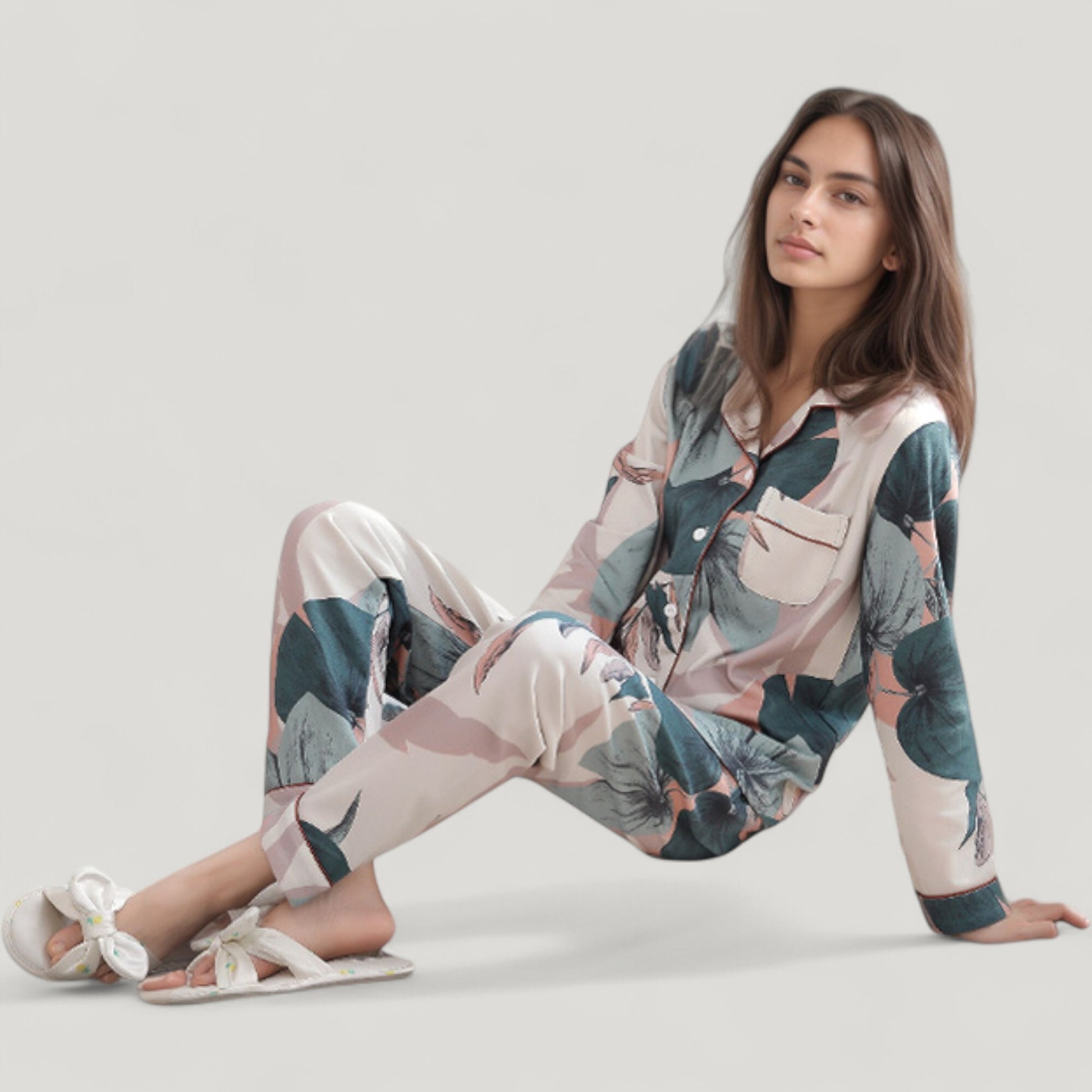 Anna-Kaci Lounge Women's Floral Print Satin Pajama Set Long Sleeve Button-Up Top with Contrast Piping and Matching Lounge Pants