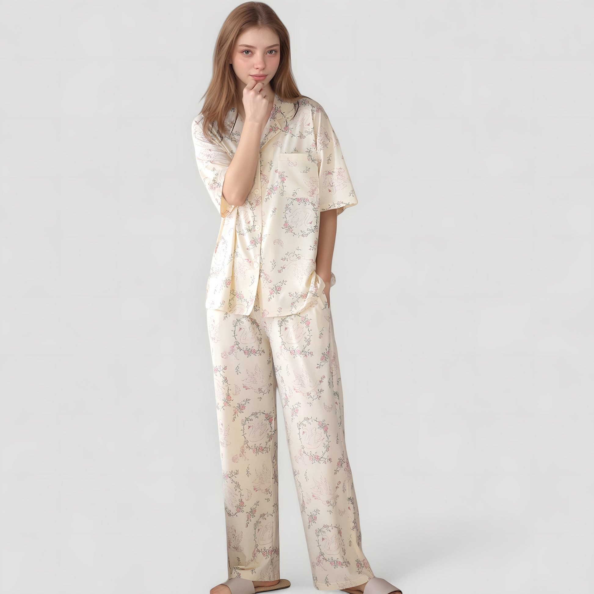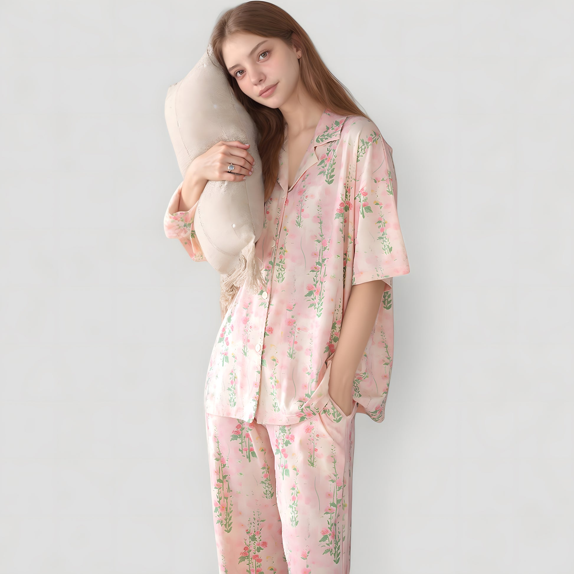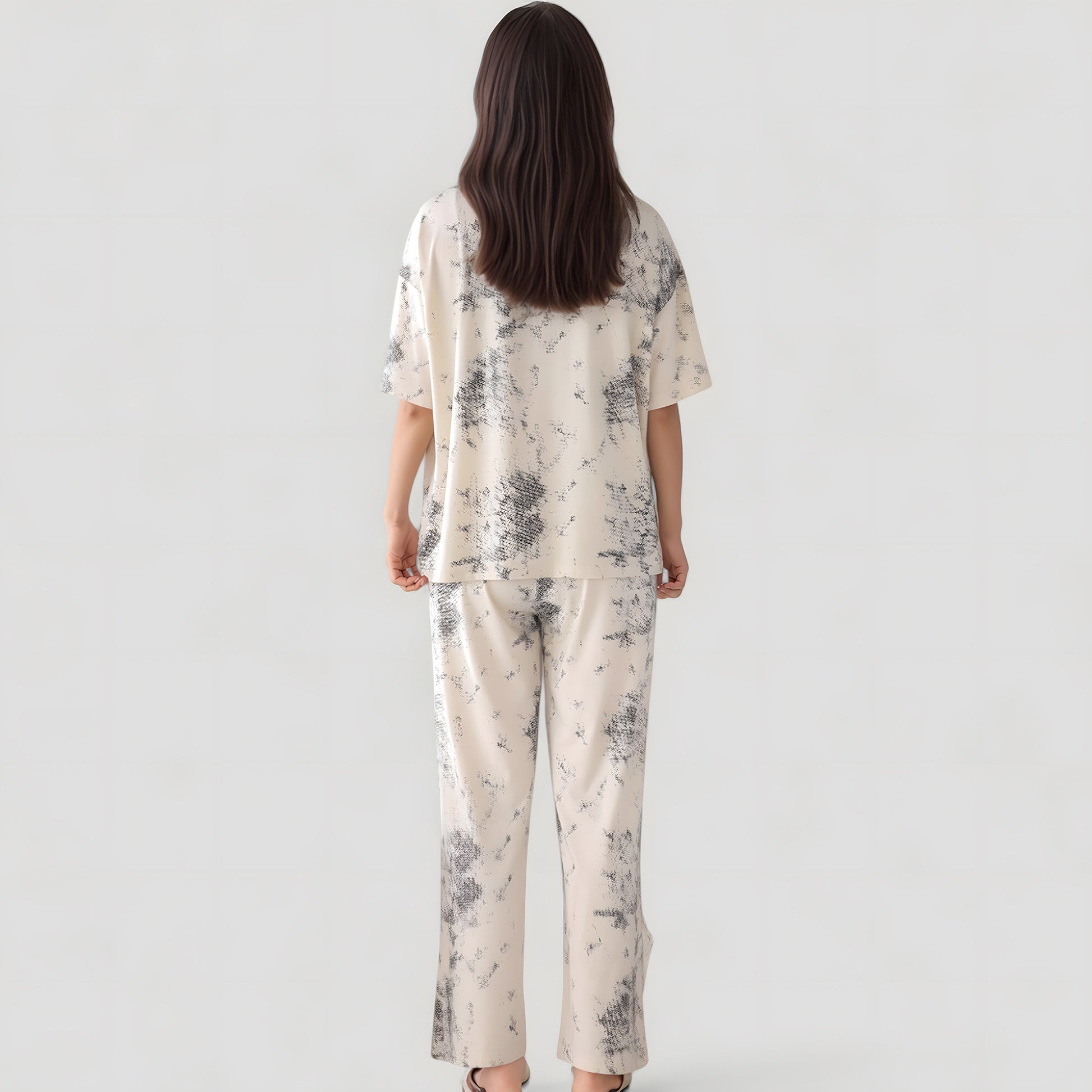 Anna-Kaci Lounge Women's Short Sleeve Watercolor Print Satin Pajama Set with Button Up Top and Wide Leg Pants