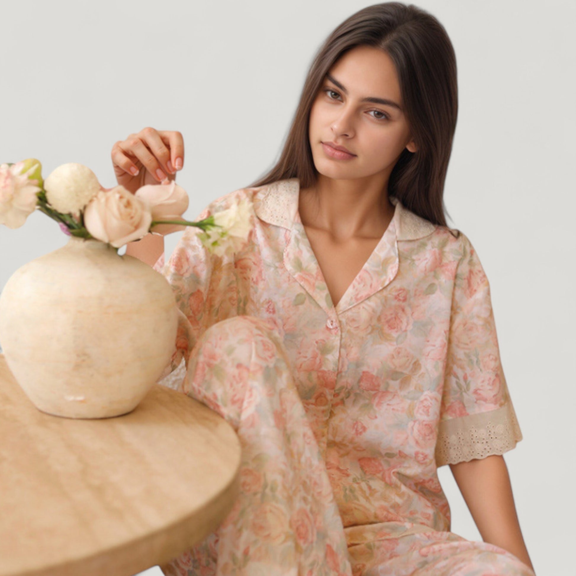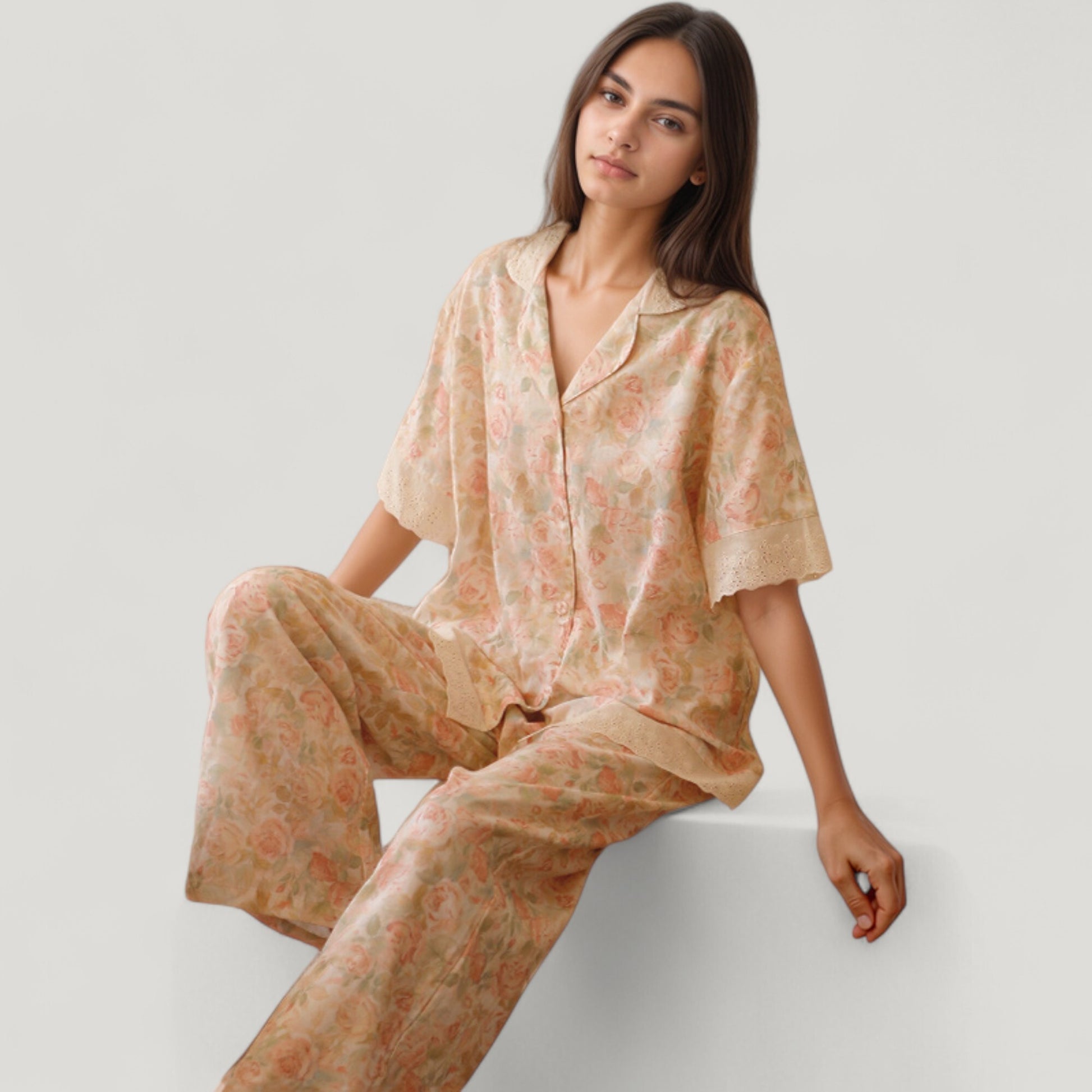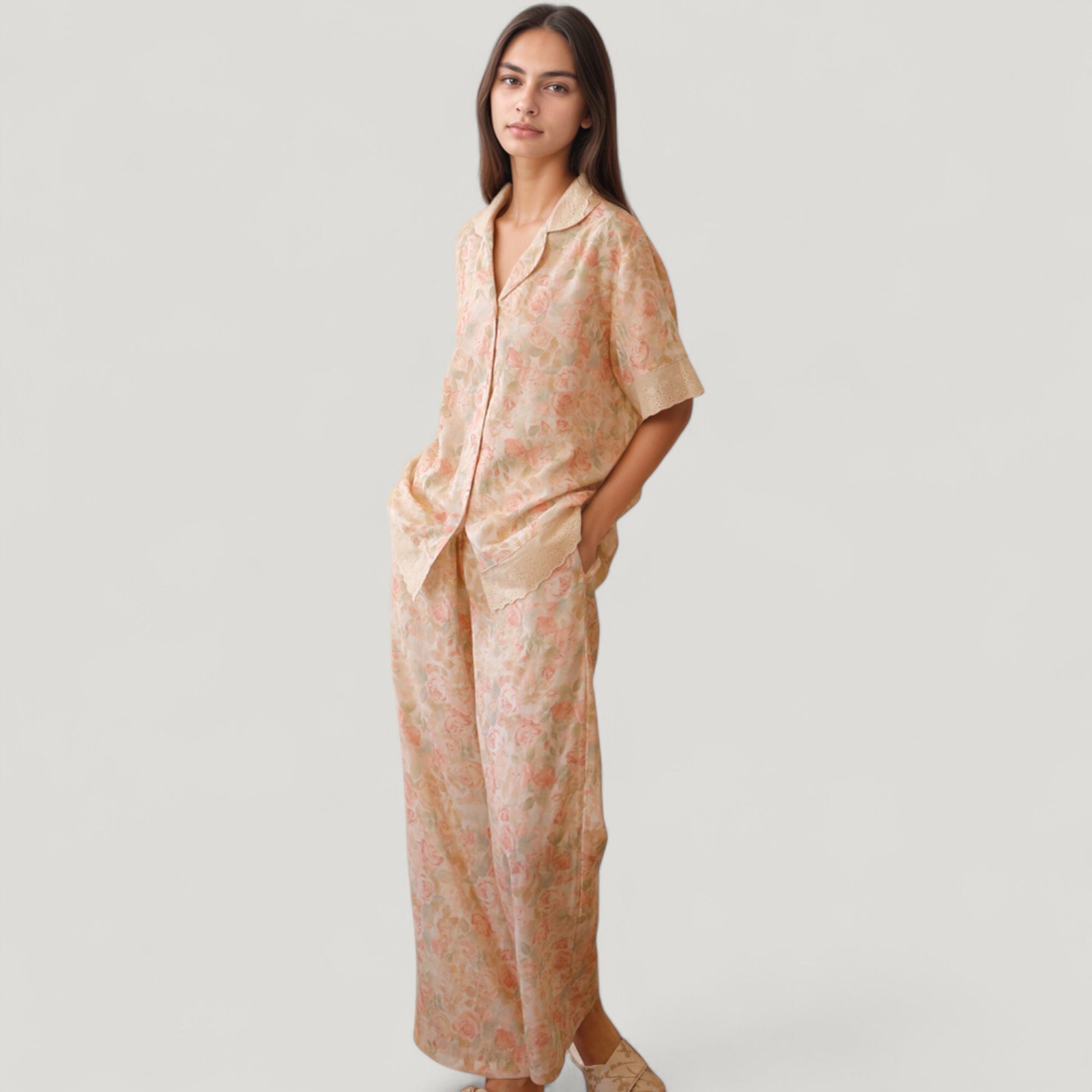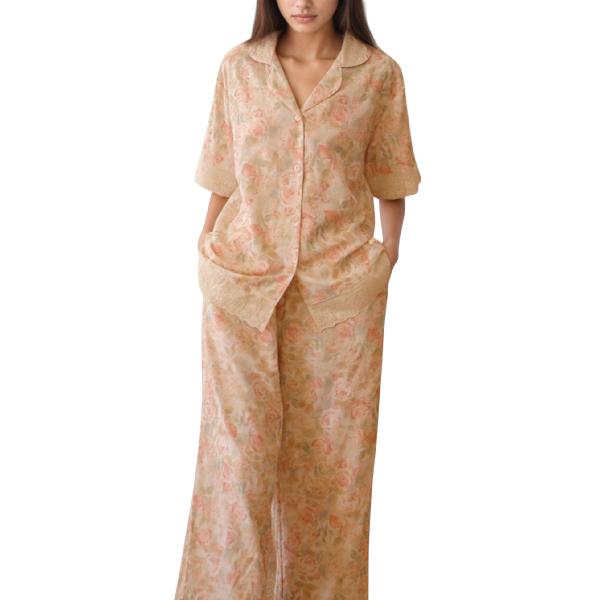 The Anna-Kaci Women's Floral Lace Trim Pajama Set brings a romantic vintage charm to your loungewear. This two-piece set features a delicate floral print and elegant lace trim along the sleeves, hem, and pockets. The short-sleeve button-up top pairs effortlessly with wide-leg pants for a flowing, graceful silhouette that¡¯s soft and breathable.