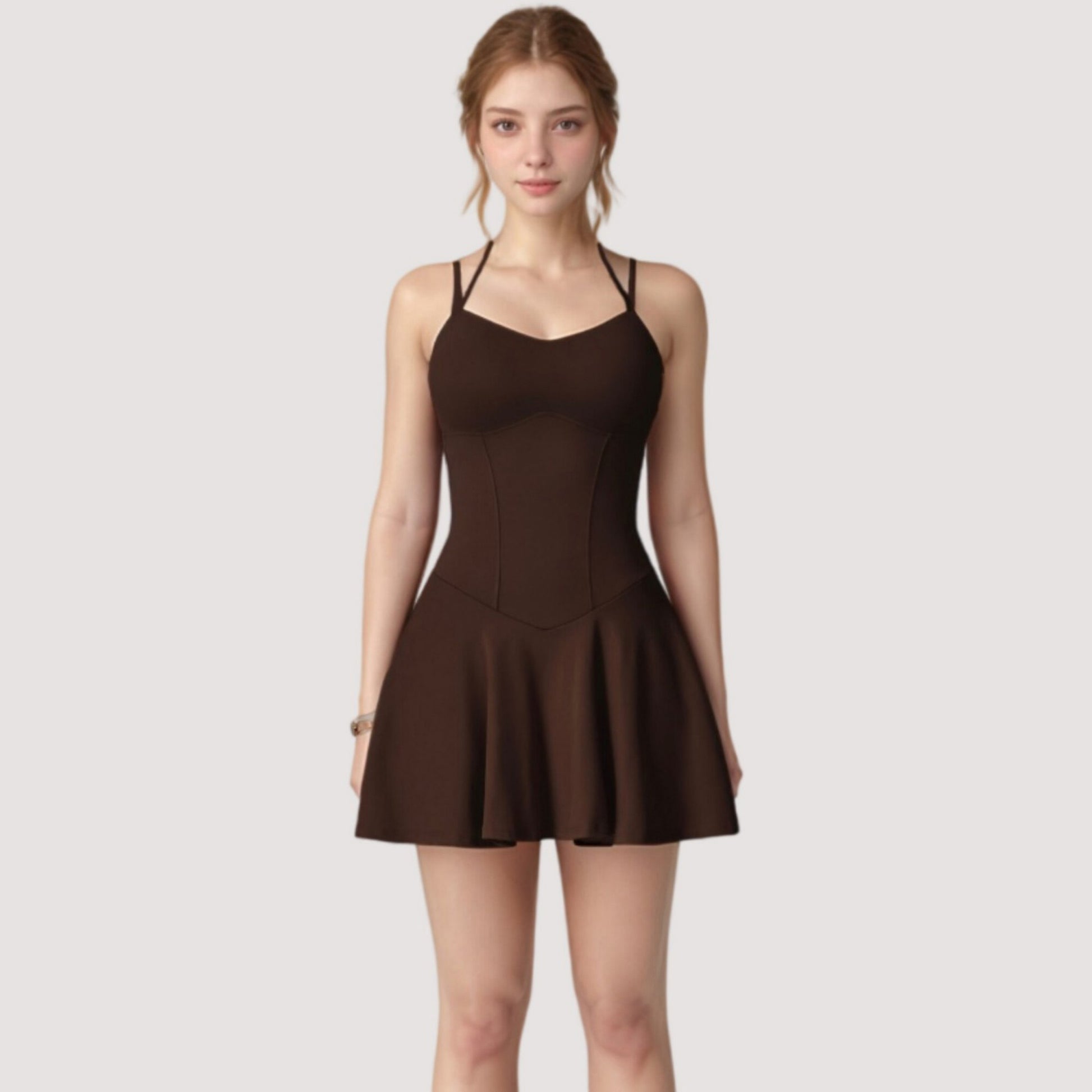 The Anna-Kaci Women's Strappy Athletic Dress offers sleek support with a fitted bodice and flared skirt overlaying comfortable built-in shorts. Designed with a stretchy, moisture-wicking fabric, this activewear dress features dual straps and a flattering neckline. A hidden side pocket in the shorts adds everyday practicality. Perfect for sporty routines or casual wear, this dress blends function with fashion effortlessly.