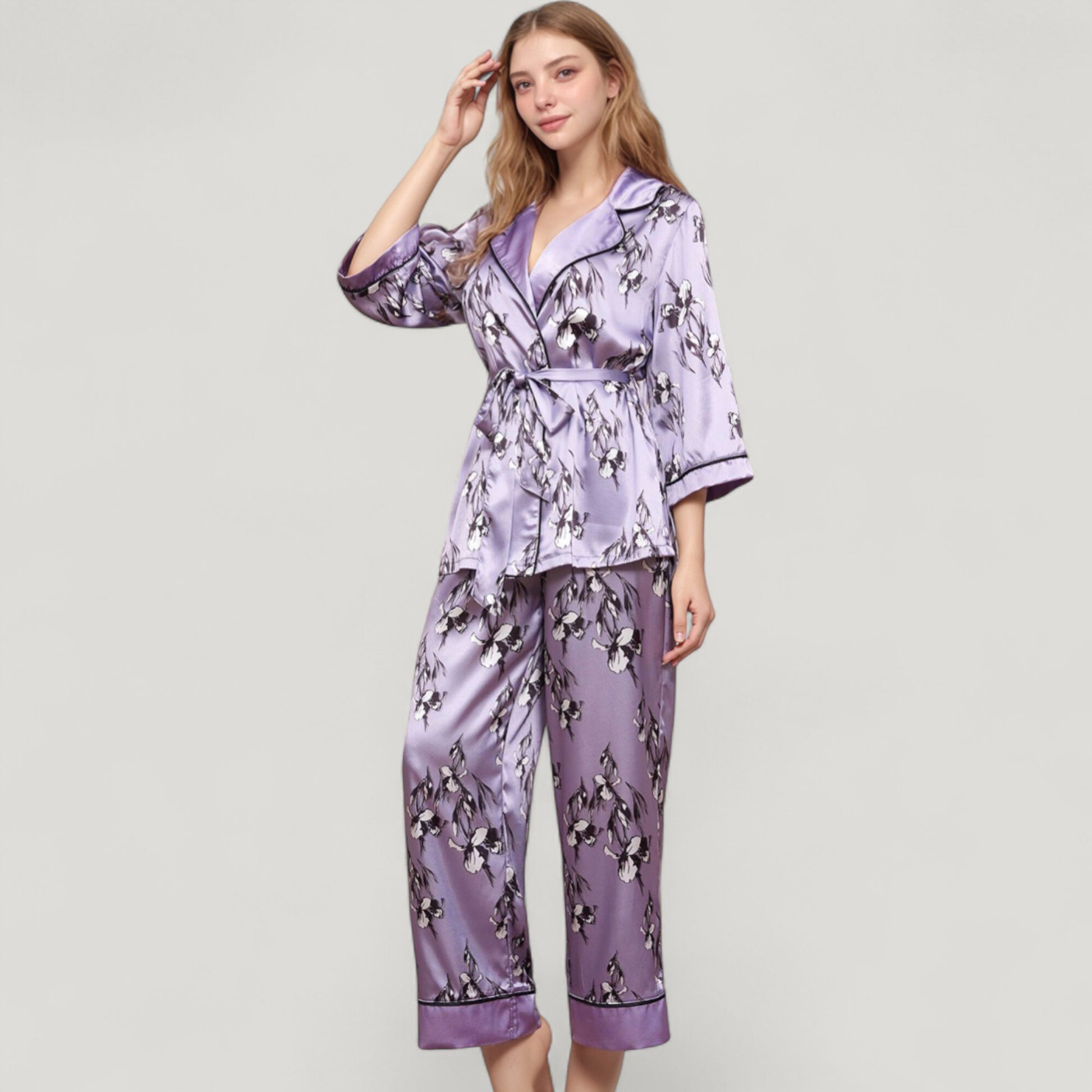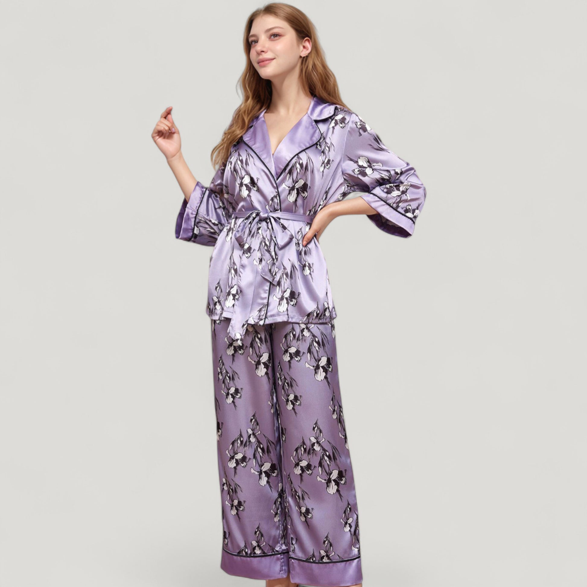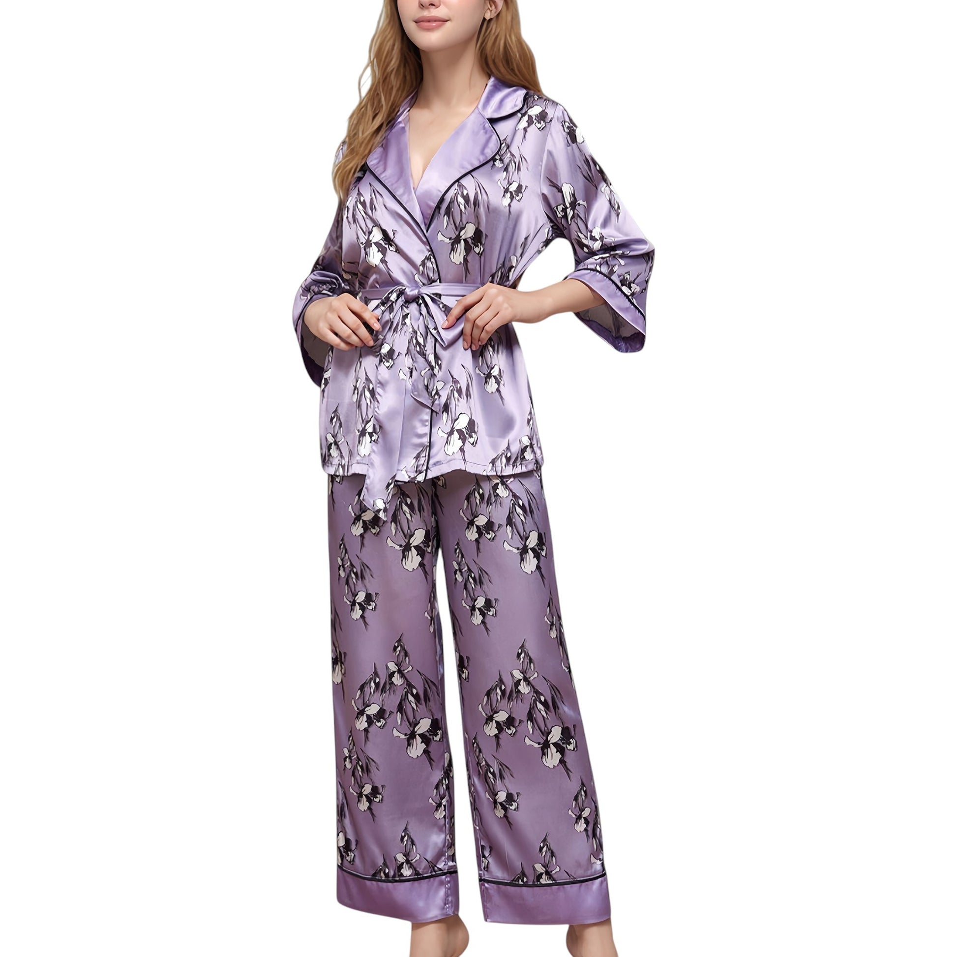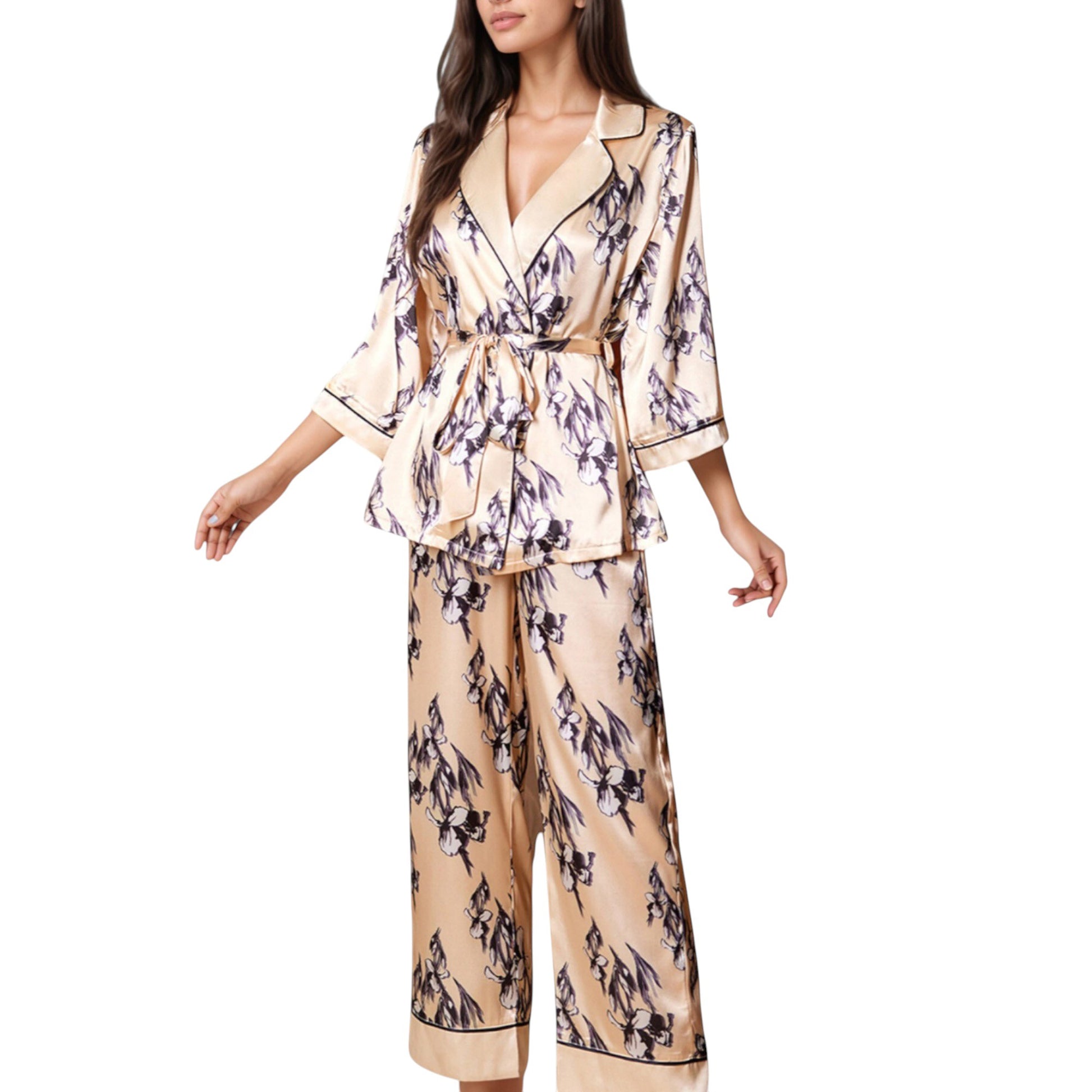 The Anna-Kaci Women's Floral Satin Pajama Set offers an elegant take on sleepwear with its silky-smooth fabric and romantic floral print. Featuring a relaxed-fit robe-style top with a wrap front, shawl collar, and self-tie waist, it combines style and comfort seamlessly. The matching wide-leg pants feature a graceful drape and piped trim hem for a polished finish. This coordinated two-piece set brings a touch of luxury to your loungewear collection.