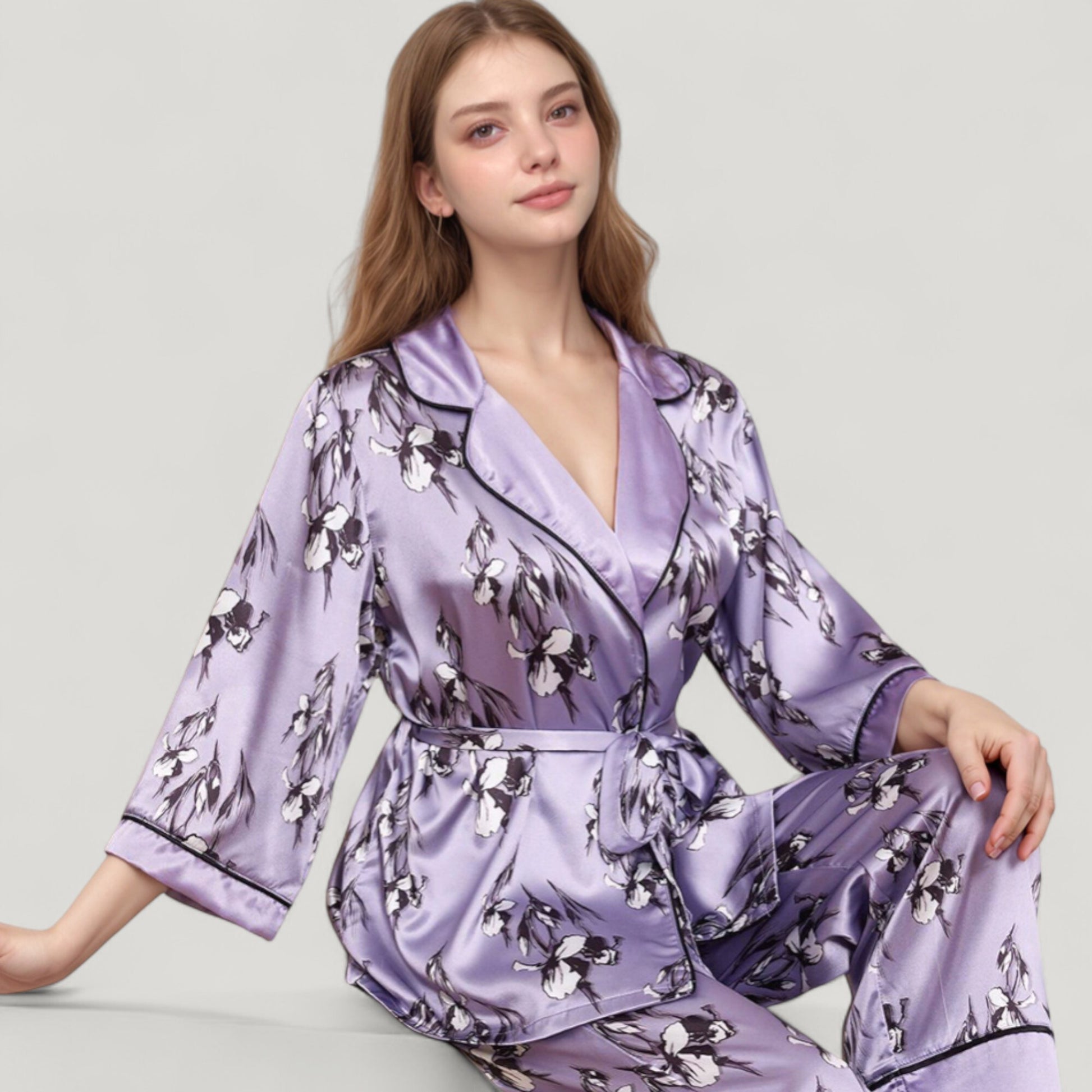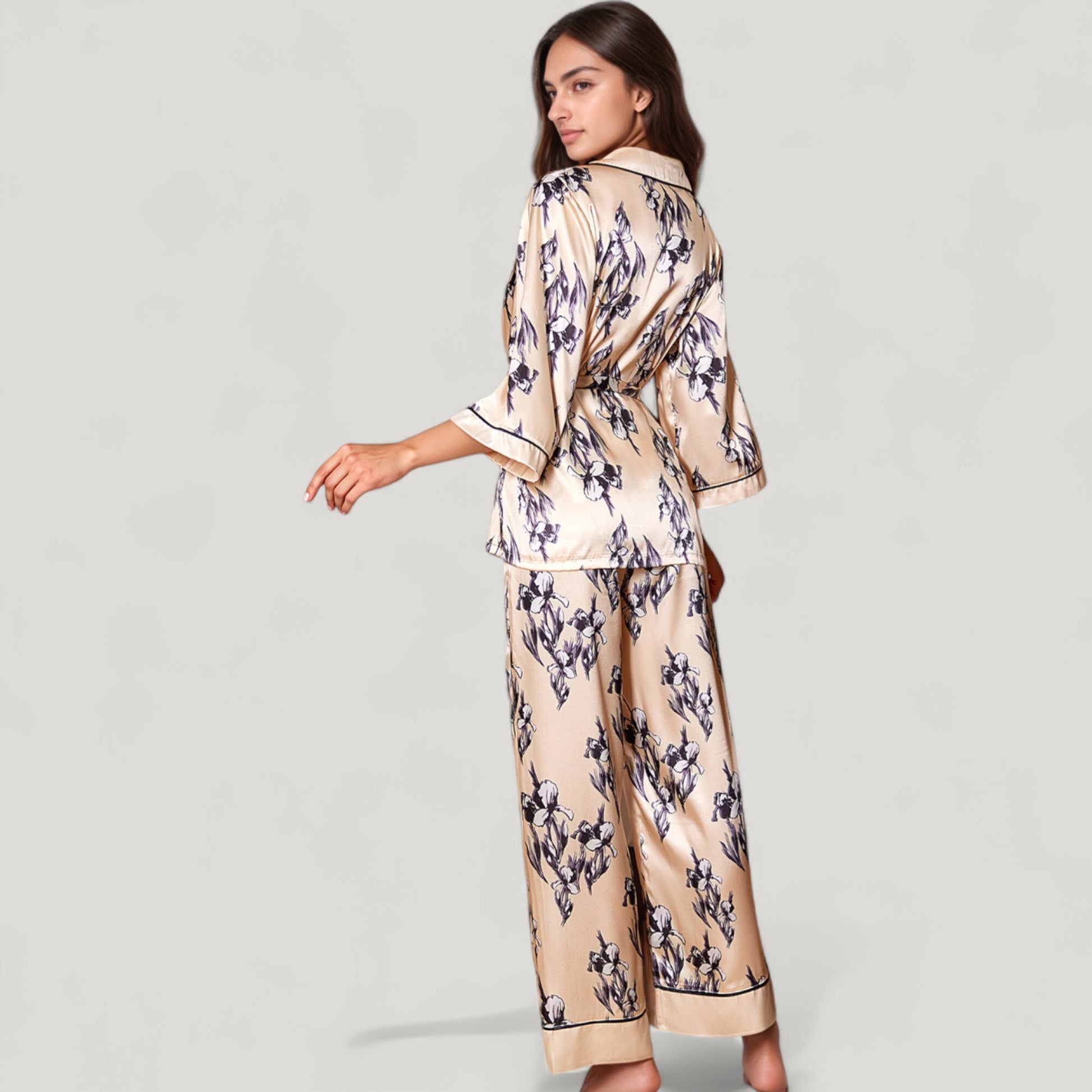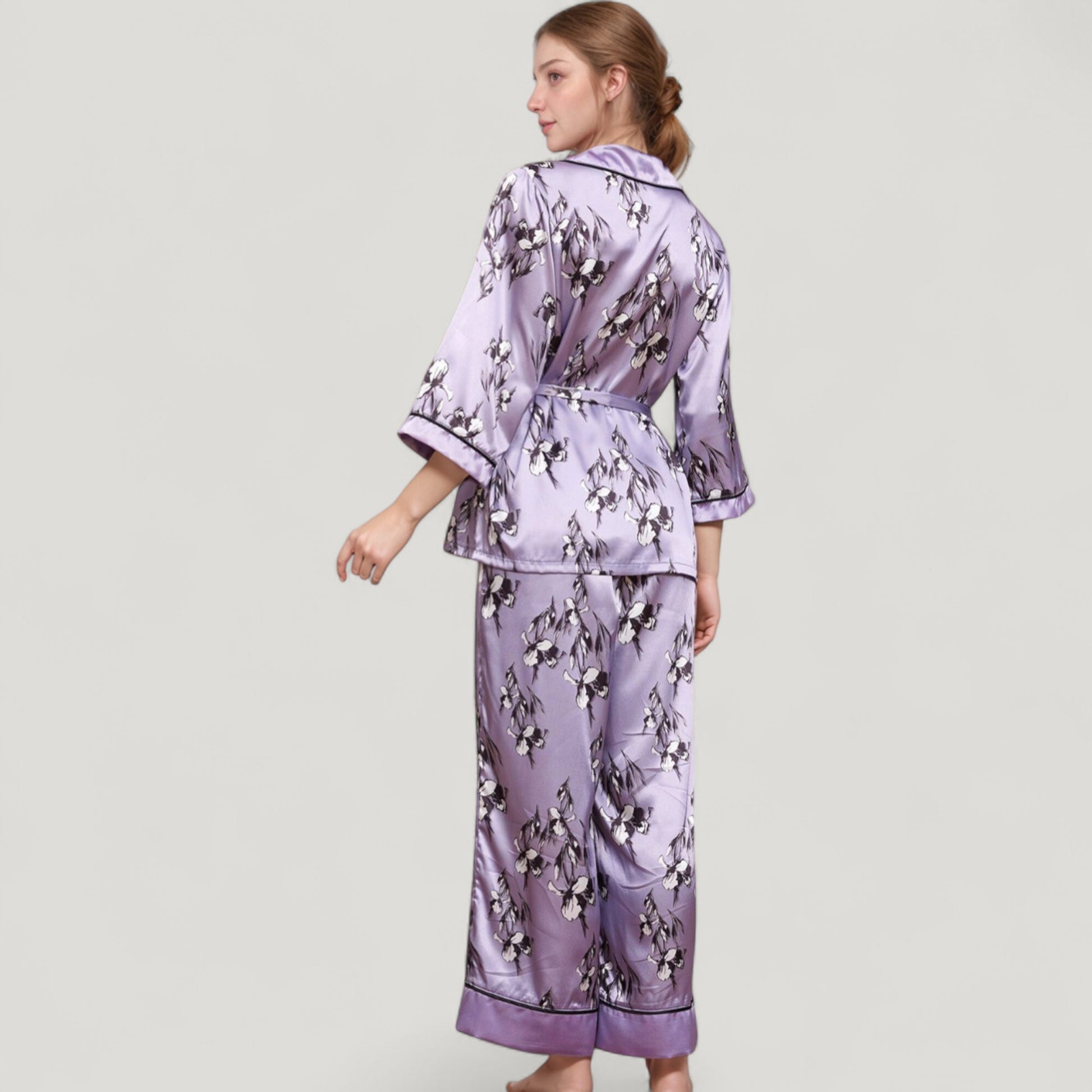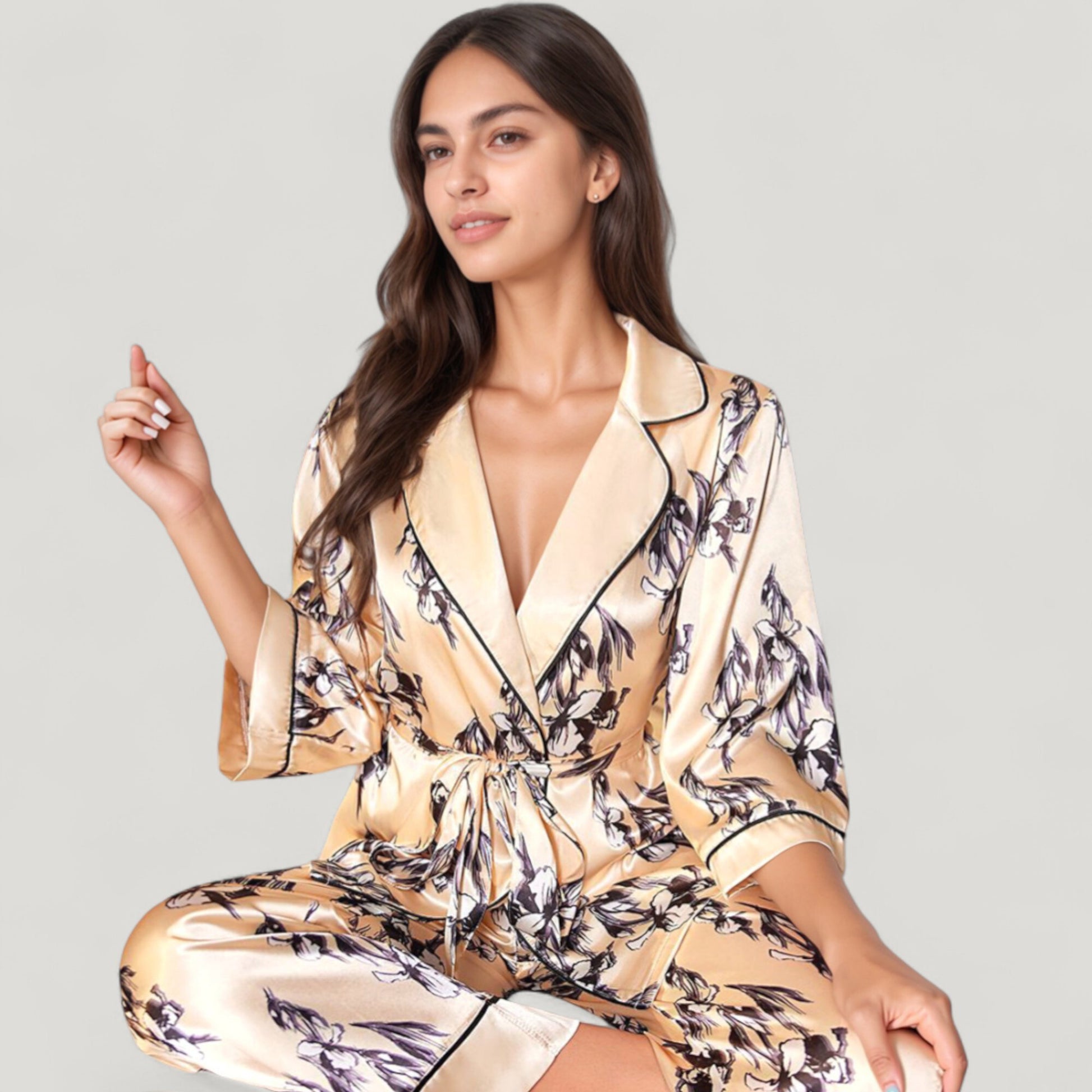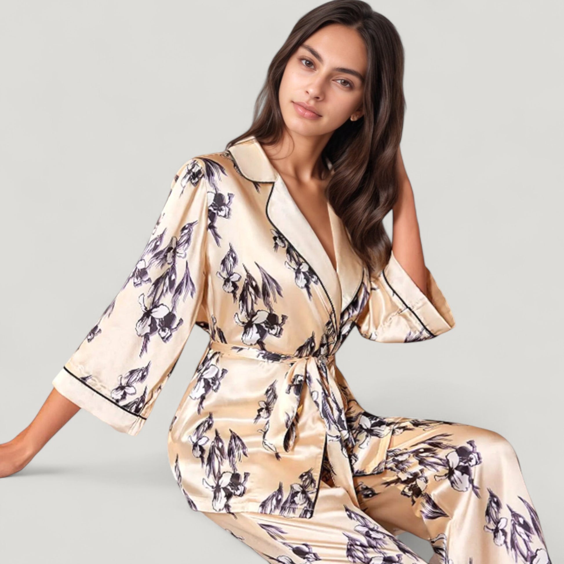 The Anna-Kaci Women's Floral Satin Pajama Set offers an elegant take on sleepwear with its silky-smooth fabric and romantic floral print. Featuring a relaxed-fit robe-style top with a wrap front, shawl collar, and self-tie waist, it combines style and comfort seamlessly. The matching wide-leg pants feature a graceful drape and piped trim hem for a polished finish. This coordinated two-piece set brings a touch of luxury to your loungewear collection.