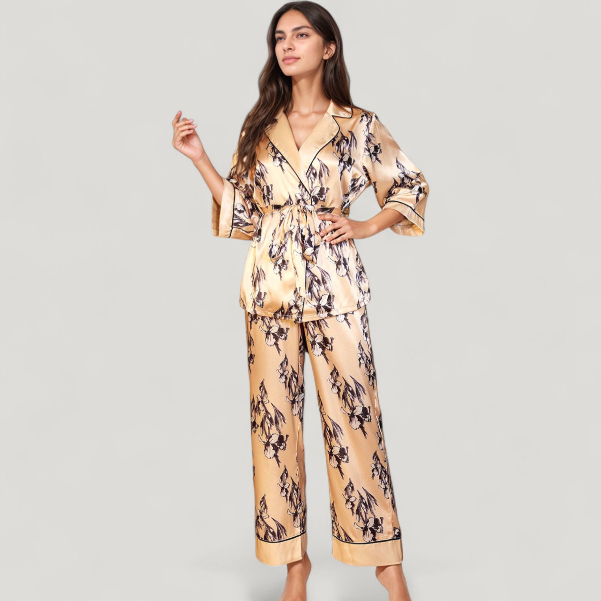 Anna-Kaci Lounge Women's Floral Satin Pajama Set with Long Sleeve Robe Top and Matching Wide Leg Pants