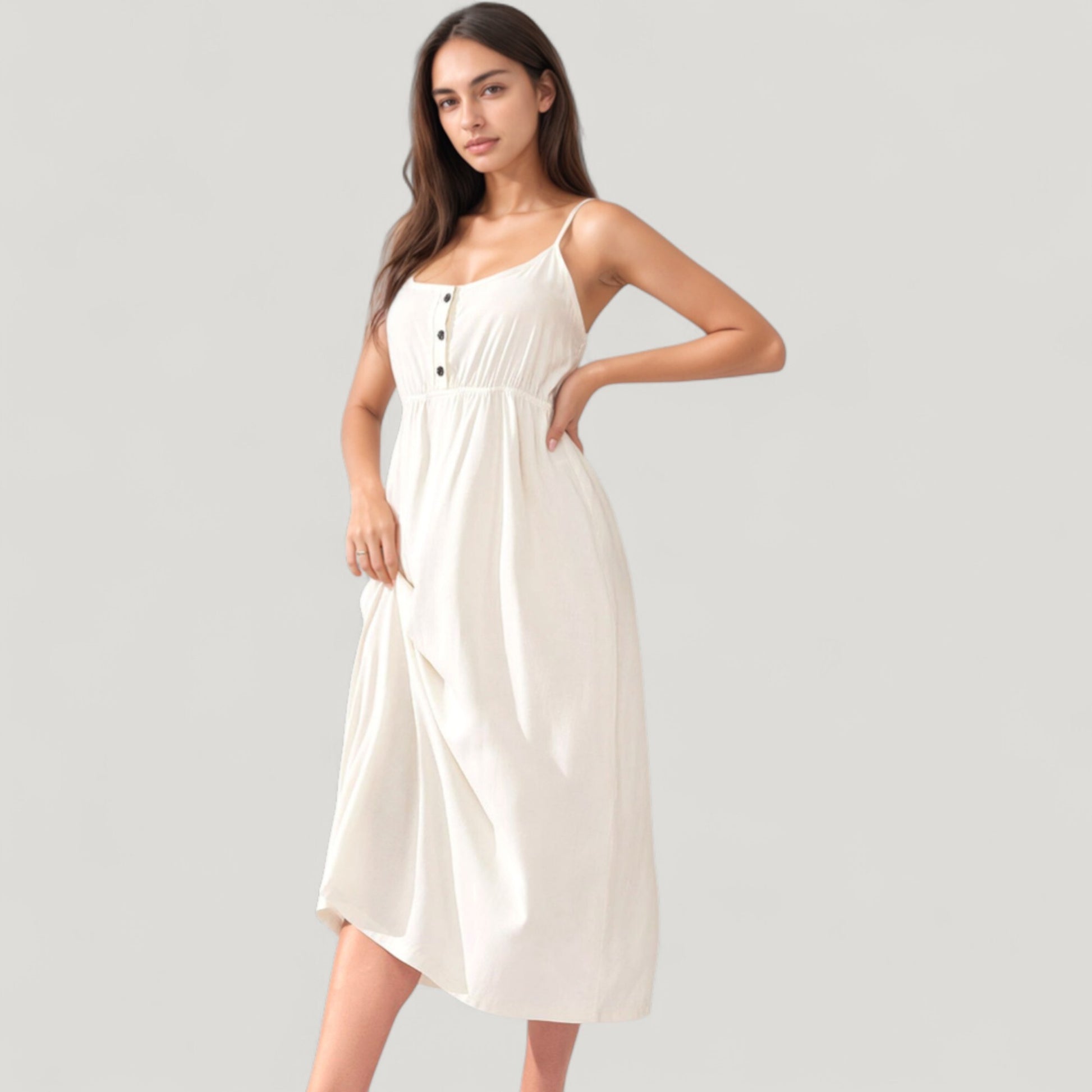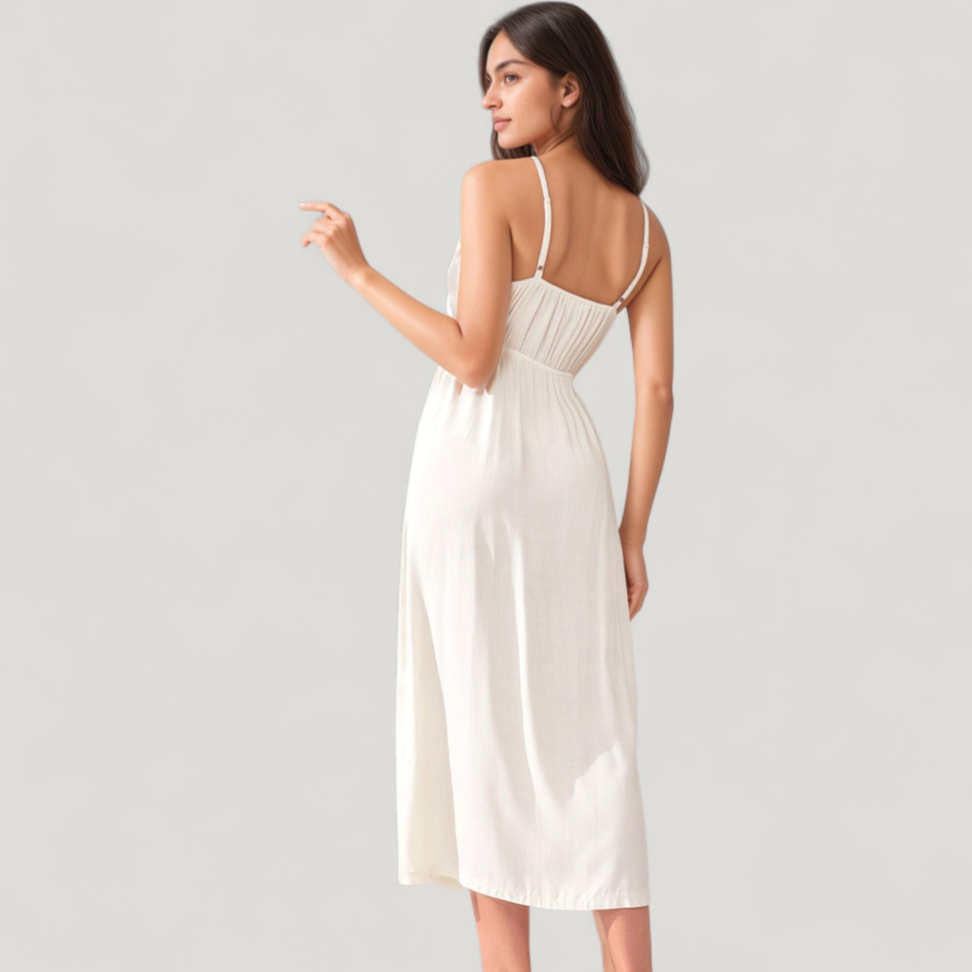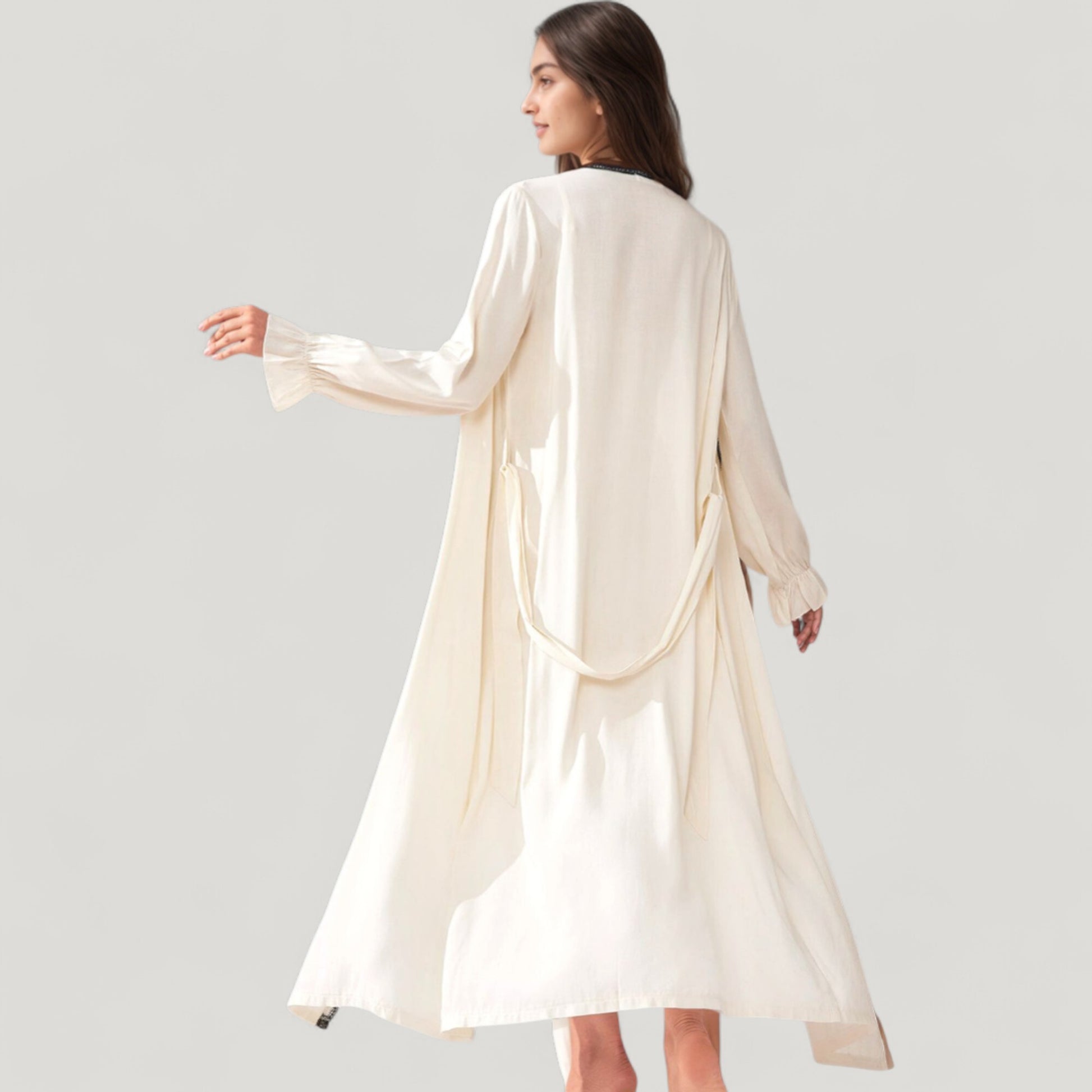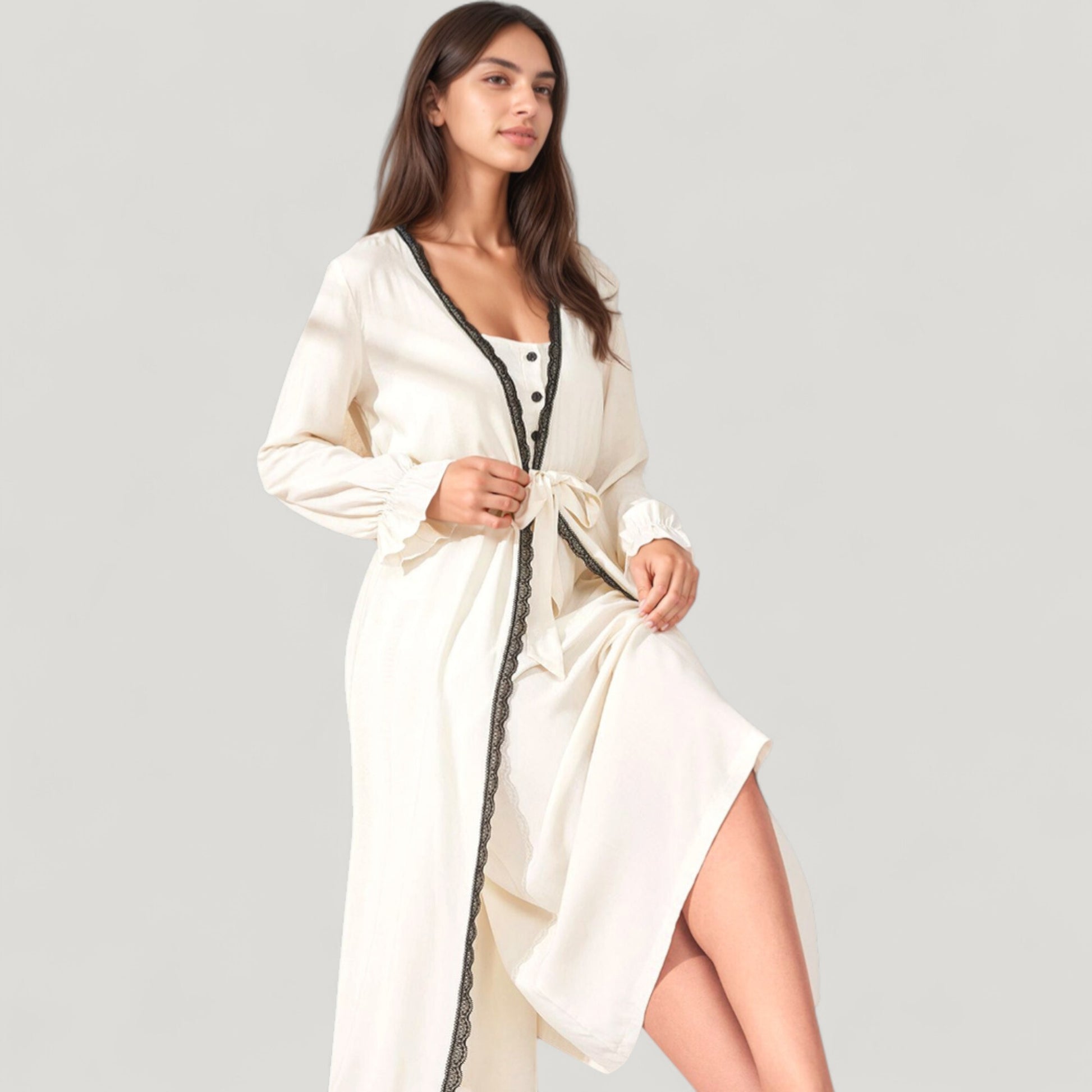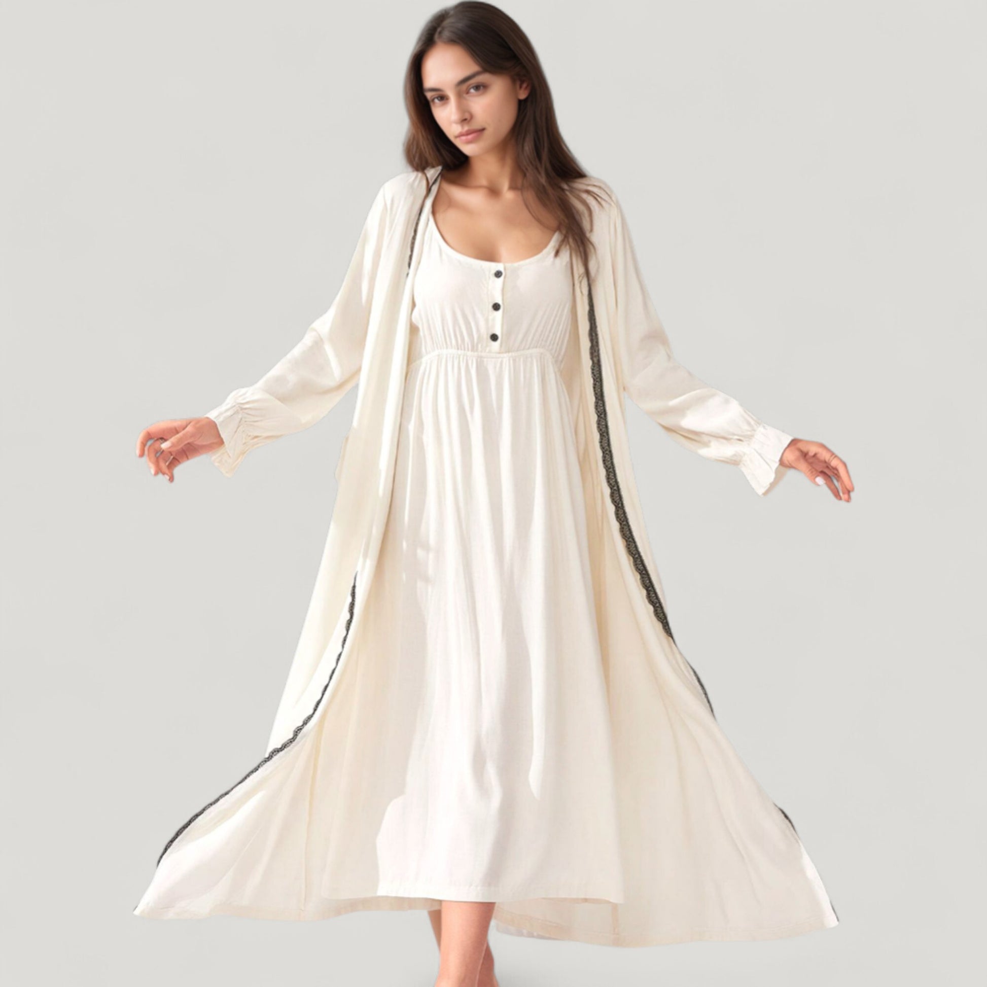 The Anna-Kaci Women's Two-Piece Lounge Nightdress Set includes a flowy scoop neck midi dress and a coordinating longline robe for an effortlessly elegant look. The woven fabric drapes softly, offering lightweight comfort with subtle texture. The dress features a flattering empire waist and front button detail, while the open-front robe includes gathered cuffs and contrast lace trim for a romantic finish. Ideal for relaxed days, this set balances style and comfort with timeless appeal.