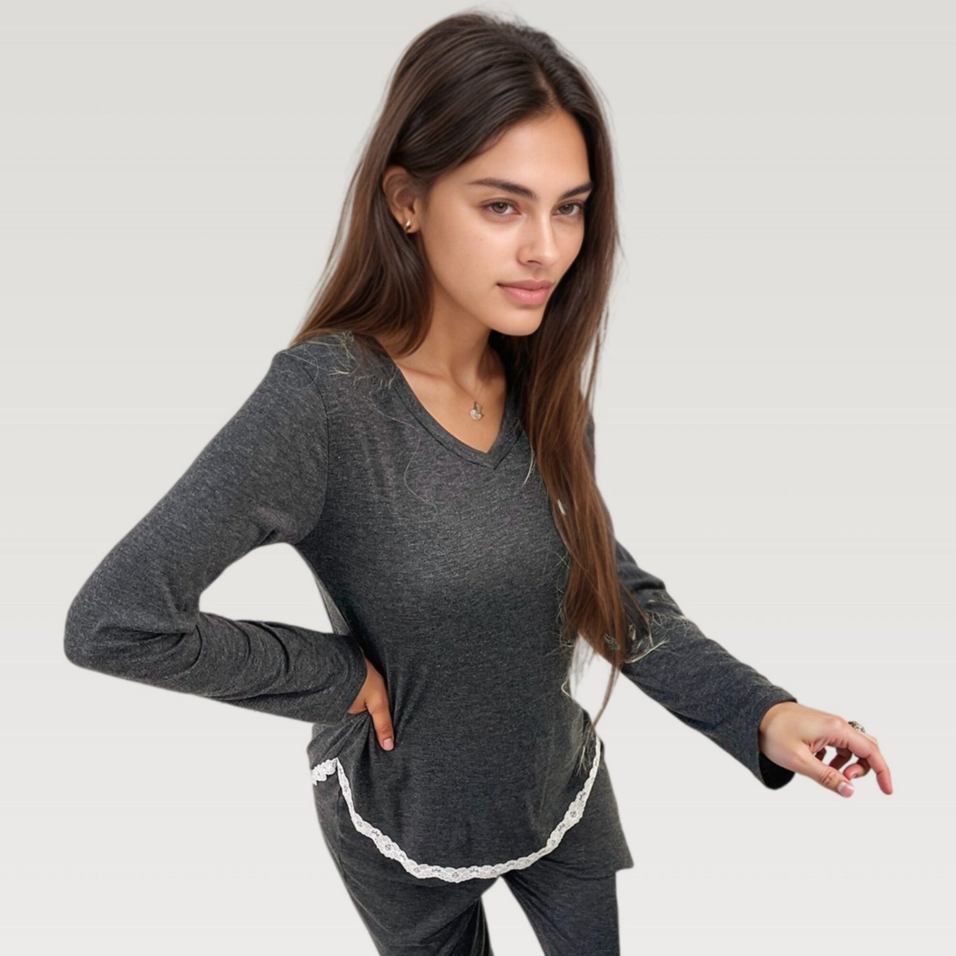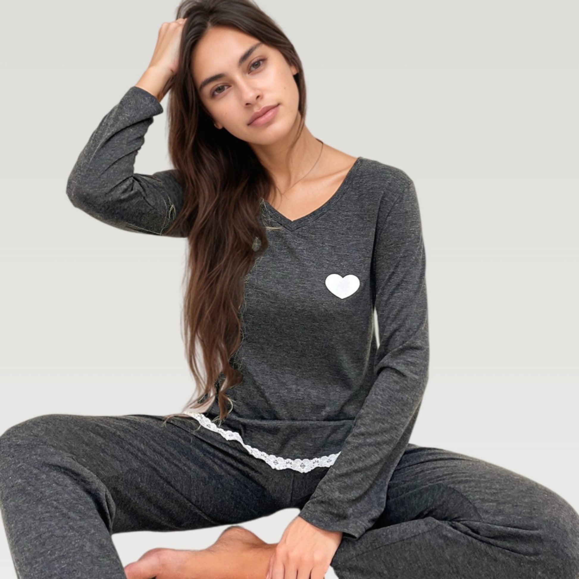 Anna-Kaci Lounge Women's Long Sleeve Pajama Set with Lace Trim and Heart Detail