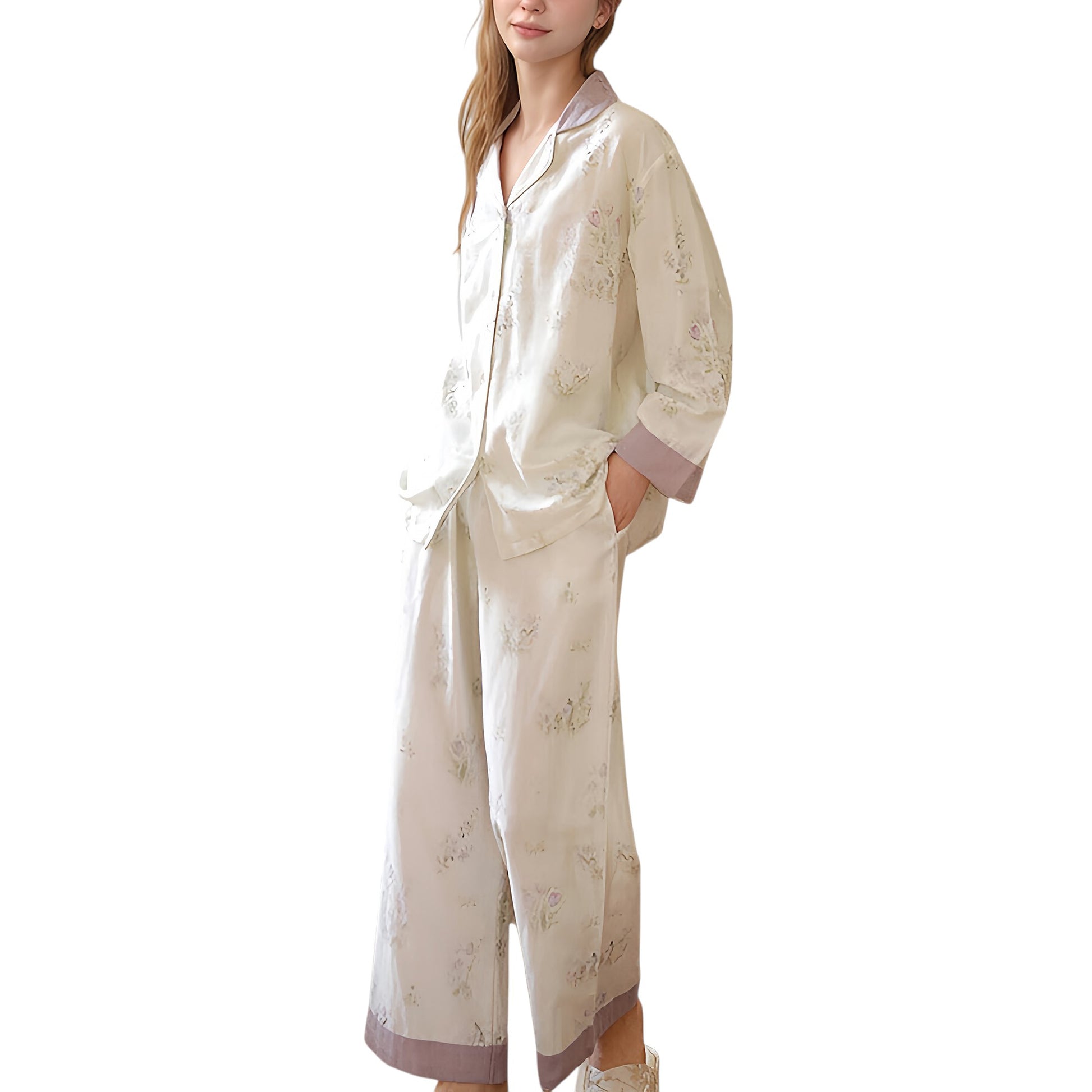 The Anna-Kaci Women's Two-Piece Pajama Set features a delicate floral print and contrast trim for an elevated take on classic loungewear. Made from a soft woven fabric, this set includes a relaxed button-down top and wide-leg pants with a comfy fit. The collar, cuffs, and pant hems are trimmed in a complementary shade, giving the set a refined finish. Perfect for relaxing in effortless style and comfort.