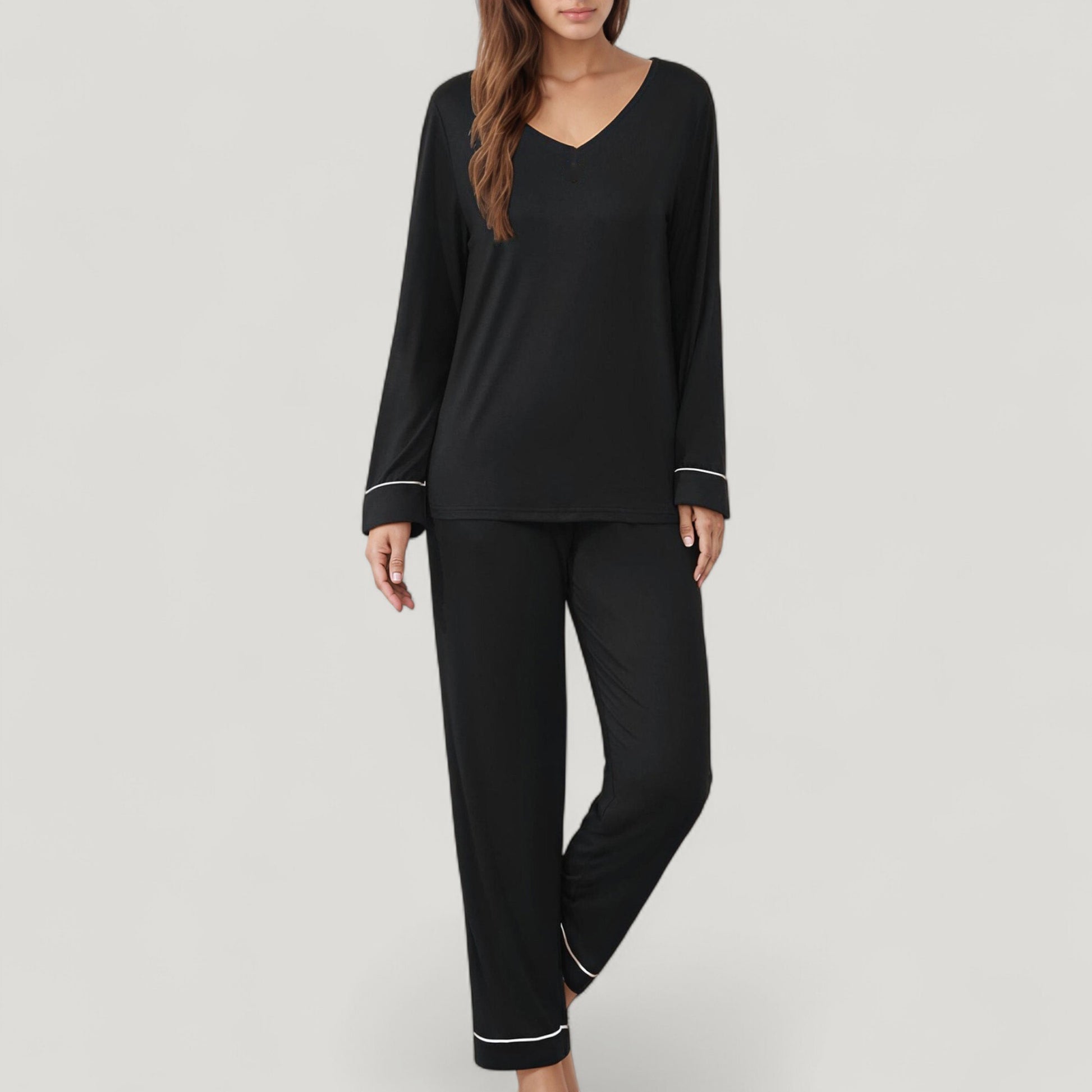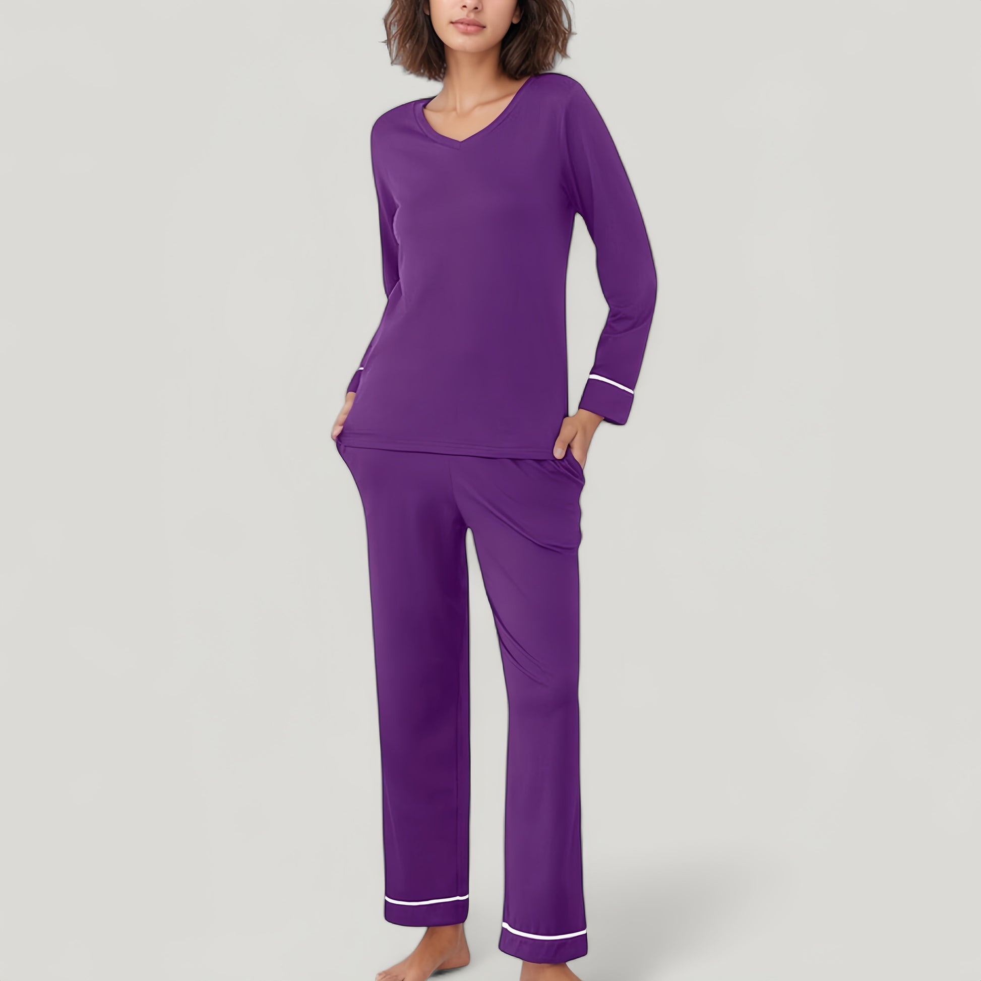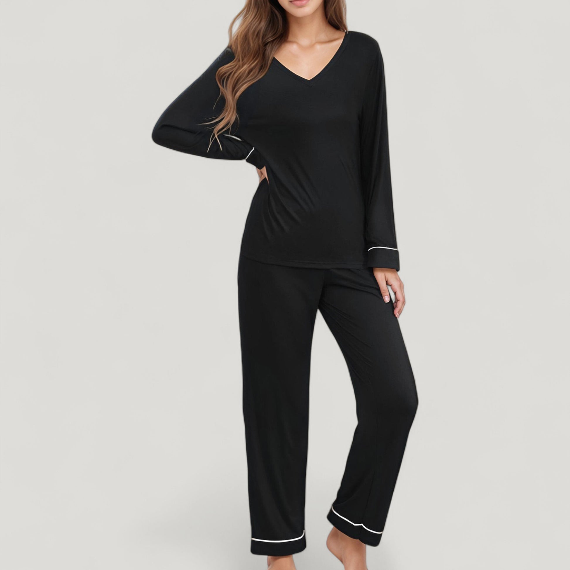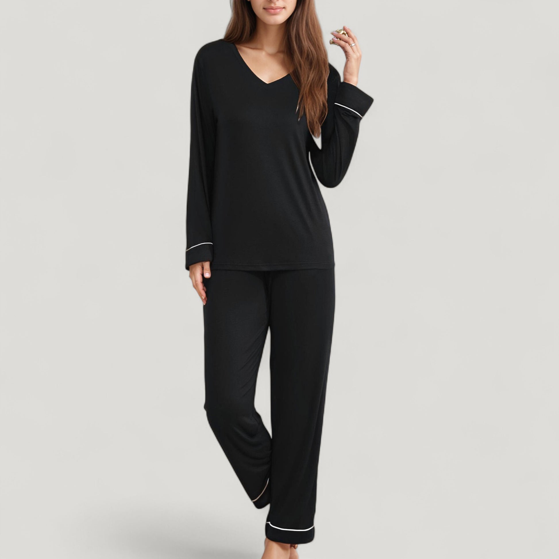 The Anna-Kaci Women's Contrast Trim Pajama Set delivers timeless comfort with a modern touch. Featuring a long sleeve V-neck top and relaxed straight-leg pants, both accented with crisp contrast piping, this set offers a polished look while remaining ultra-soft and breathable. Ideal for cozy evenings and laid-back mornings, it combines classic style with all-day ease.