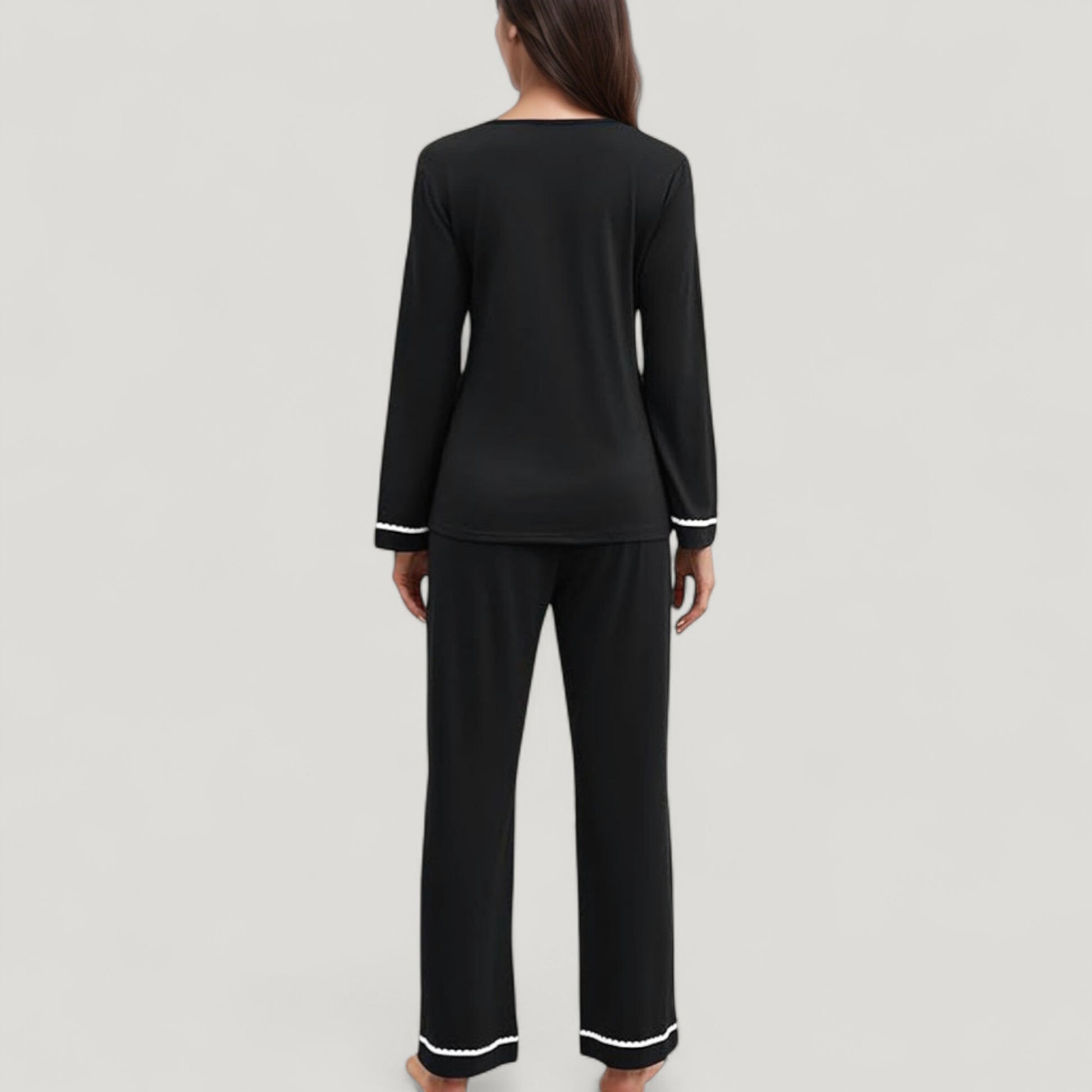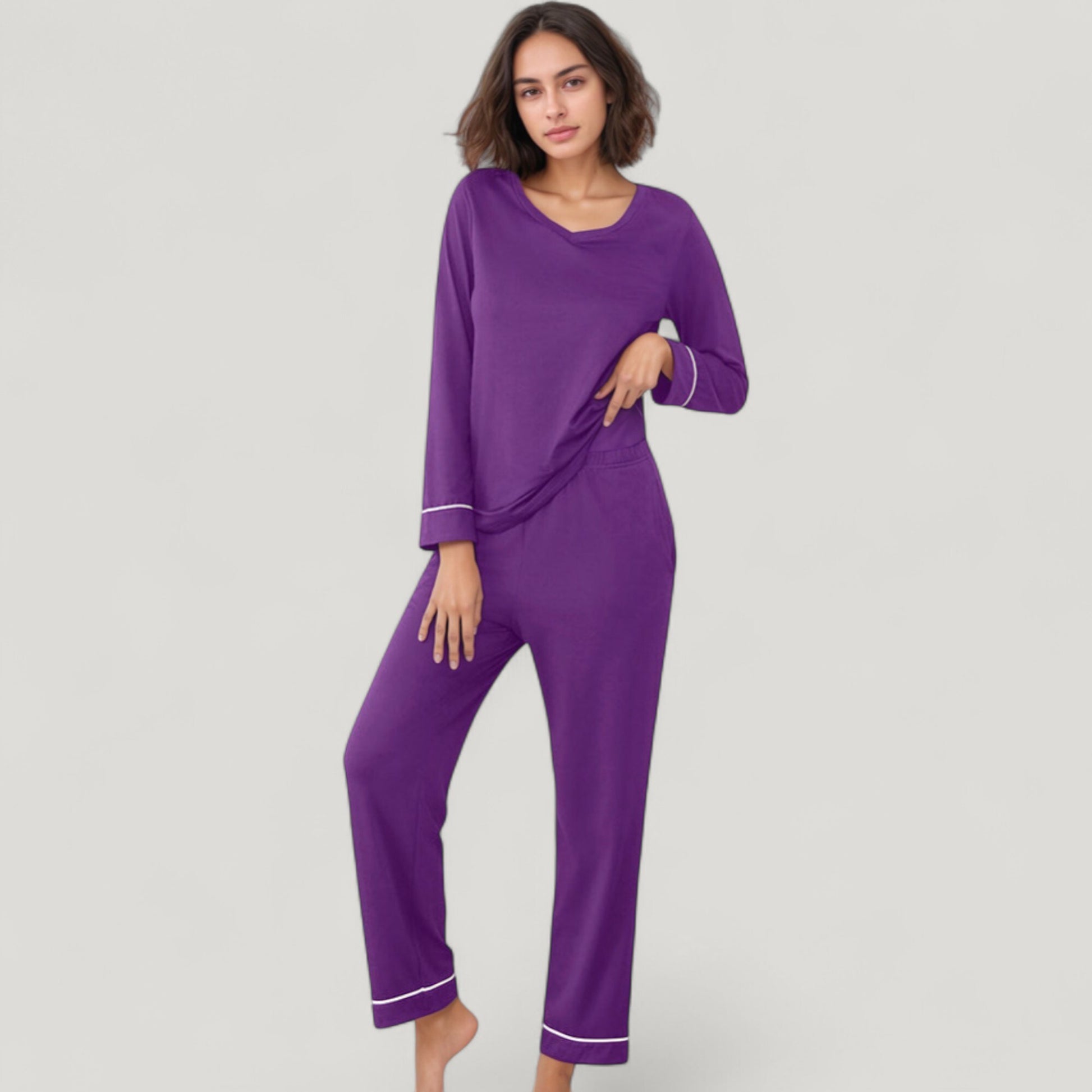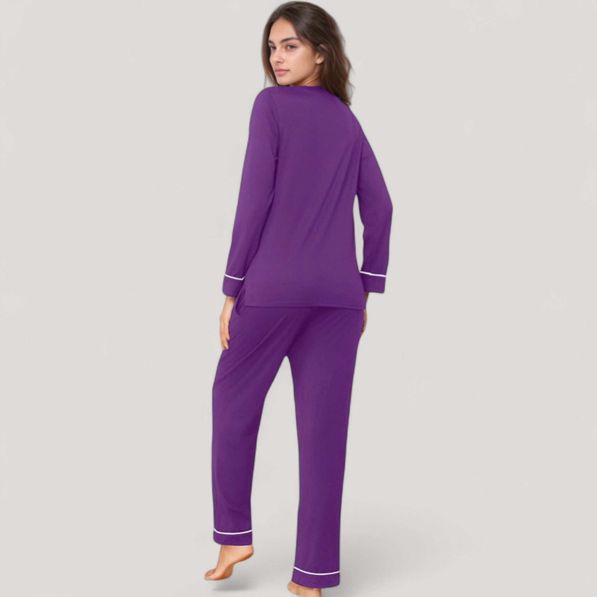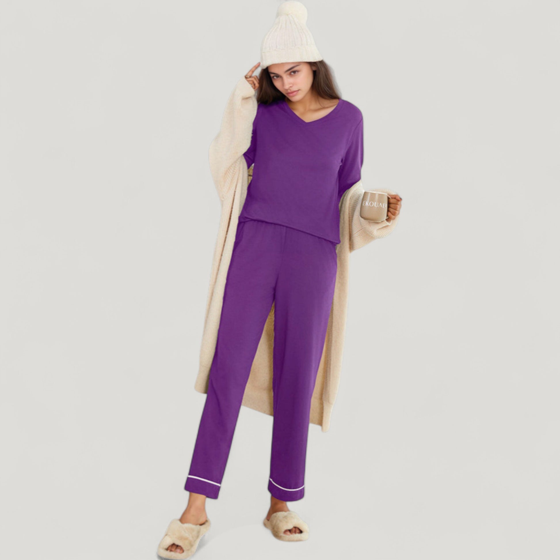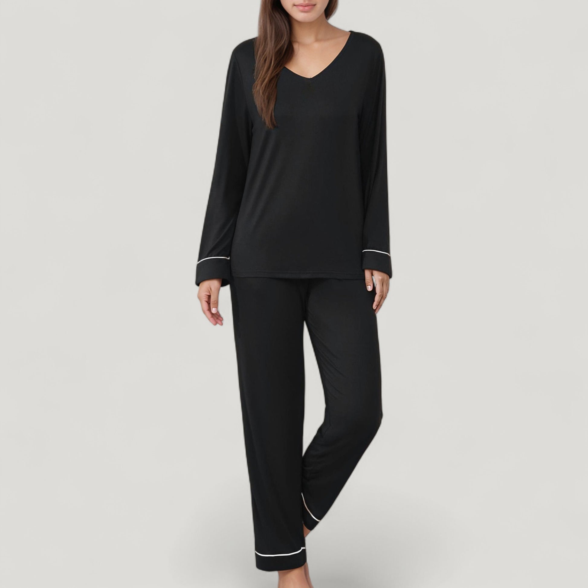 The Anna-Kaci Women's Contrast Trim Pajama Set delivers timeless comfort with a modern touch. Featuring a long sleeve V-neck top and relaxed straight-leg pants, both accented with crisp contrast piping, this set offers a polished look while remaining ultra-soft and breathable. Ideal for cozy evenings and laid-back mornings, it combines classic style with all-day ease.