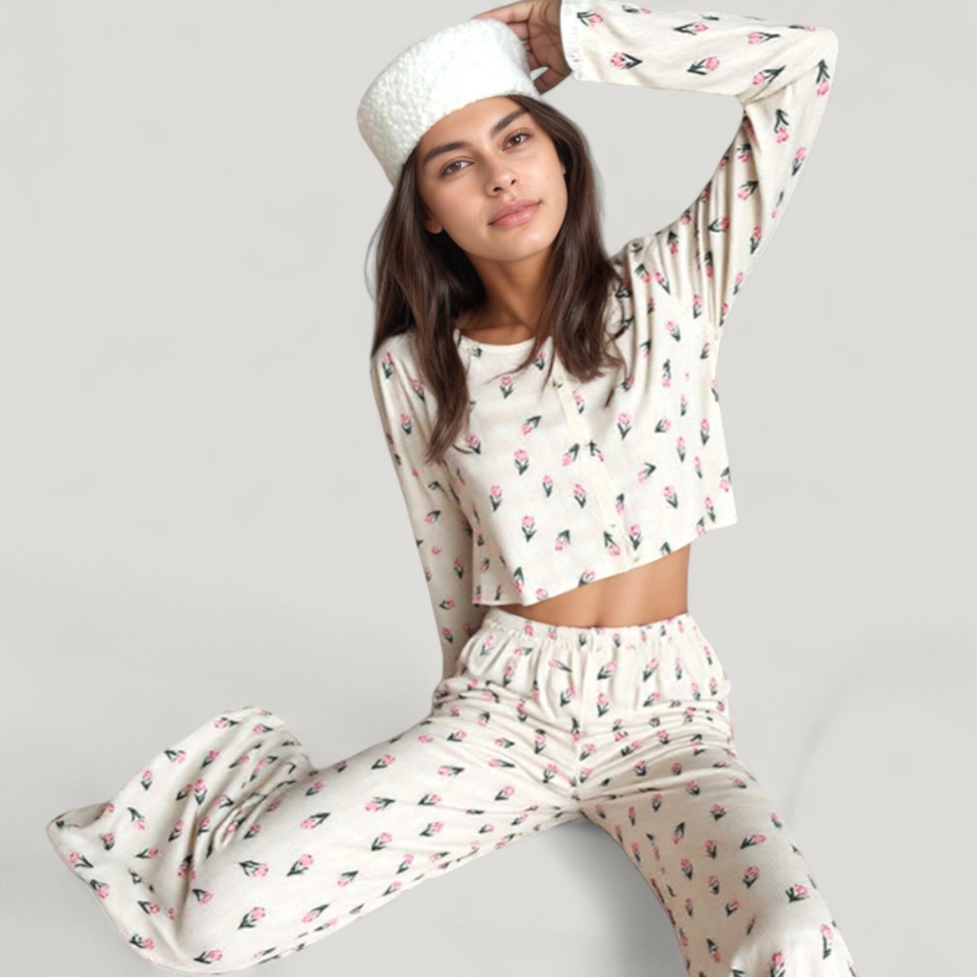 Anna-Kaci Lounge Women's Floral Print Pajama Set with Cropped Button Front Long Sleeve Top and Elastic Waist Wide Leg Pants