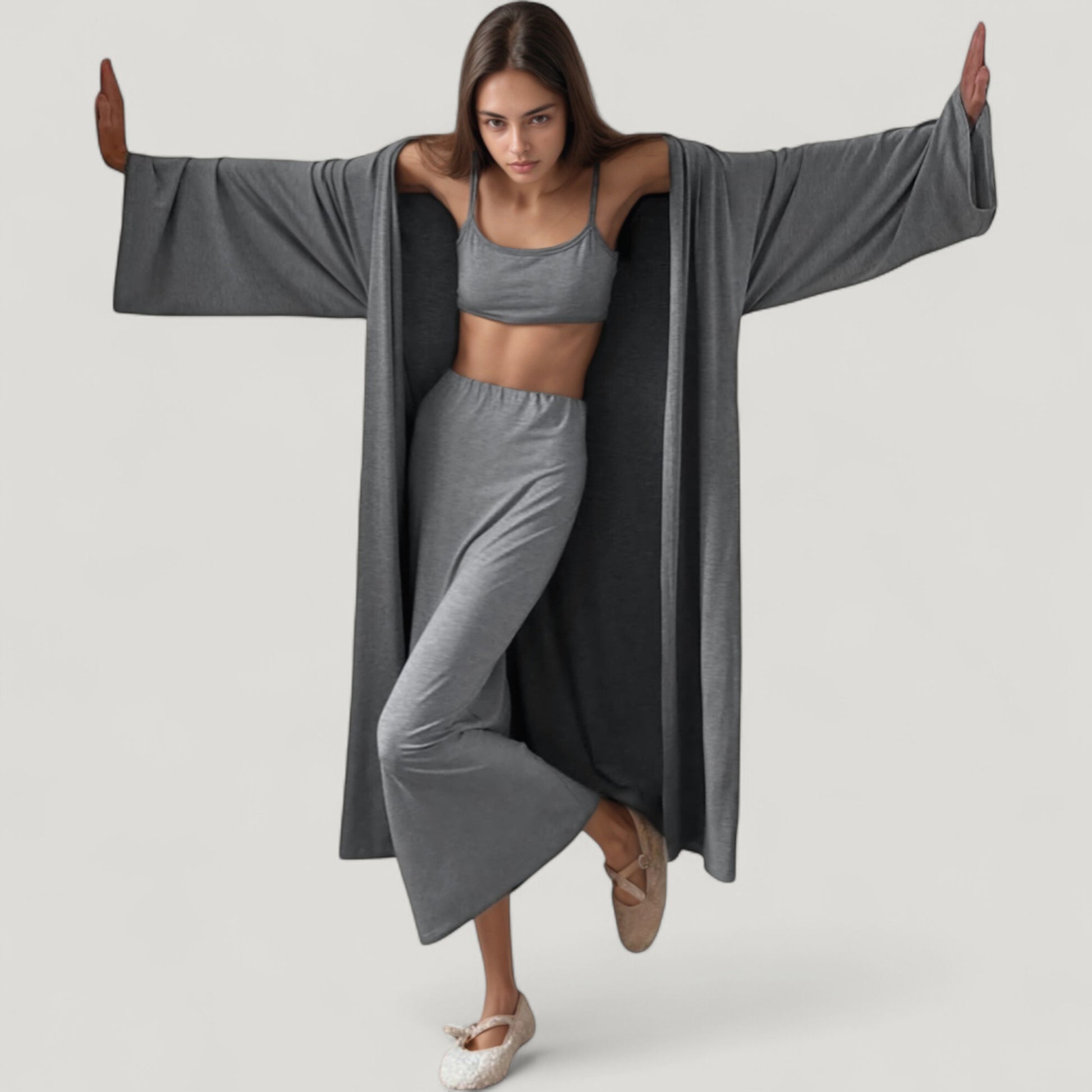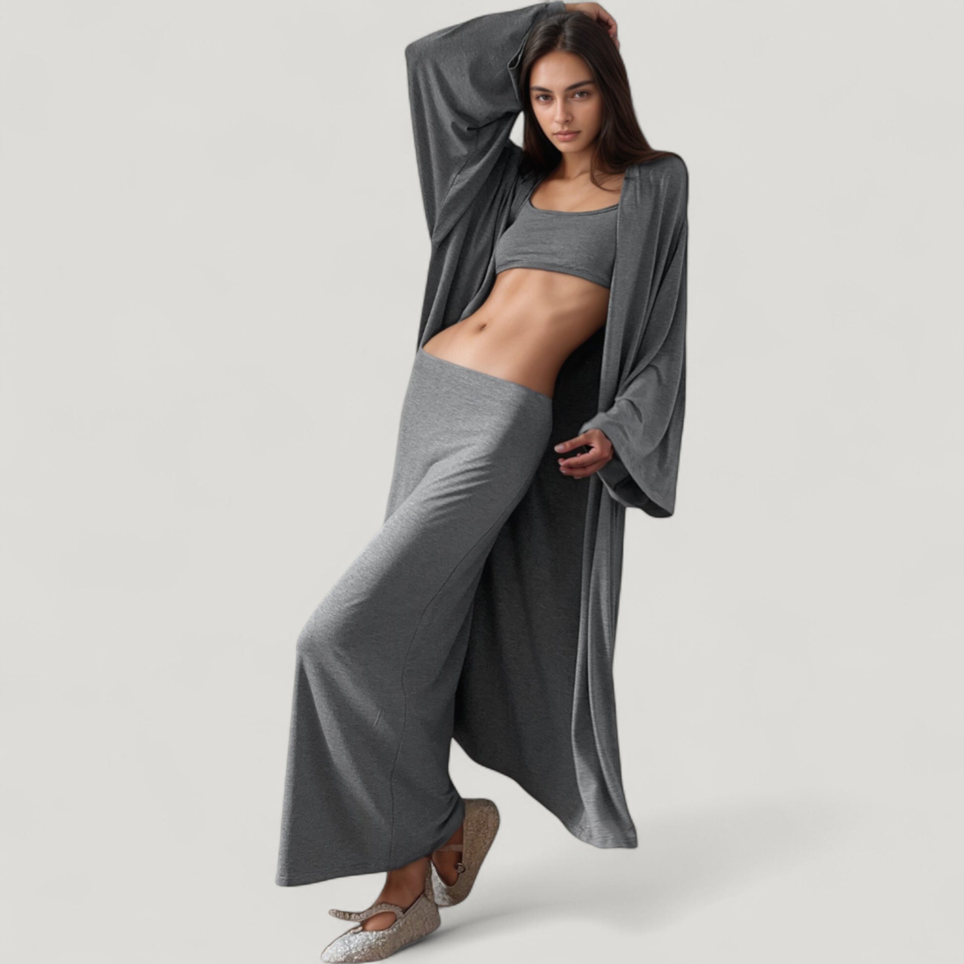 Anna-Kaci Lounge Women's 3-Piece Pajama Set with Longline Drape Robe Camisole Crop Top and Wide Leg Pants