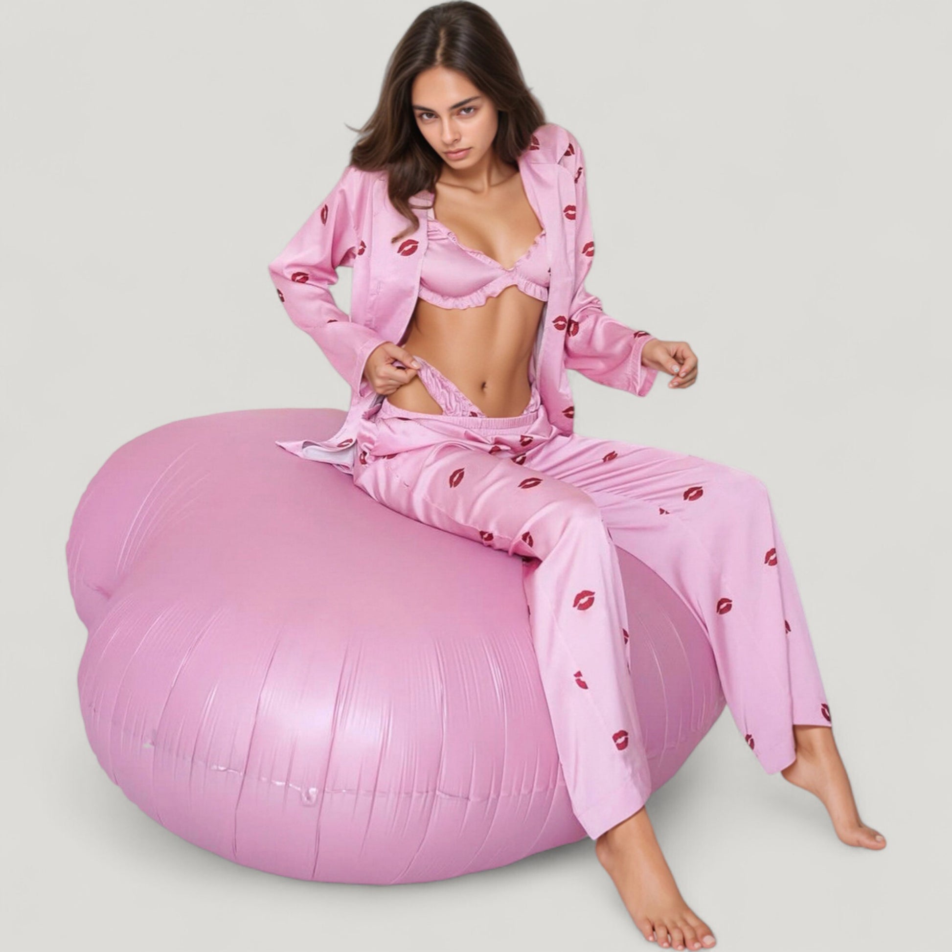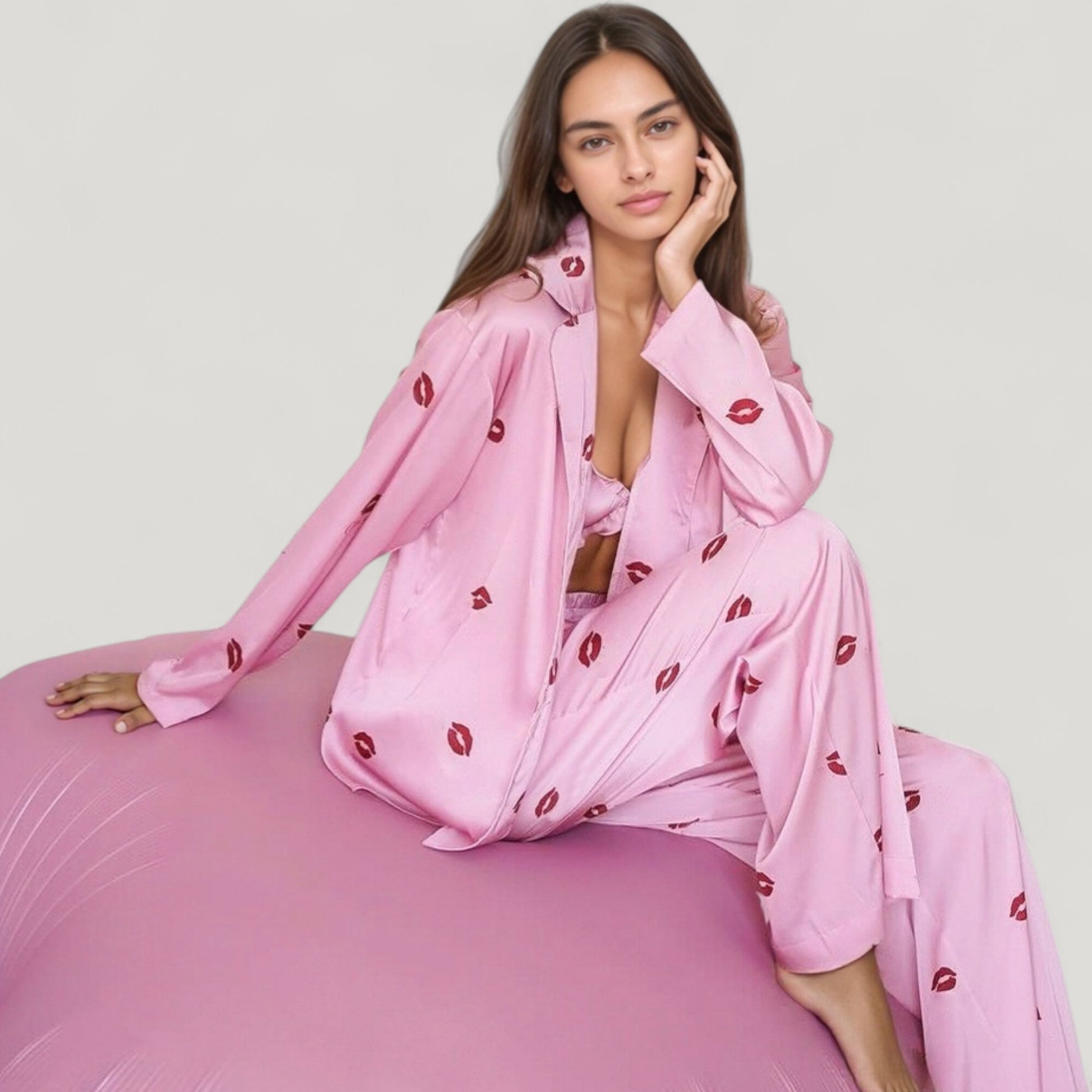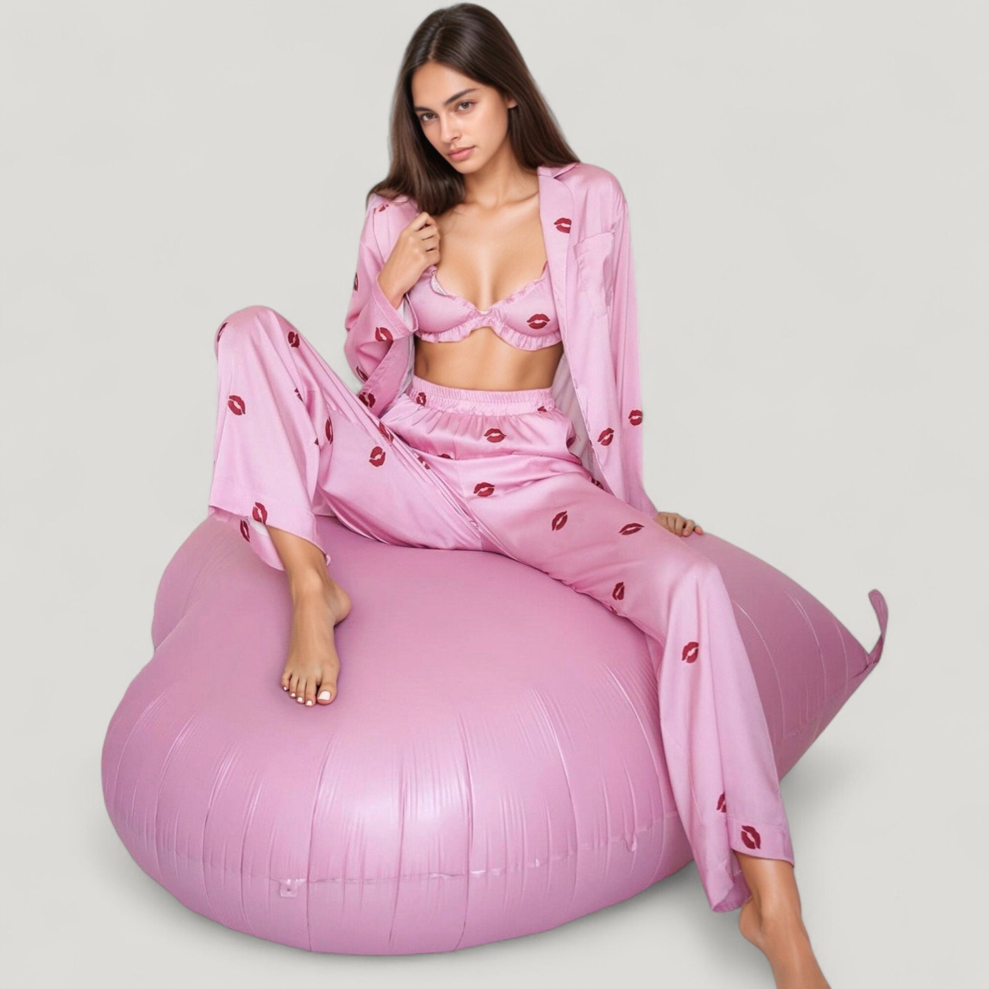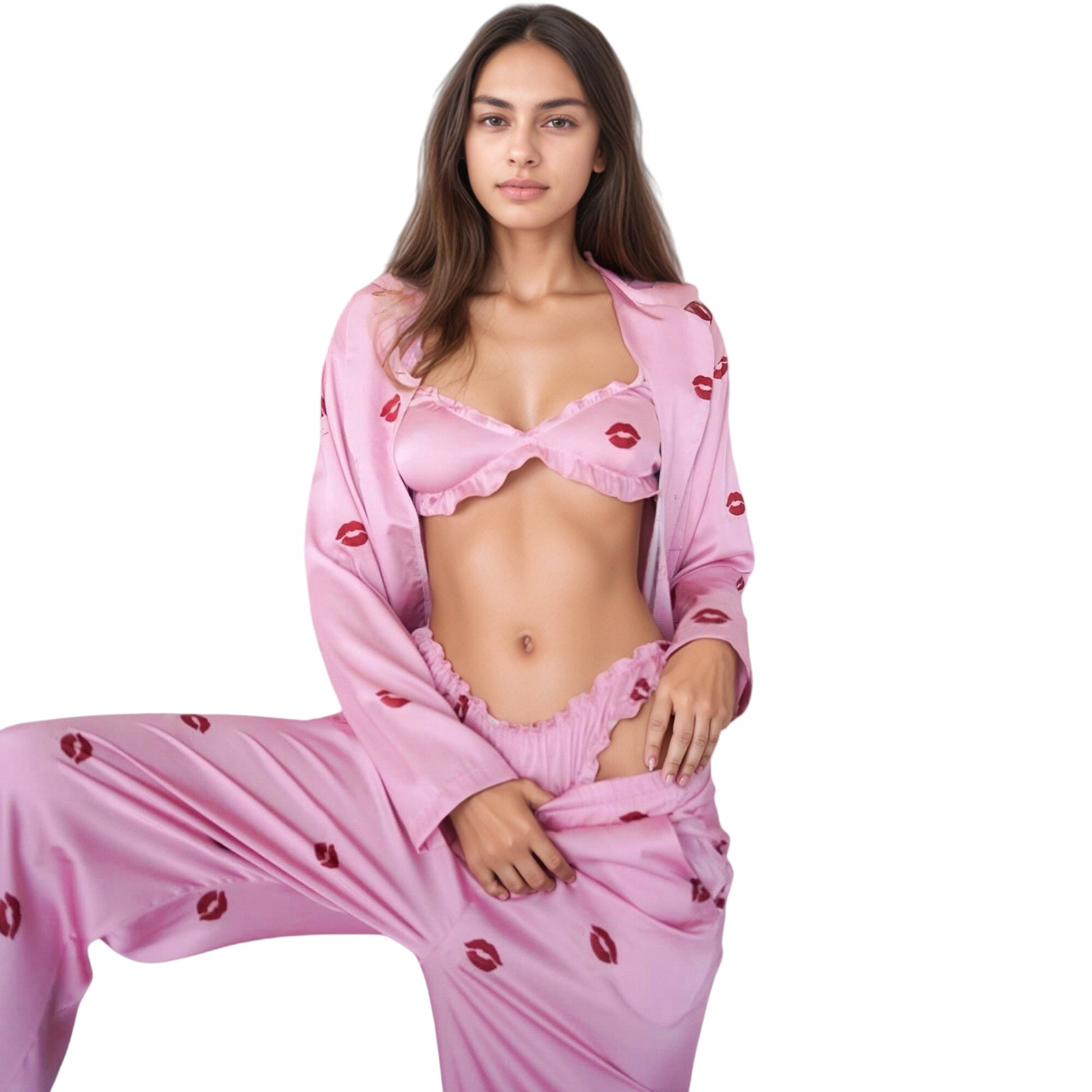 The Anna-Kaci Women's 3-Piece Pajama Set brings playful charm and comfort with a matching bra top, drawstring pants, and open robe. Featuring a bold allover lip print and feminine ruffle trim, this woven set is designed to stand out while offering relaxed comfort. Lightweight and breathable, it¡¯s perfect for mixing, matching, and lounging in effortless style. Create a statement even on your most laid-back days.