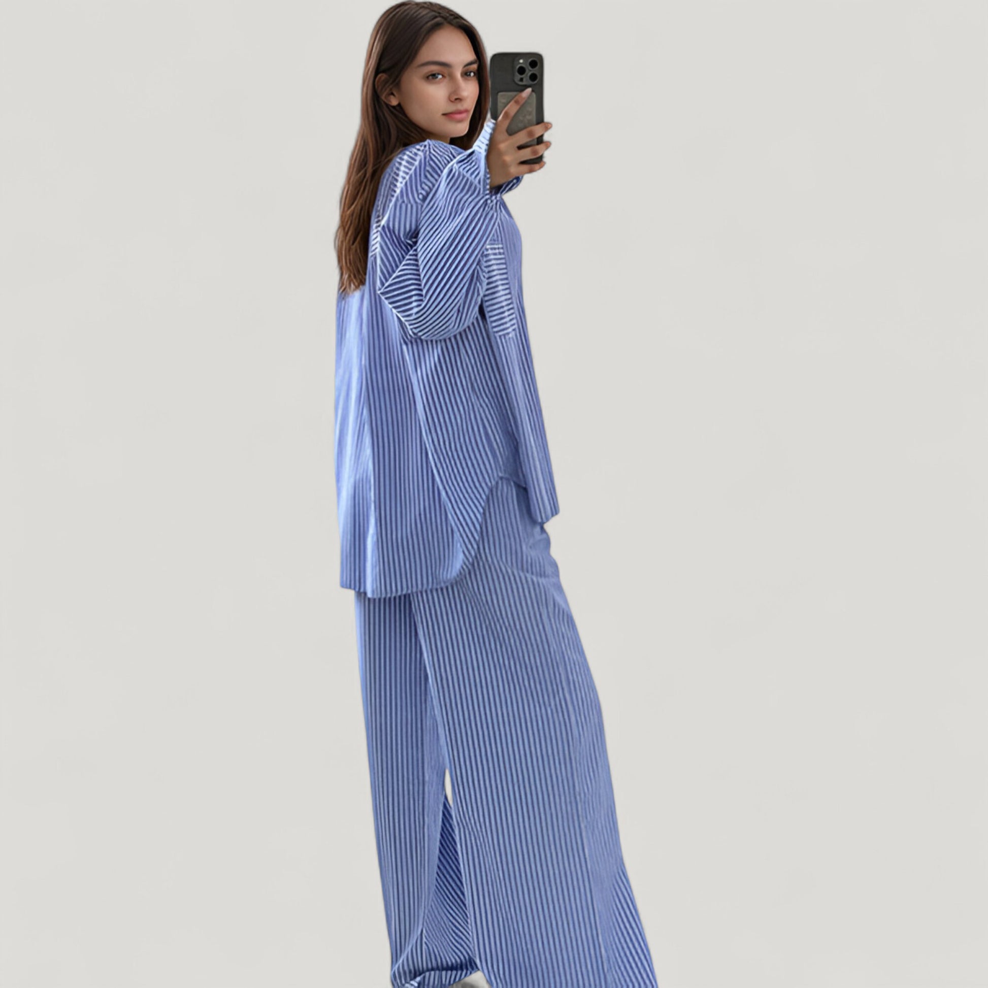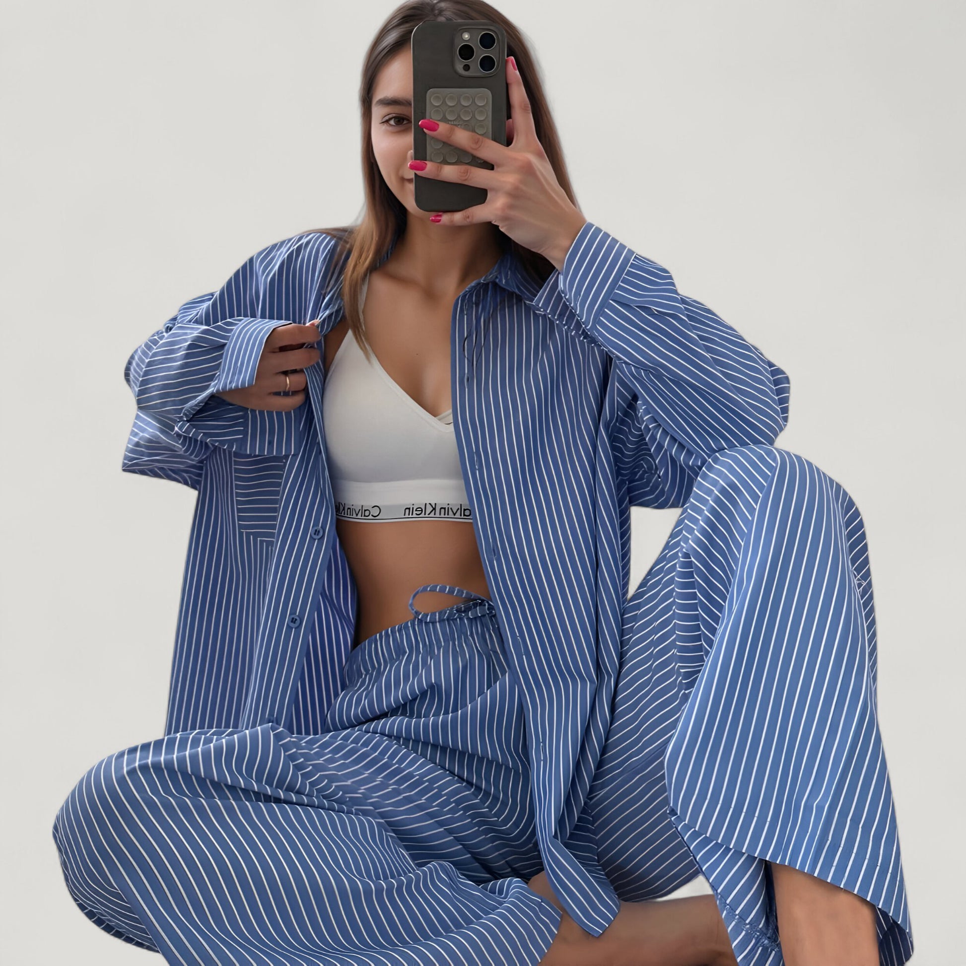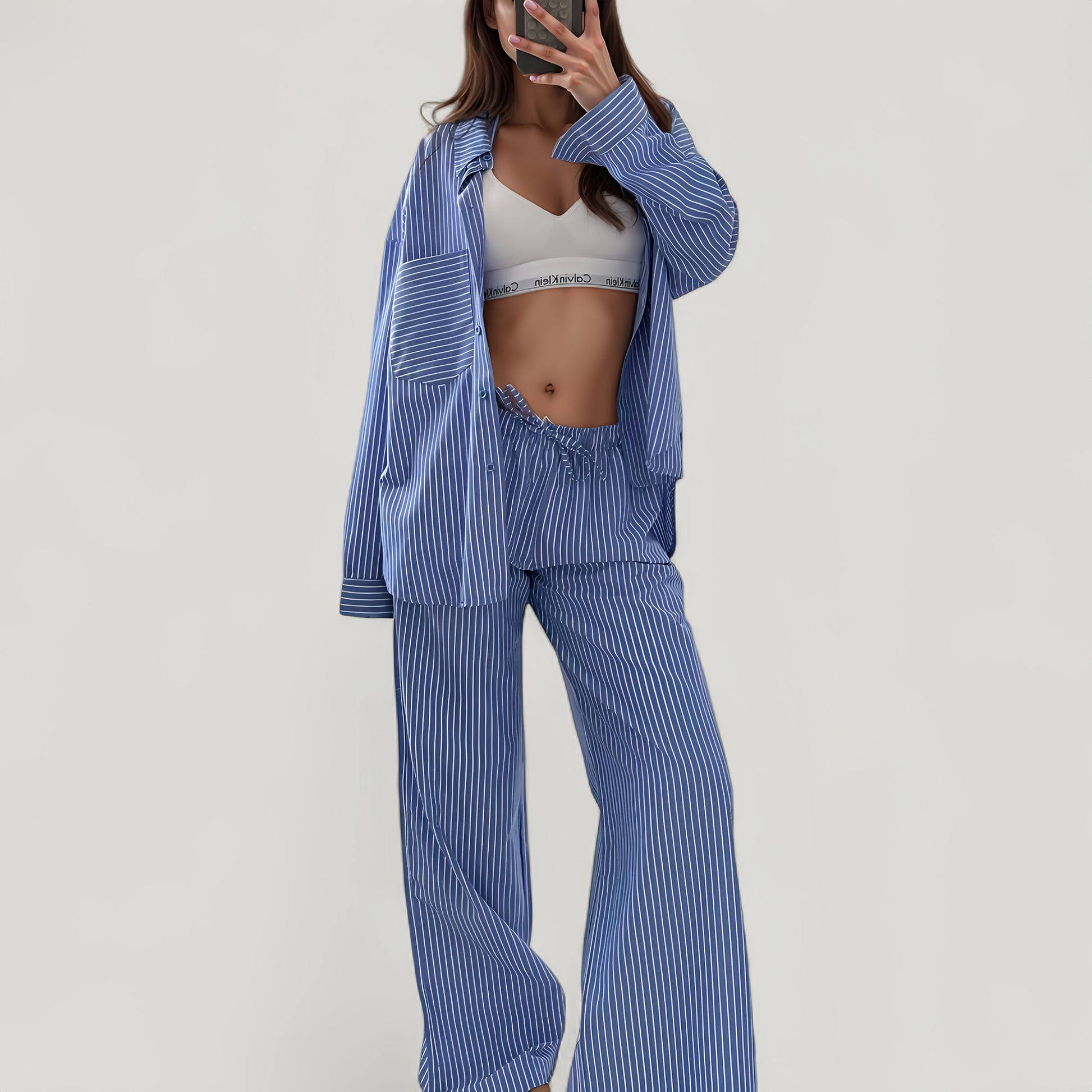 Anna-Kaci Lounge Women's Striped Button Down Pajama Set with Patch Pocket Shirt and Wide Leg Pants